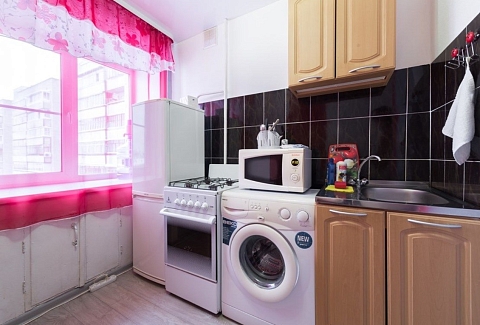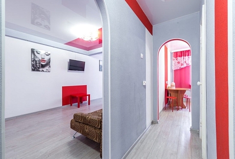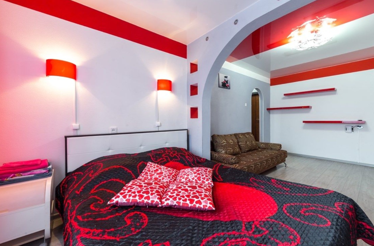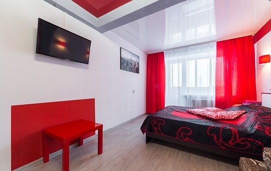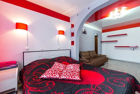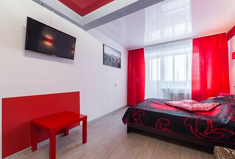 В номере: вешалка, диван, зеркало, кровать двуспальная, стол, стулья, шкаф, микроволновая печь, плита электрическая, телевизор, холодильник, чайный набор посуды, электрочайник