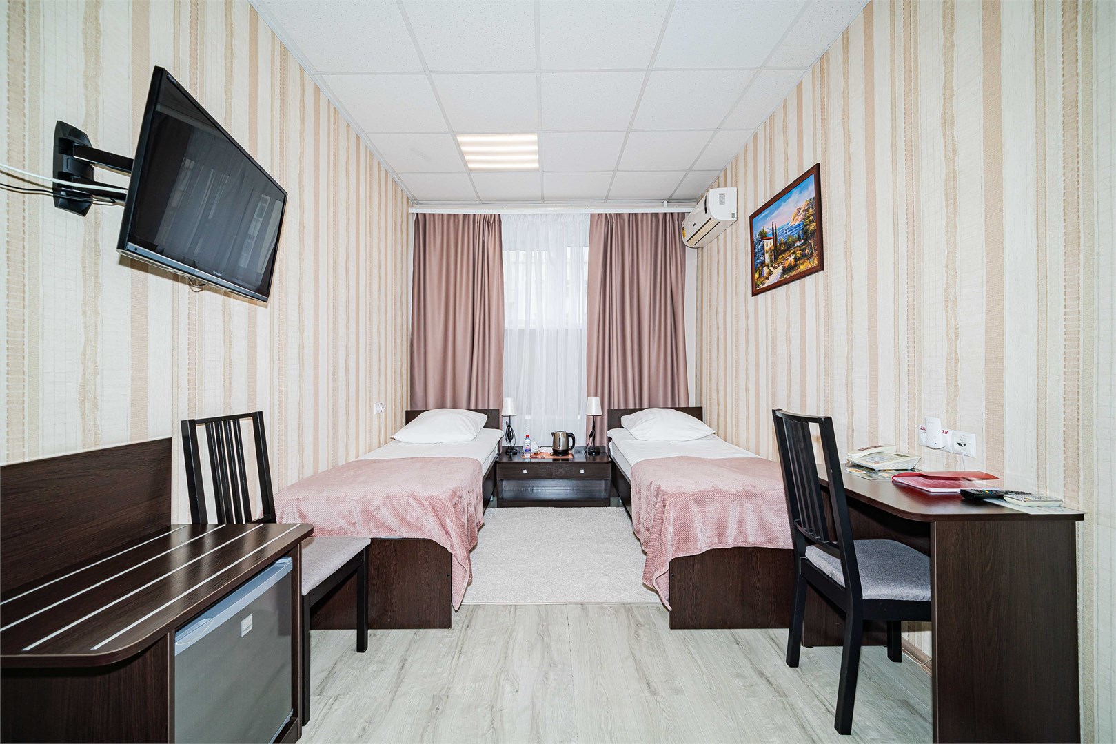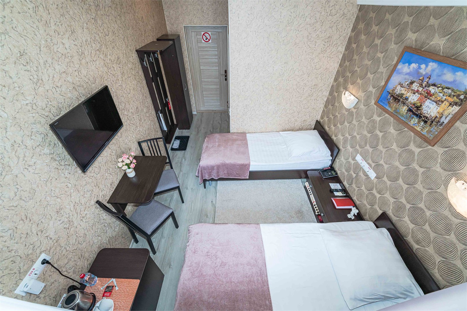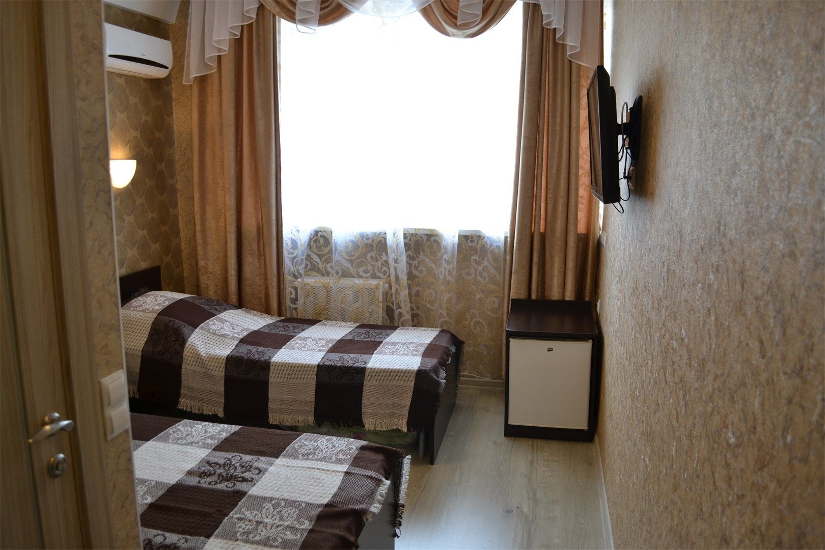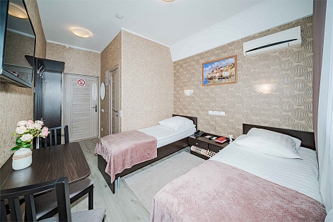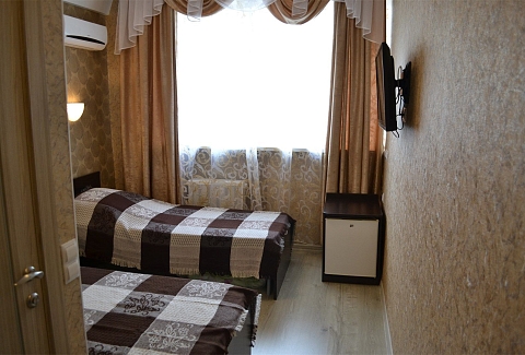 В номере: вешалка, зеркало, кровати односпальные, прикроватные тумбочки, стол, стулья, шкаф, кондиционер, мини-холодильник, набор посуды, сейф, телевизор, телефон, электрочайник