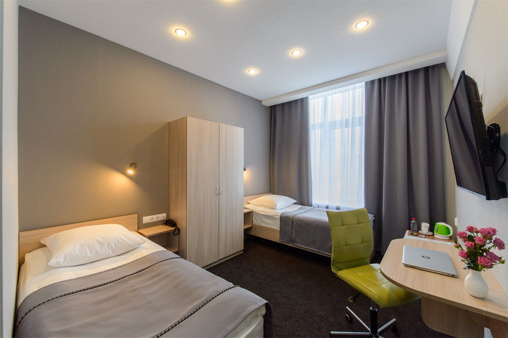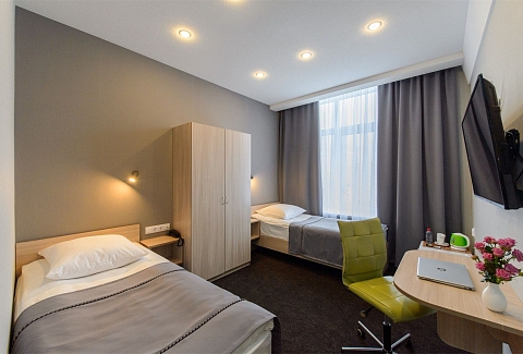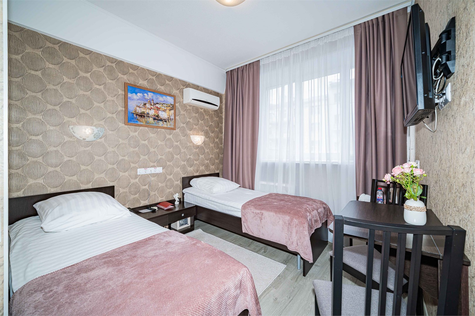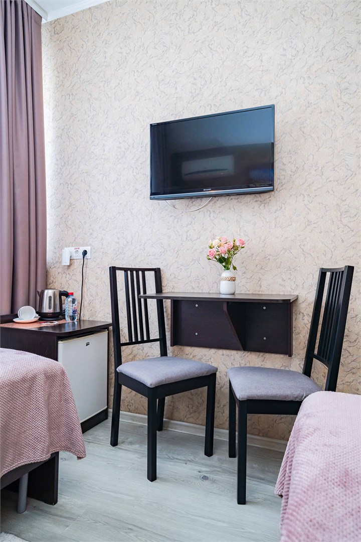 В номере: вешалка, зеркало, кровати односпальные, прикроватные тумбочки, стол, стулья, шкаф, кондиционер, мини-холодильник, набор посуды, сейф, телевизор, телефон, электрочайник