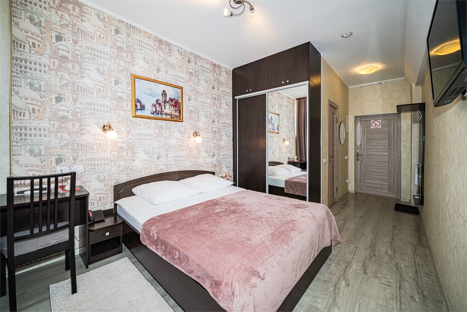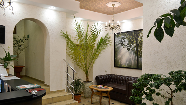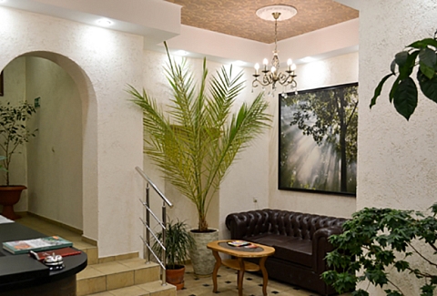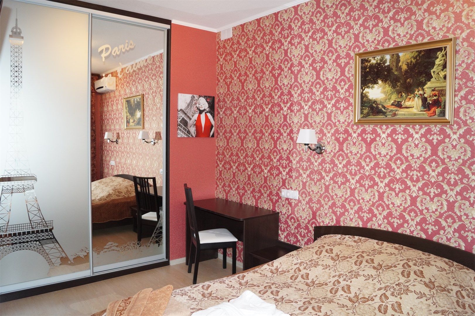 Отель находится в семиэтажном здании, расположенном на одной из главных городских магистралей. Небольшой жилой фонд рассчитанный всего лишь на 12 человек. Однако отдыхающих ожидают комфортабельные и по-домашнему уютные номера. Все номера оснащены собственной ванной комнатой и необходимой техникой: везде есть кондиционер, телевизор, фен, электрочайник. А в номерах улучшенной категории комфорта есть джакузи. При отеле работает кафе, где отдыхающим подают завтраки. В распоряжении гостей услуги бытовых служб и беспроводной интернет, доступный на всей территории отеля.