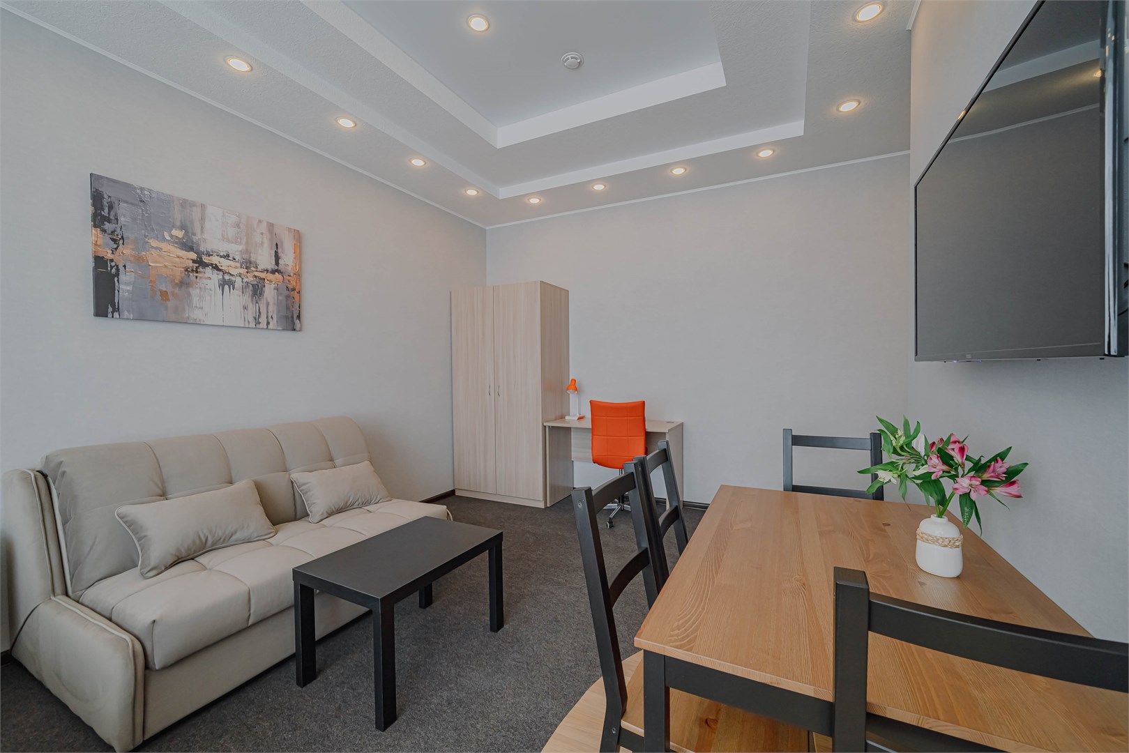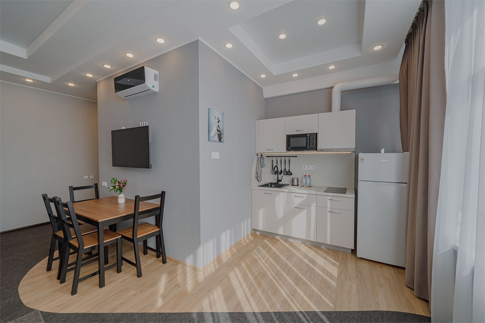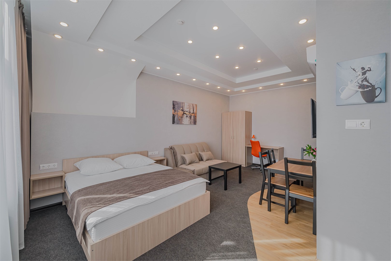 Отель находится в семиэтажном здании, расположенном на одной из главных городских магистралей. Небольшой жилой фонд рассчитанный всего лишь на 12 человек. Однако отдыхающих ожидают комфортабельные и по-домашнему уютные номера. Все номера оснащены собственной ванной комнатой и необходимой техникой: везде есть кондиционер, телевизор, фен, электрочайник. А в номерах улучшенной категории комфорта есть джакузи. При отеле работает кафе, где отдыхающим подают завтраки. В распоряжении гостей услуги бытовых служб и беспроводной интернет, доступный на всей территории отеля.