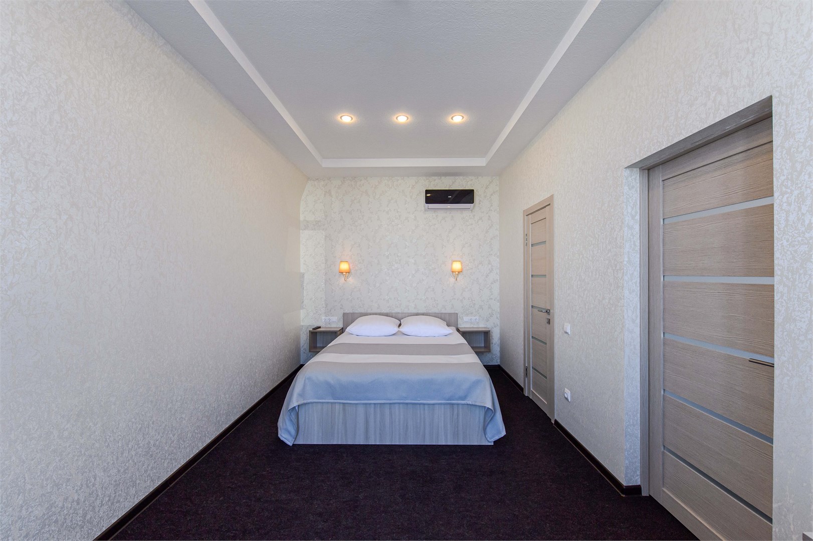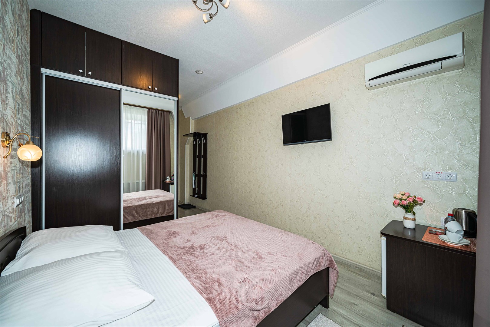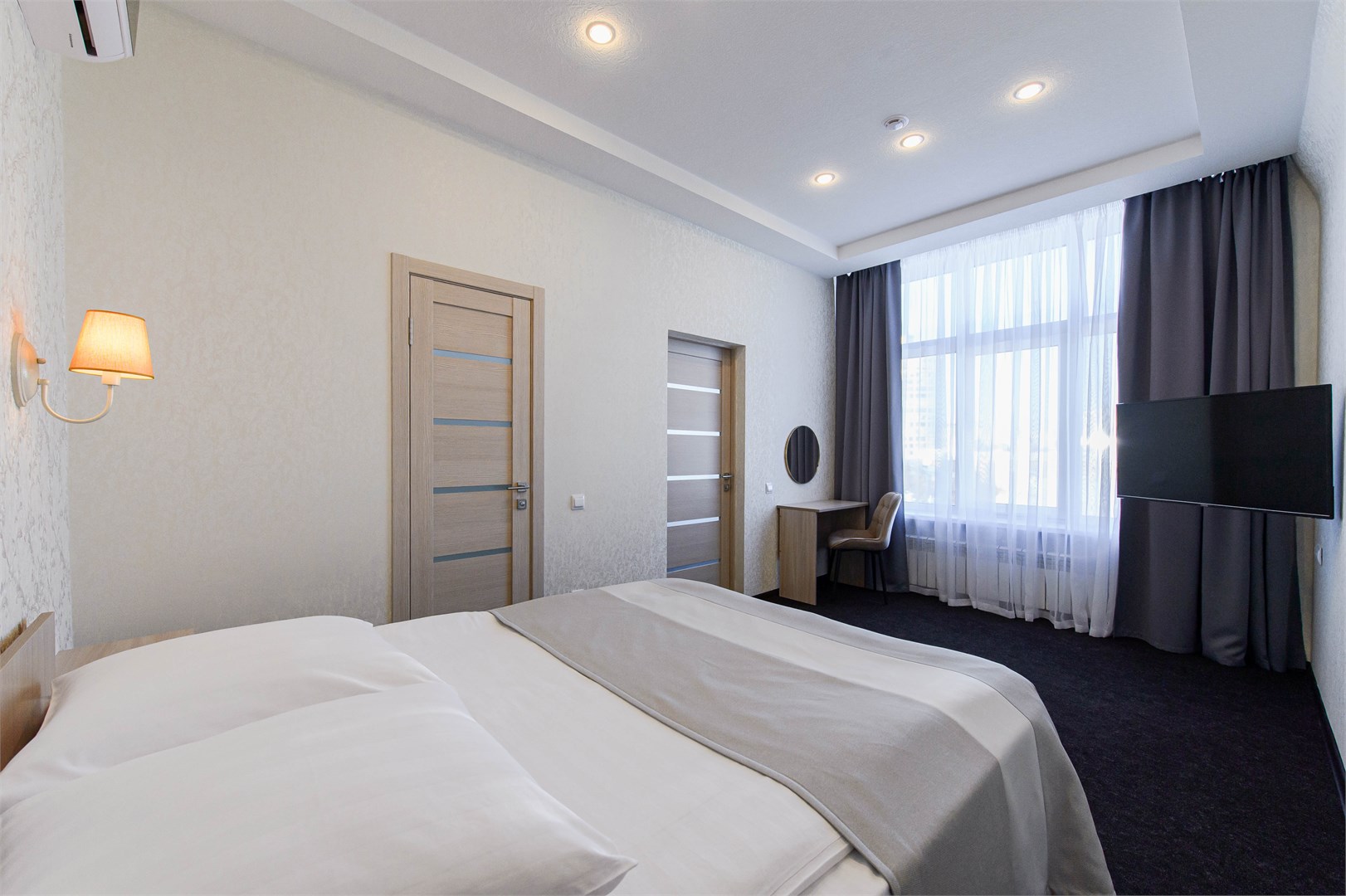 В номере: вешалка, зеркало, кровать двуспальная, прикроватные тумбочки, стол, стулья, шкаф, гладильная доска, кондиционер, мини-холодильник, сейф, телевизор, телефон, утюг, чайный набор посуды, электрочайник