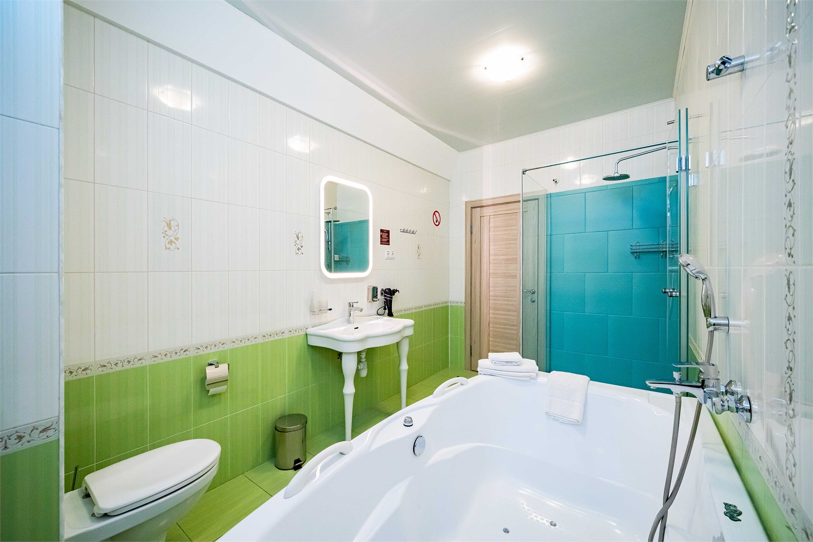 Санузел: с джакузи, тапочки, туалетные принадлежности, фен, халат