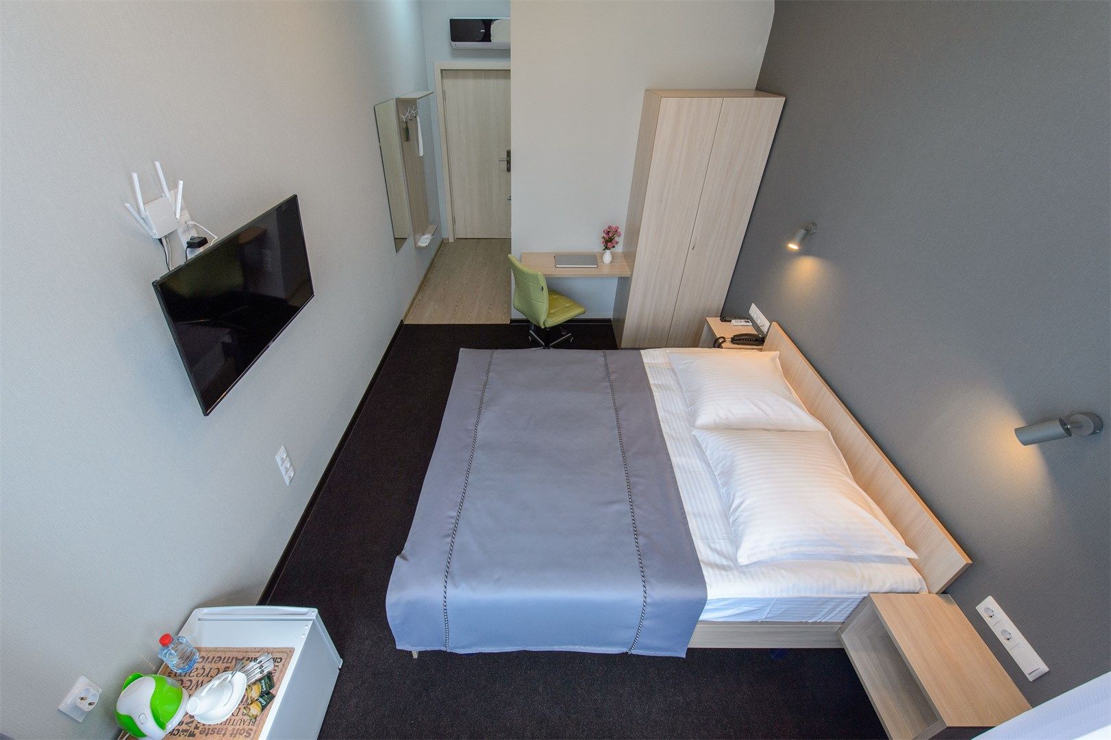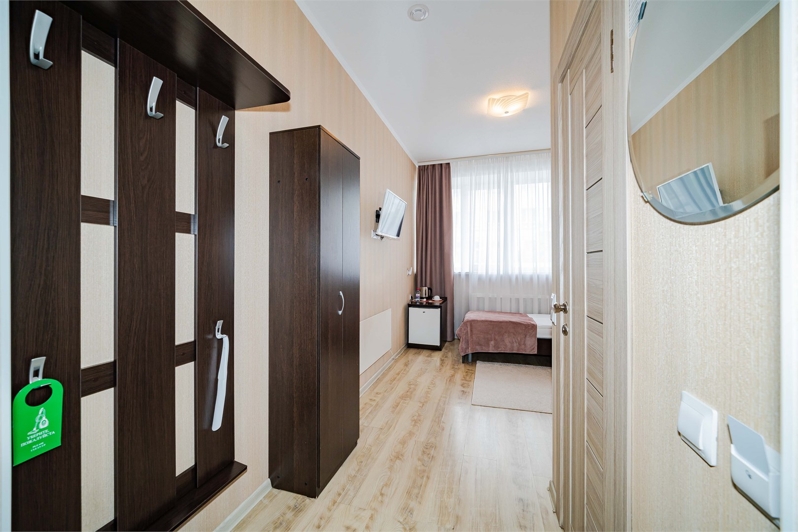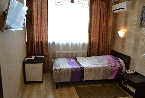 В номере: вешалка, зеркало, кровать односпальная, прикроватная тумбочка, стол, стул, шкаф, кондиционер, мини-холодильник, набор посуды, сейф, телевизор, телефон, электрочайник