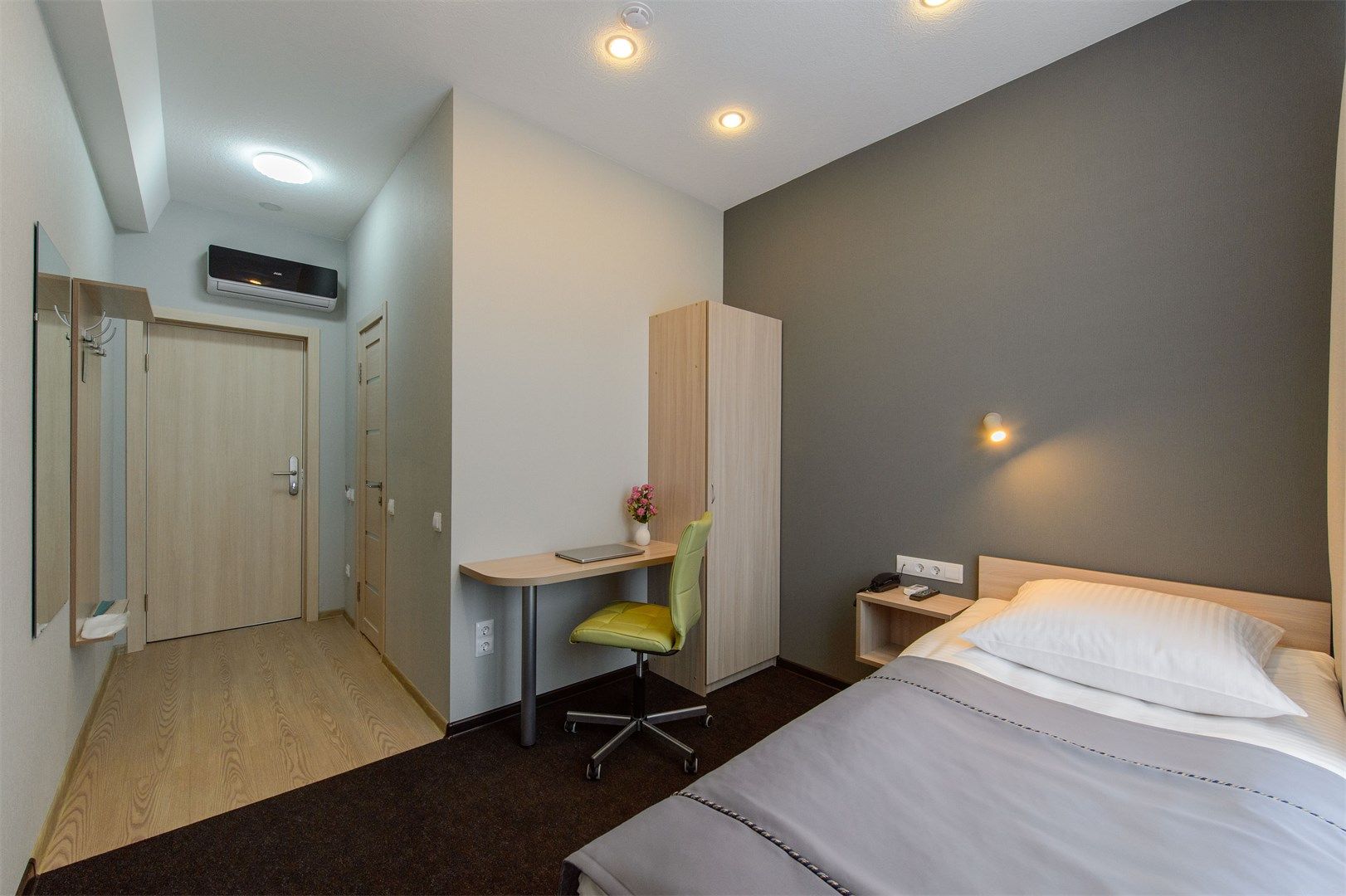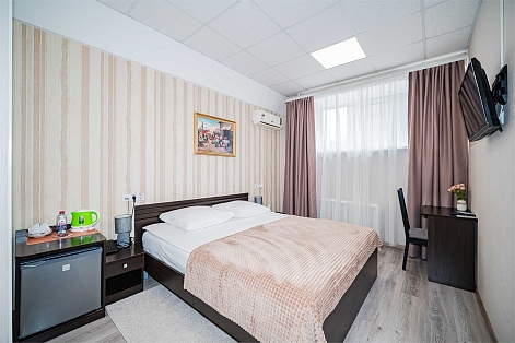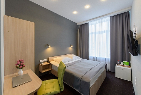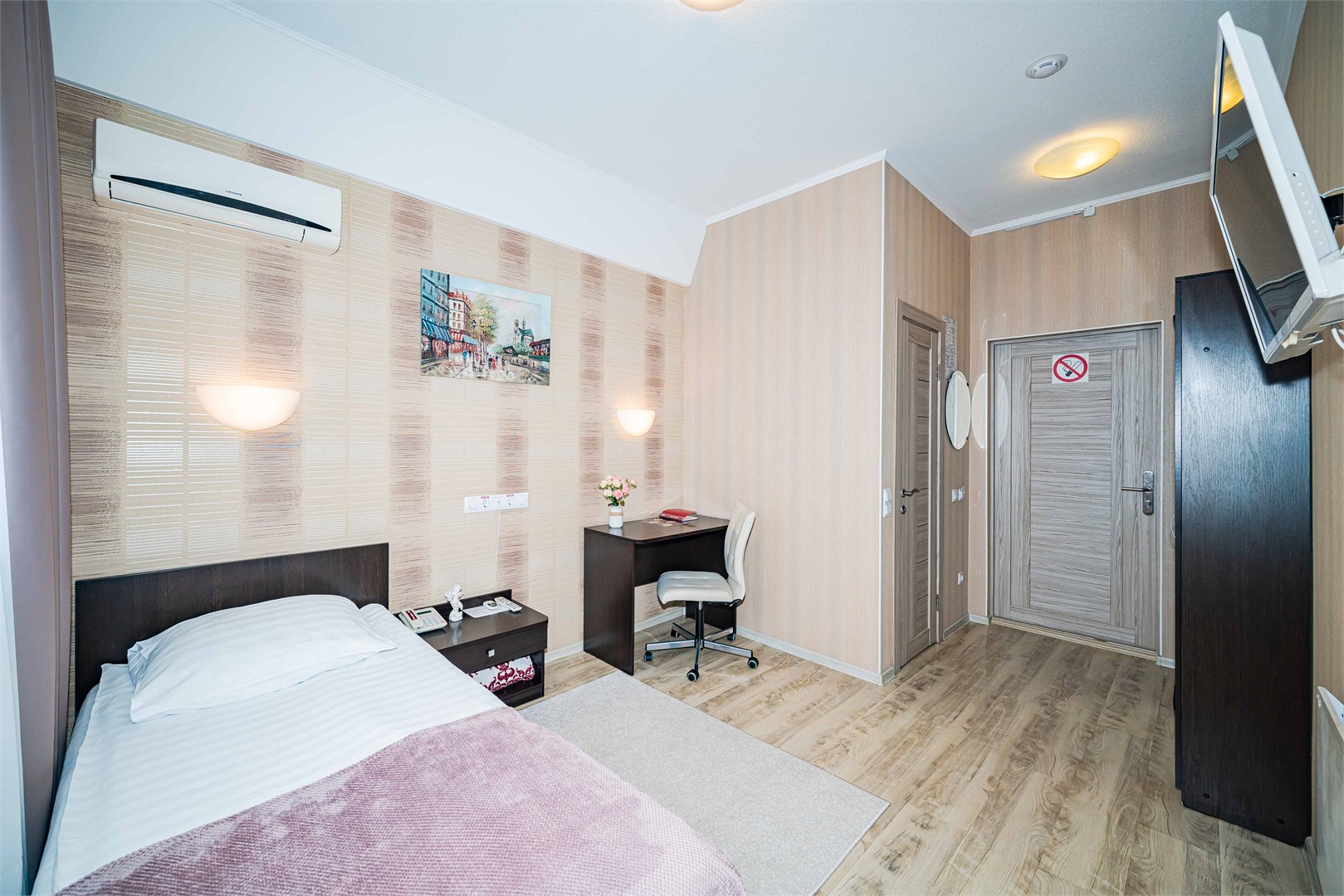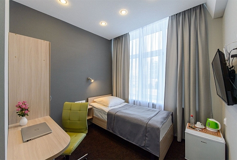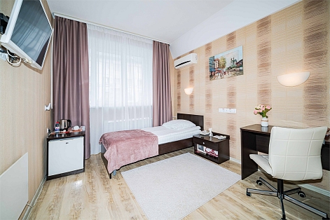 В номере: вешалка, зеркало, кровать односпальная, прикроватная тумбочка, стол, стул, шкаф, гладильная доска, кондиционер, сейф, телевизор, телефон, утюг, чайный набор посуды, электрочайник