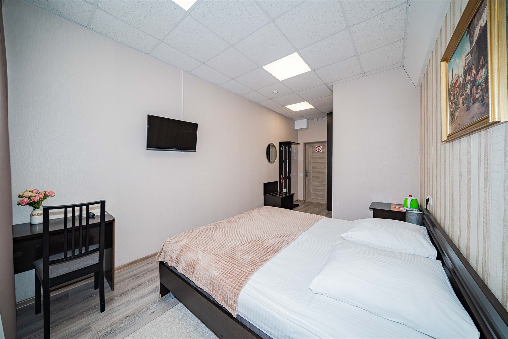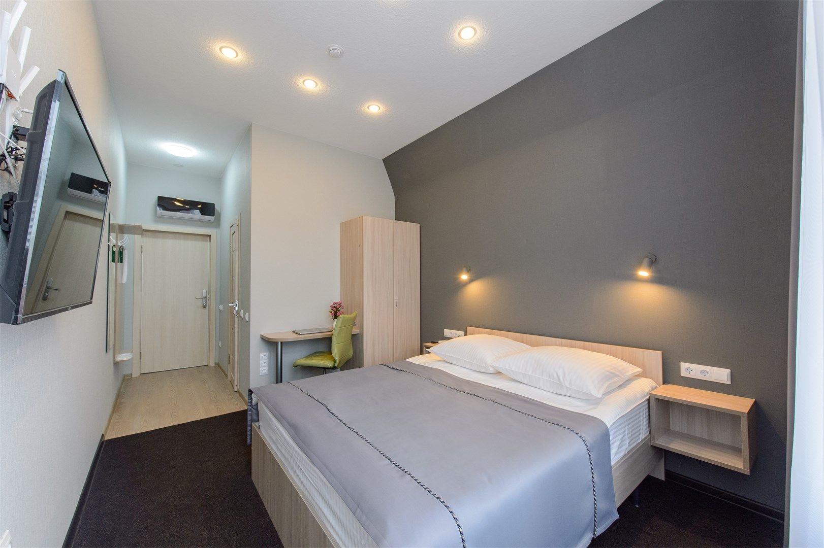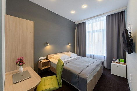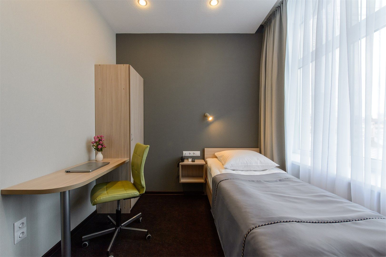 В номере: вешалка, зеркало, кровать односпальная, прикроватная тумбочка, стол, стул, шкаф, гладильная доска, кондиционер, сейф, телевизор, телефон, утюг, чайный набор посуды, электрочайник