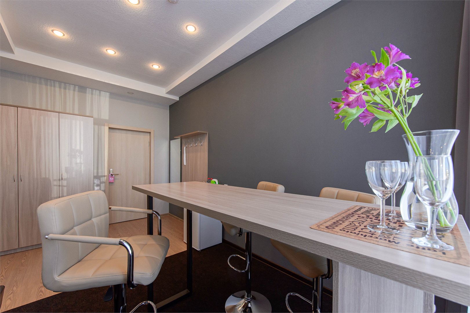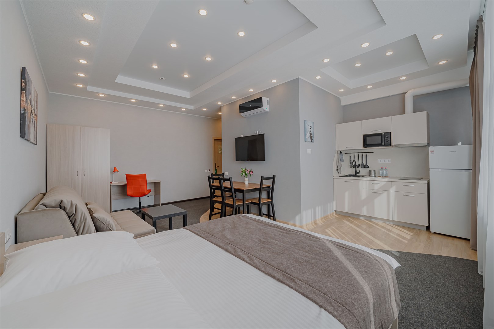 В номере: вешалка, диван раскладной, зеркало, кровать двуспальная, прикроватные тумбочки, стол, столик журнальный, стулья, шкаф, кондиционер, микроволновая печь, набор посуды, плита электрическая, сейф, телевизор, утюг, холодильник, электрочайник
