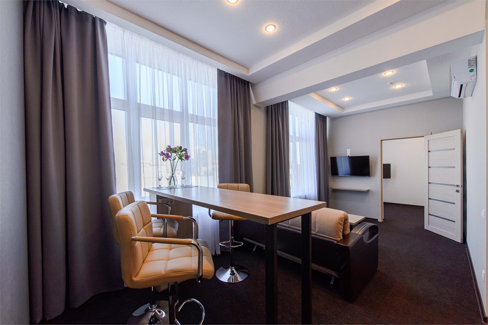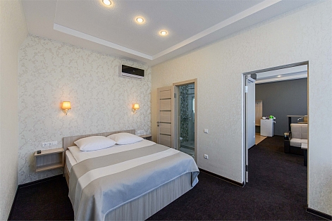 В номере: вешалка, диван, зеркало, кровать двуспальная, прикроватные тумбочки, стол, столик журнальный, стулья, шкаф, кондиционер, мини-холодильник, набор посуды, сейф, телевизор, телефон, электрочайник