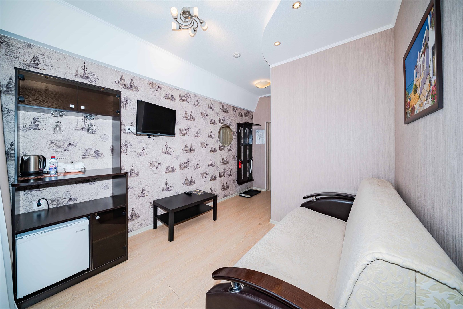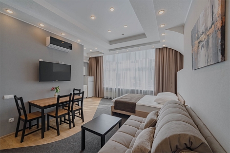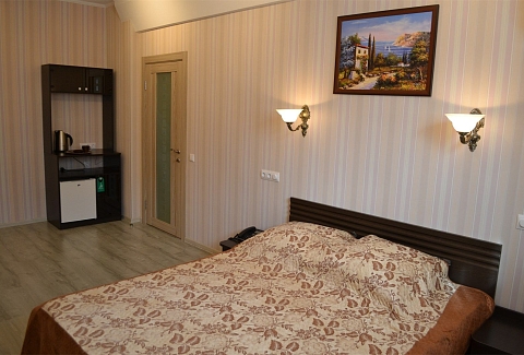 В номере: вешалка, диван, зеркало, кровать двуспальная, прикроватные тумбочки, стол, стулья, шкаф, кондиционер, мини-холодильник, набор посуды, сейф, телевизор, телефон, электрочайник