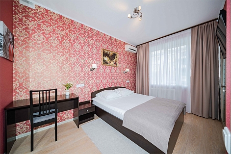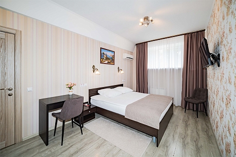 В номере: вешалка, зеркало, кровать двуспальная, прикроватные тумбочки, стол, стулья, шкаф, кондиционер, мини-холодильник, сейф, телевизор, телефон, чайный набор посуды, электрочайник