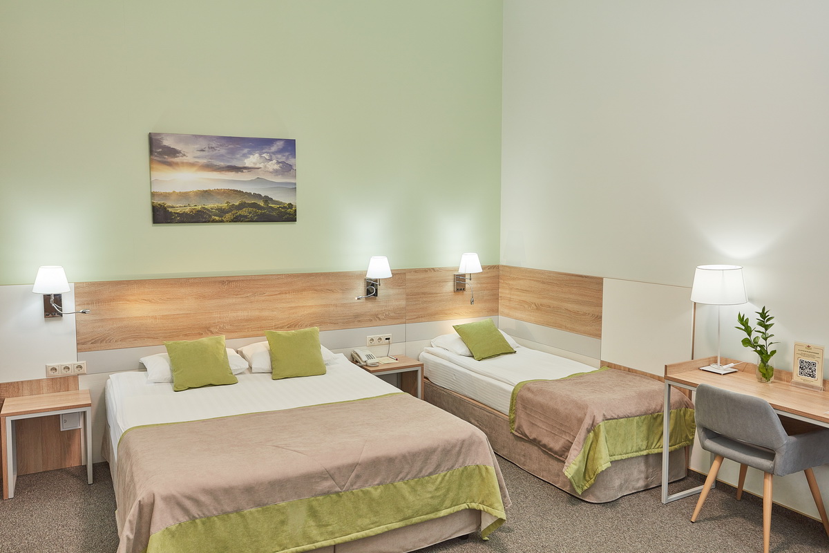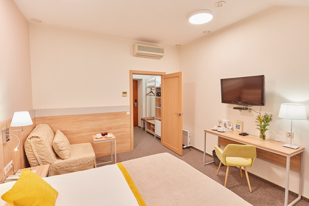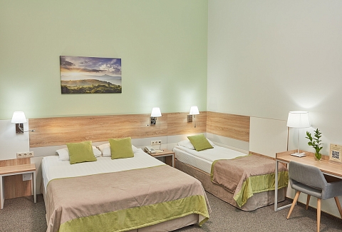 В номере: кресло-кровать, кровати односпальные /одна двуспальная кровать, прикроватные тумбочки, стол, столик журнальный, стул, шкаф, кондиционер, сейф, телевизор, телефон, чайный набор посуды, электрочайник
