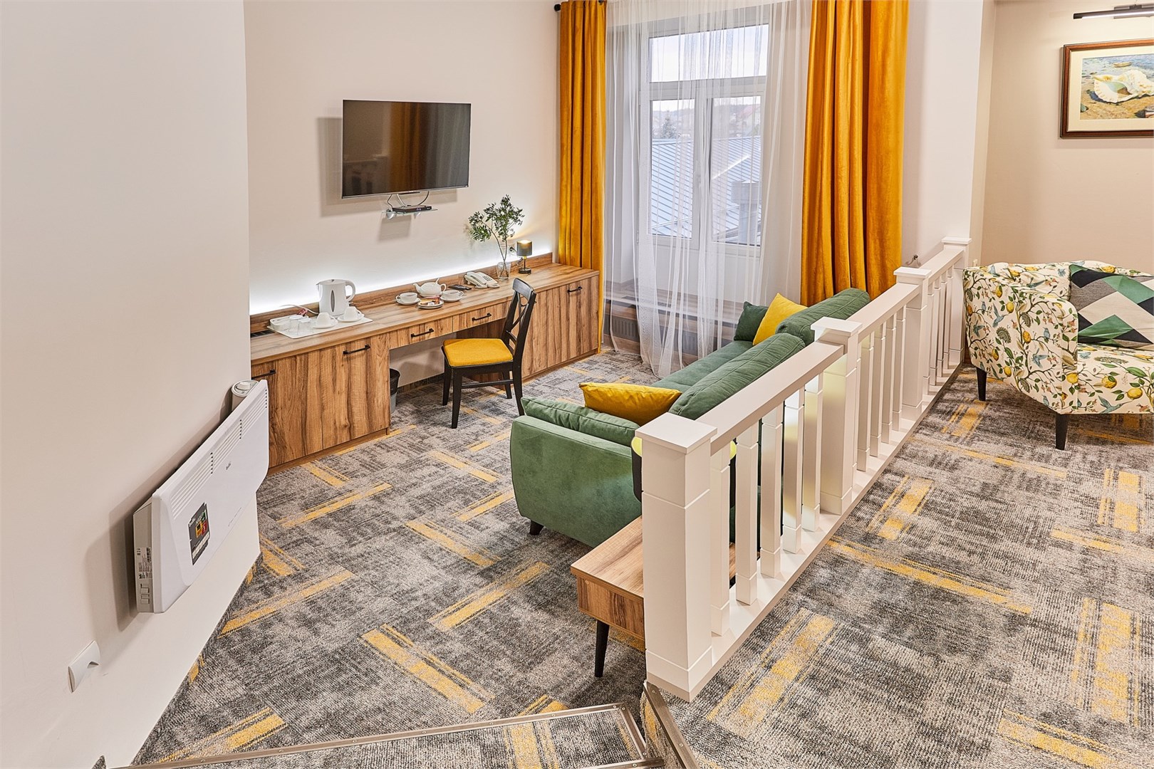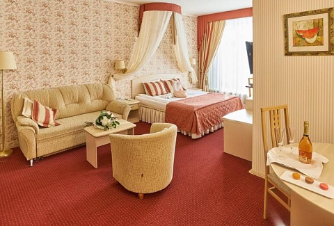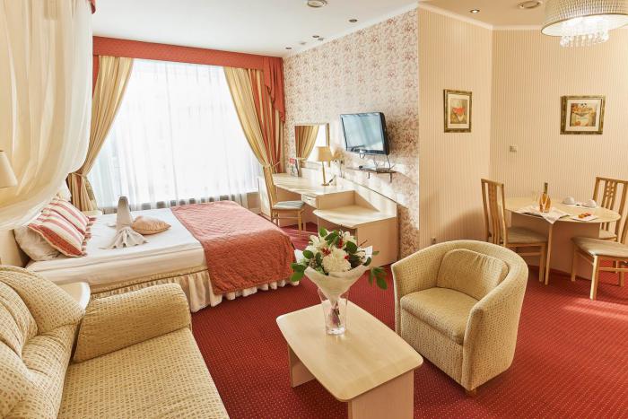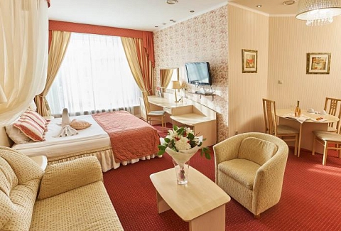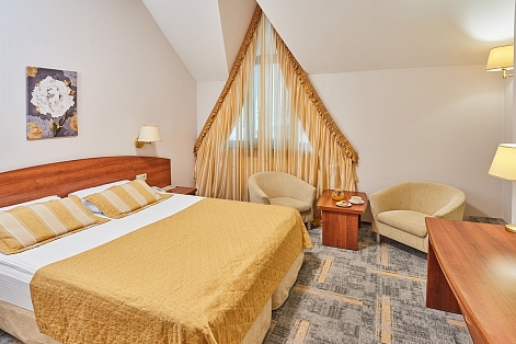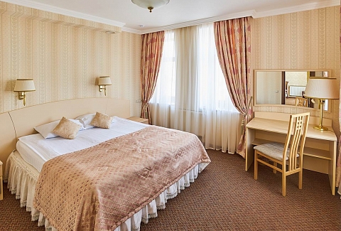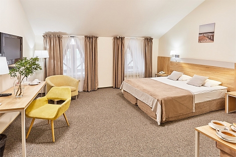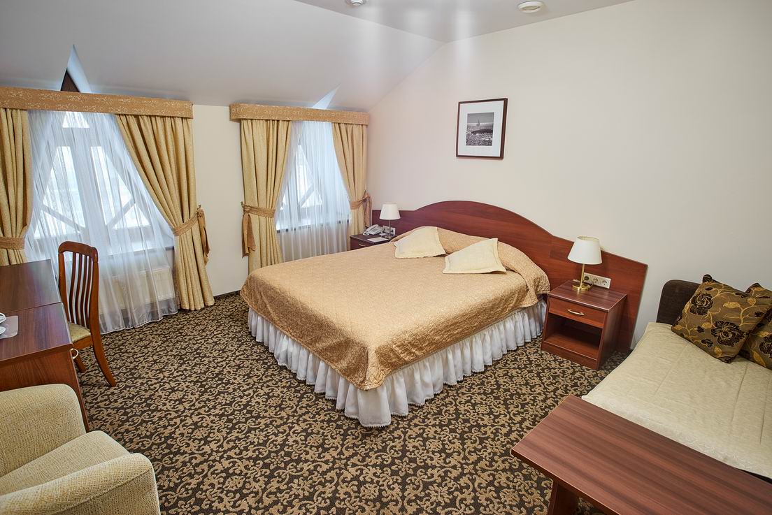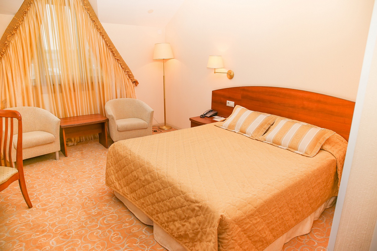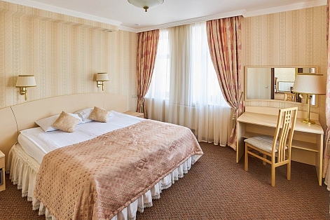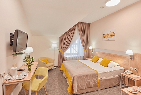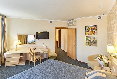 В номере: диван, кресла, кровать двуспальная, прикроватные тумбочки, столик журнальный, столик туалетный, стул, шкаф, кондиционер, сейф, телевизор, телефон, чайный набор посуды, электрочайник