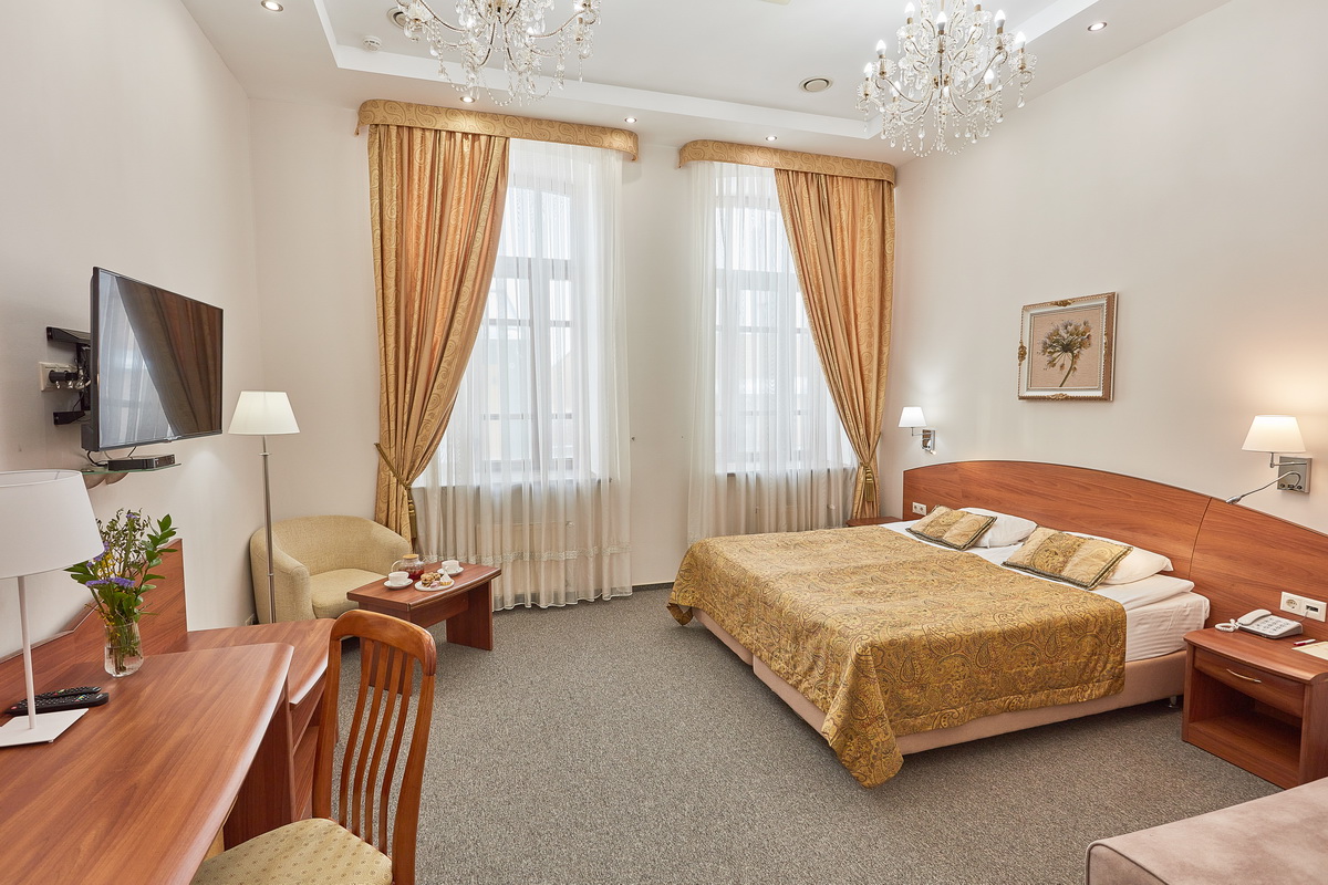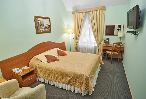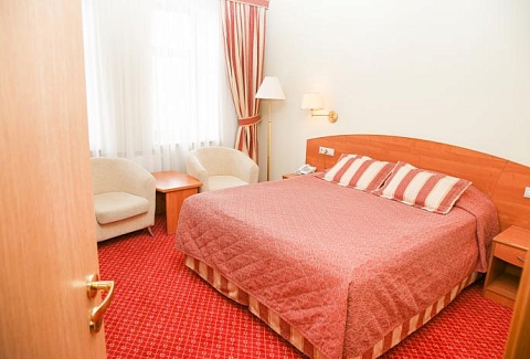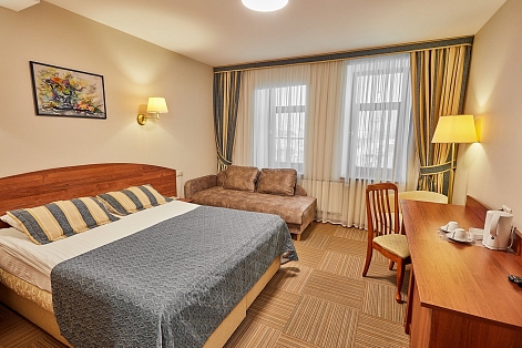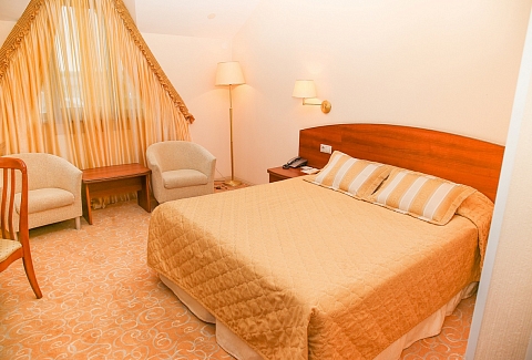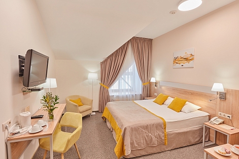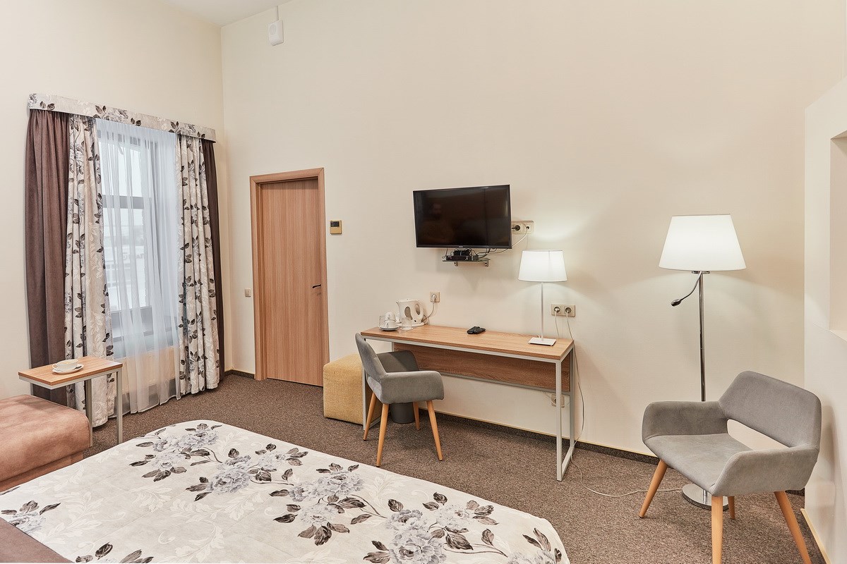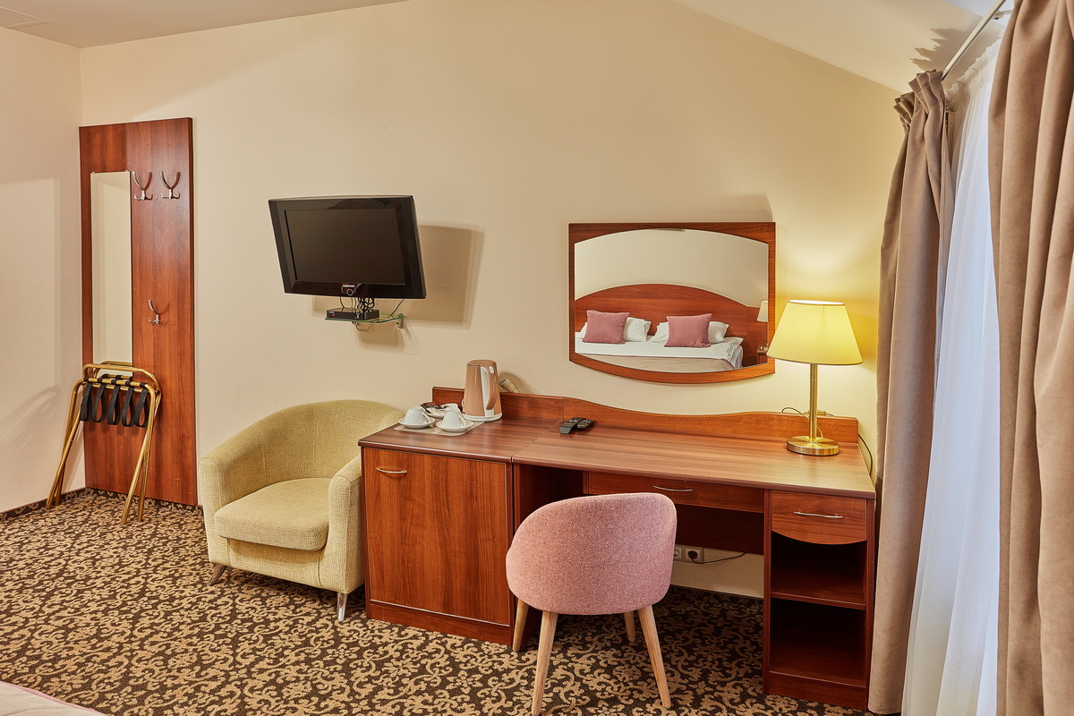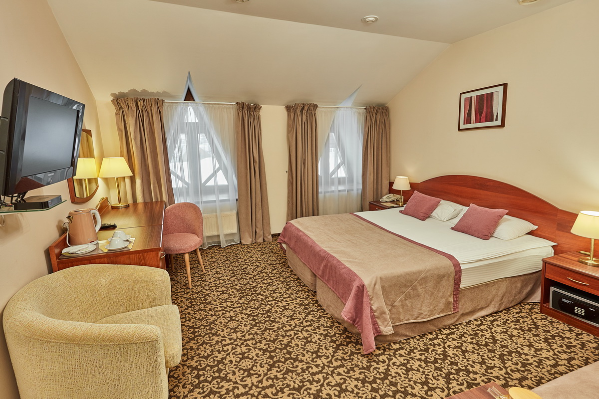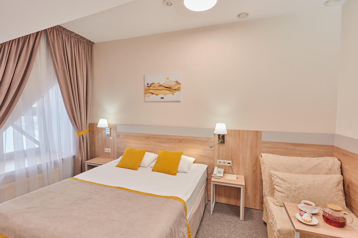 В номере: кресла, кровати односпальные /одна двуспальная кровать, прикроватные тумбочки, стол, столик журнальный, стул, шкаф, кондиционер, сейф, телевизор, телефон, чайный набор посуды, электрочайник