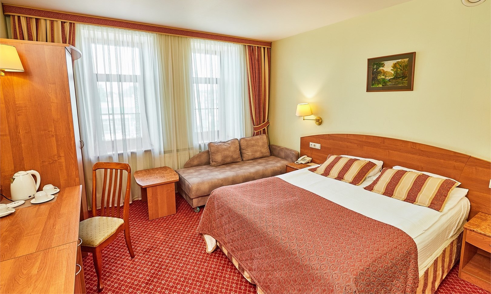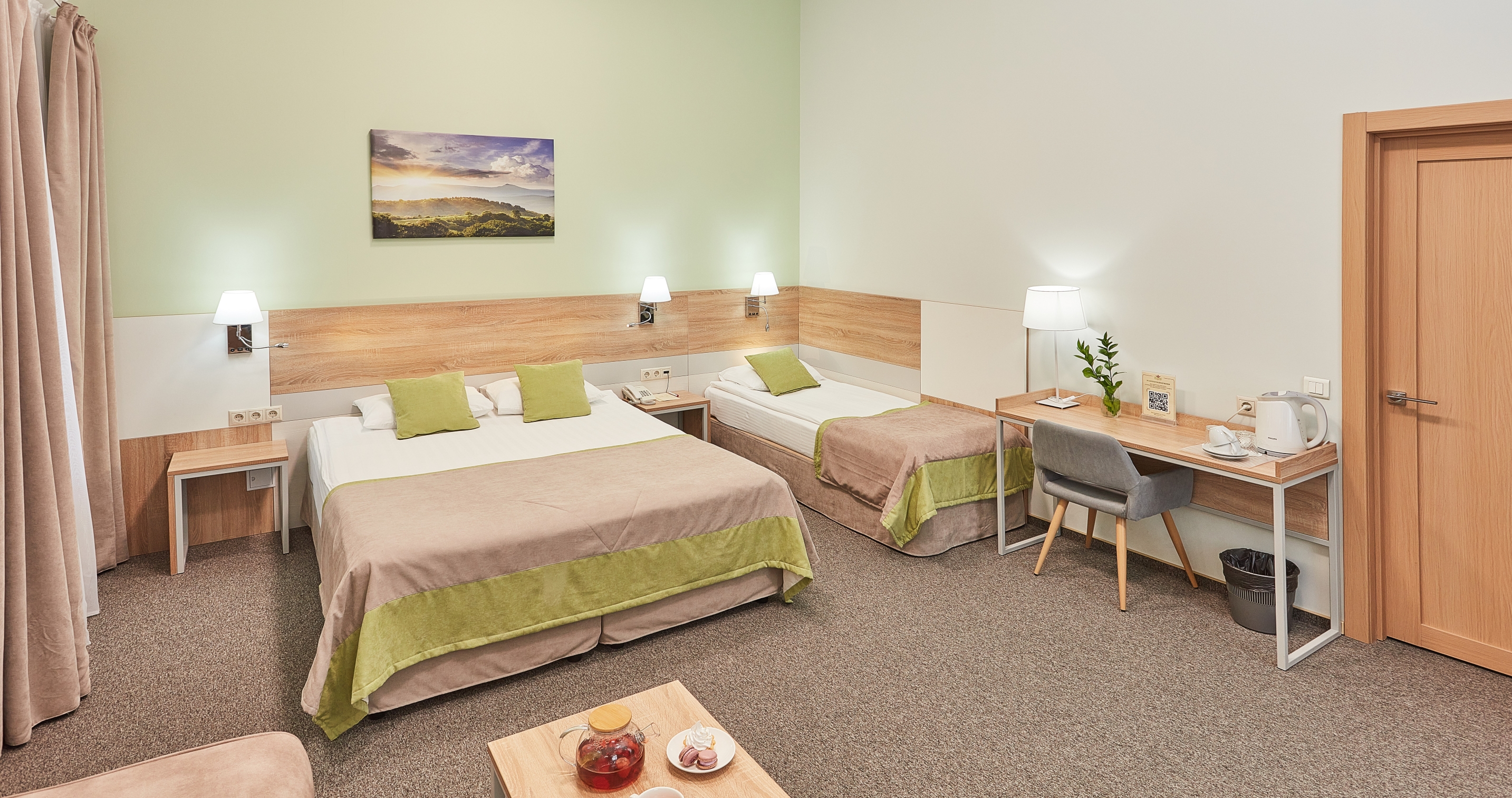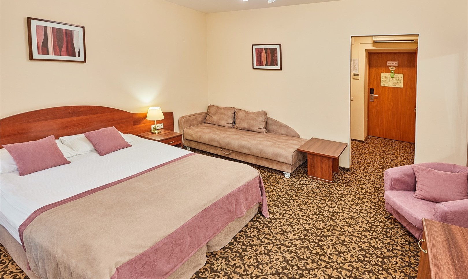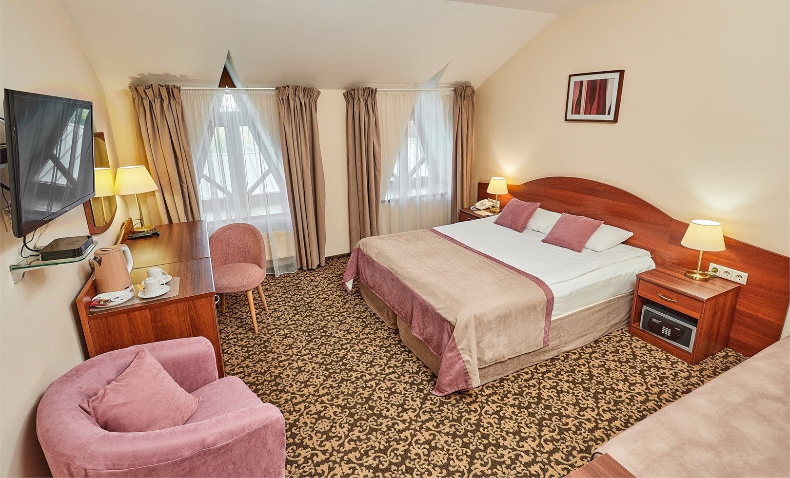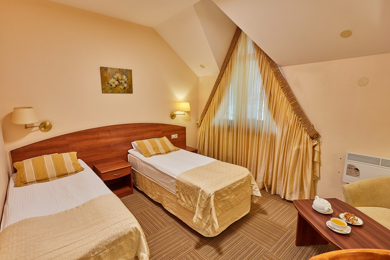 В номере: кресла, кровати односпальные /одна двуспальная кровать, прикроватные тумбочки, стол, столик журнальный, стул, шкаф, кондиционер, сейф, телевизор, телефон, чайный набор посуды, электрочайник