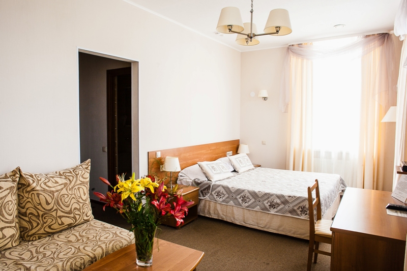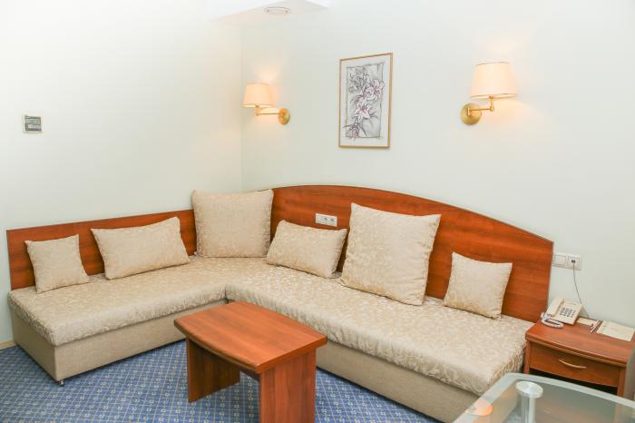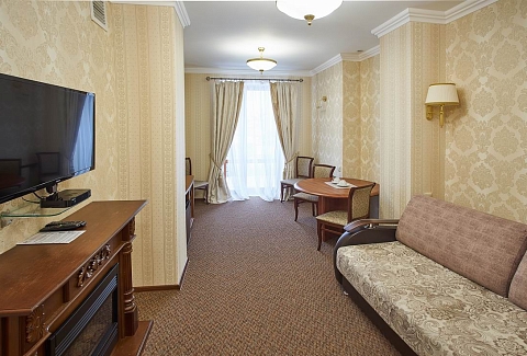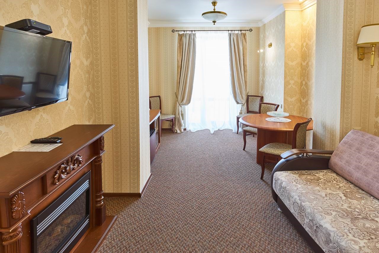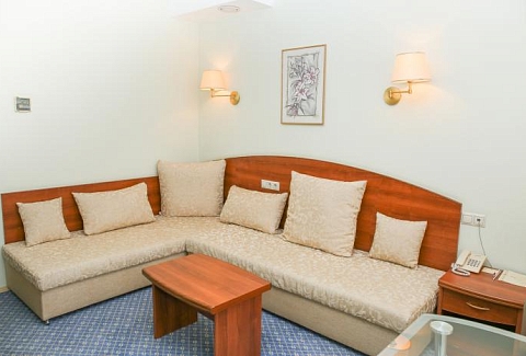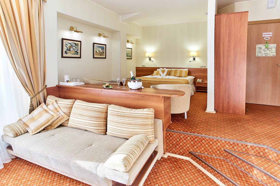 В номере: диван, кресла, кровати односпальные /одна двуспальная кровать, прикроватные тумбочки, стол, столик журнальный, стулья, шкаф, кондиционер, сейф, телевизор, телефон, холодильник, чайный набор посуды, электрочайник