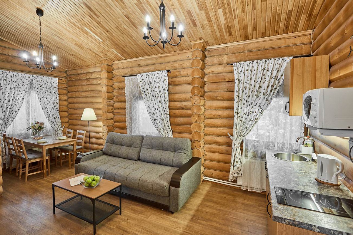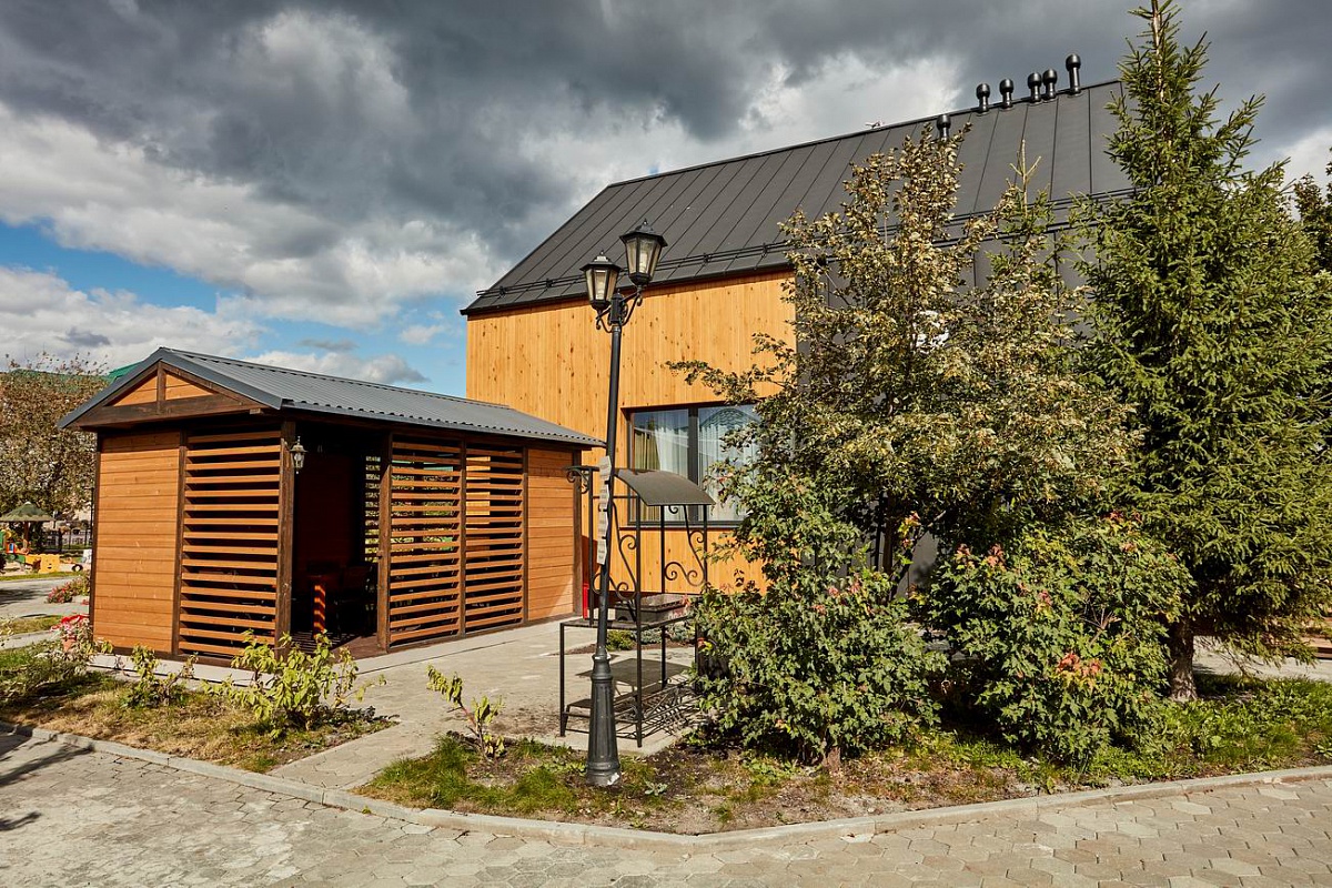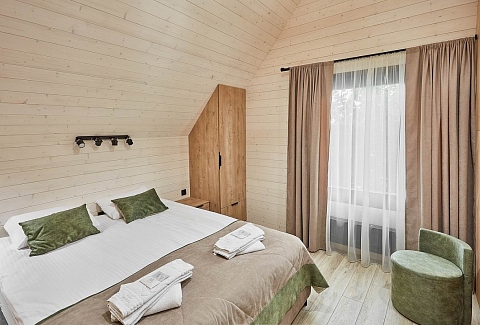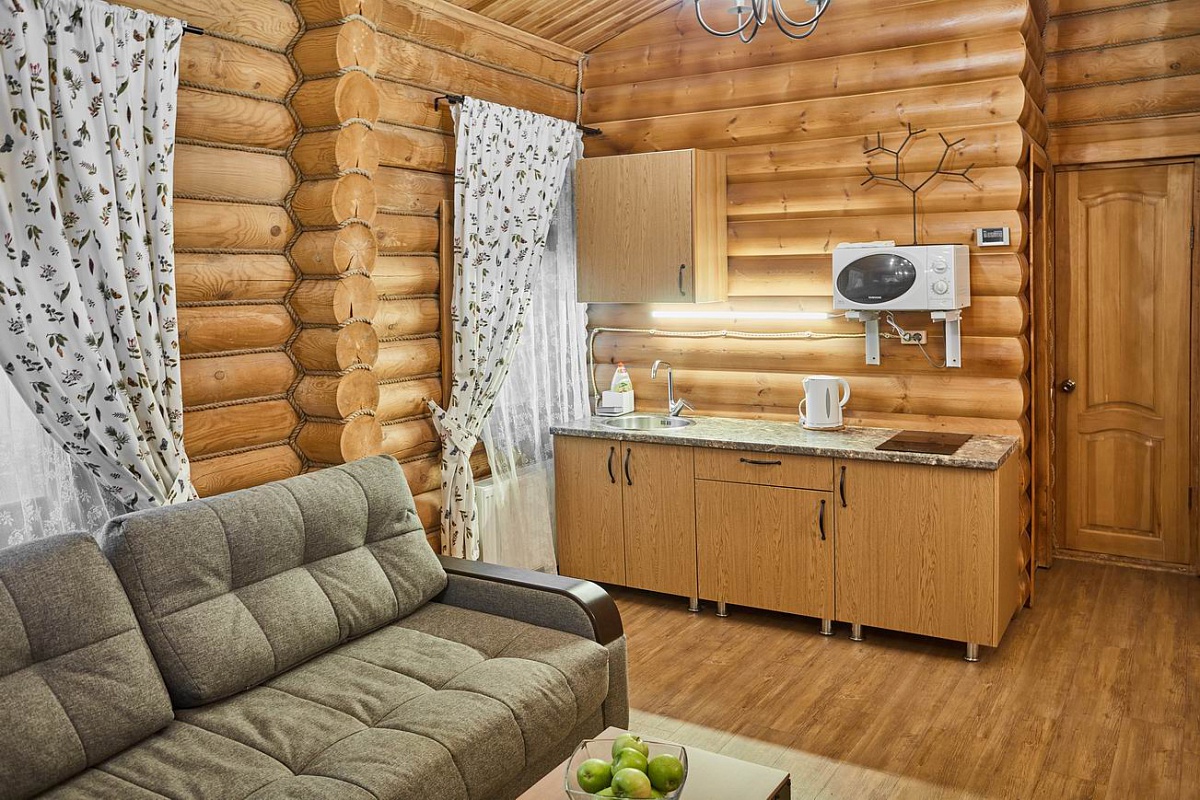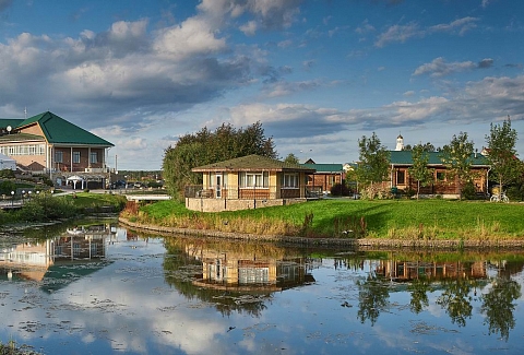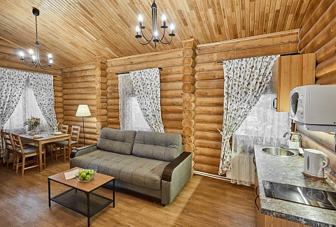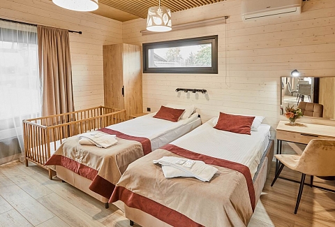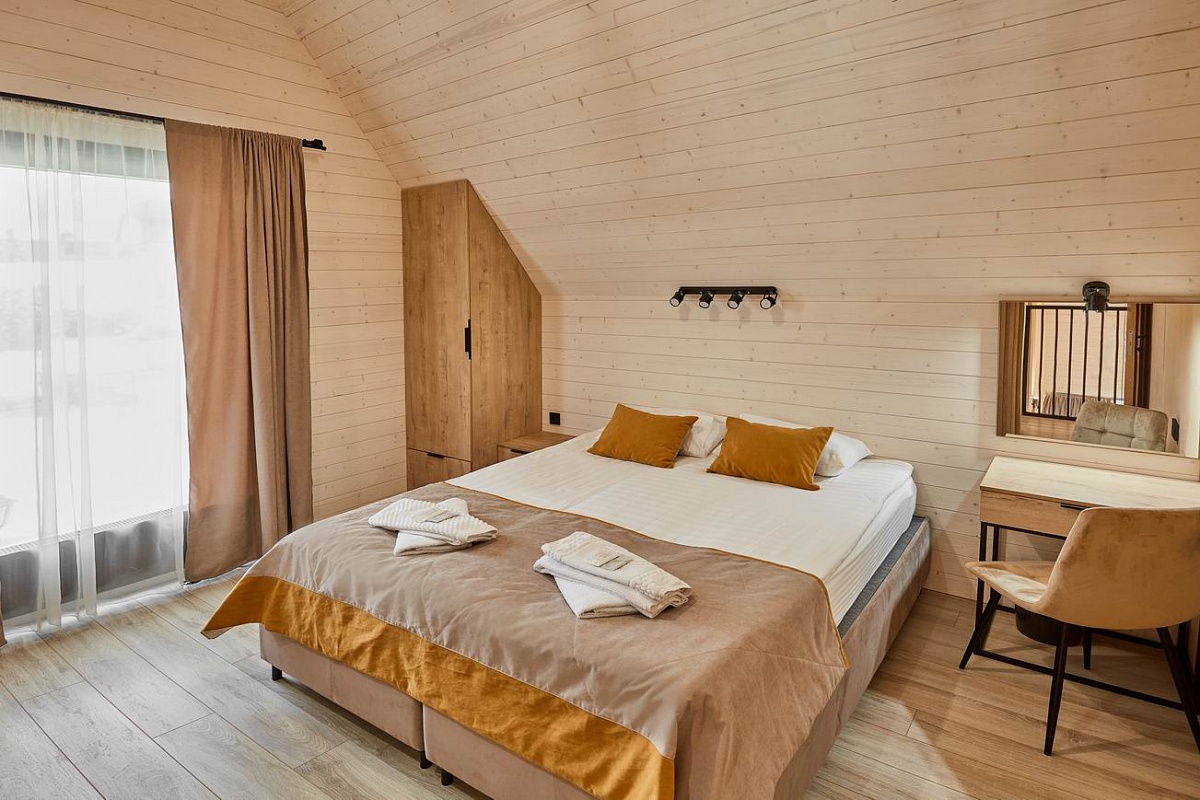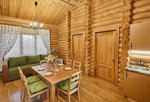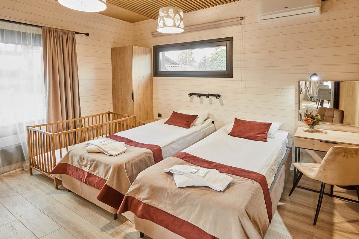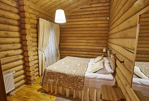 На территории находится основной жилой корпус с двухместными номерами разных категорий, рестораном и спа-салоном, а также несколько бревенчатых домиков-коттеджей, предназначенных для проживания семьи или большой компании. В номерах независимо от уровня комфорта есть все необходимое — санузел с душем, кондиционер, электрочайник, телевизор, фен, а в коттеджах оборудована собственная кухня. В ресторане, расположенном в основном корпусе, три зала. Гости могут заказать там полноценное питание или отметить любое праздничное событие, также для торжественных мероприятий на свежем воздухе предусмотрен большой красивый шатер, вмещающий до 120 приглашенных. Для любителей шашлыков на территории обустроена гриль-зона с мангалами, беседками и гриль-домиками. В распоряжении гостей два бассейна — крытый с гидромассажем, работающий круглогодично, и открытый с подогревом, доступный только в теплое время года. В спа-центре можно расслабиться и отдохнуть после насыщенного дня: к услугам отдыхающих — финская сауна, турецкий хаммам. Поклонники активного образа жизни оценят тренажерный зал и спортивные площадки, также в отеле есть бильярд и настольные игры. Гости на машинах могут не волноваться — в загородном спа-отеле для автовладельцев предусмотрена охраняемая парковка. Для детей организованы игровая площадка и детская комната, регулярно в отеле проходят показы мультфильмов, по выходным работают творческие мастерские и устраиваются различные мастер-классы. В ресторане есть специальное детское меню, а малышам предоставляются кроватки-манежи и стульчики для кормления.