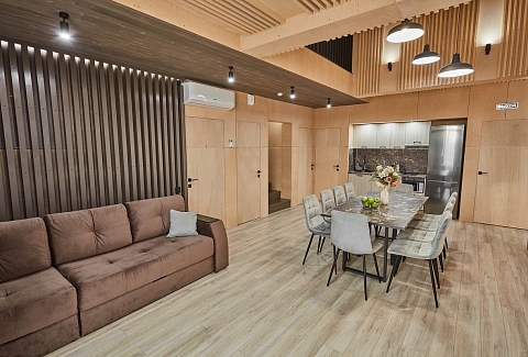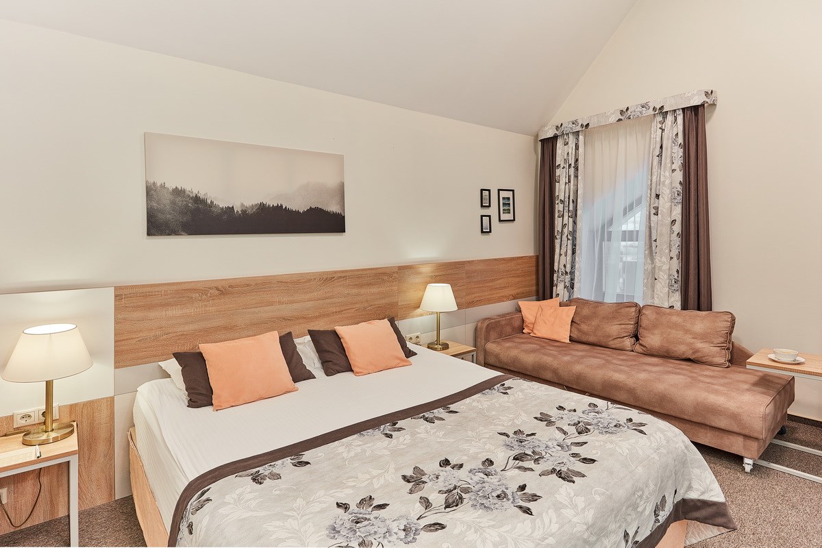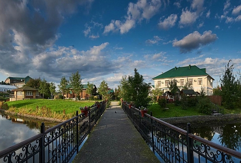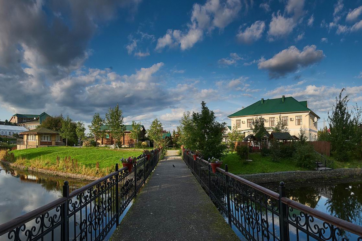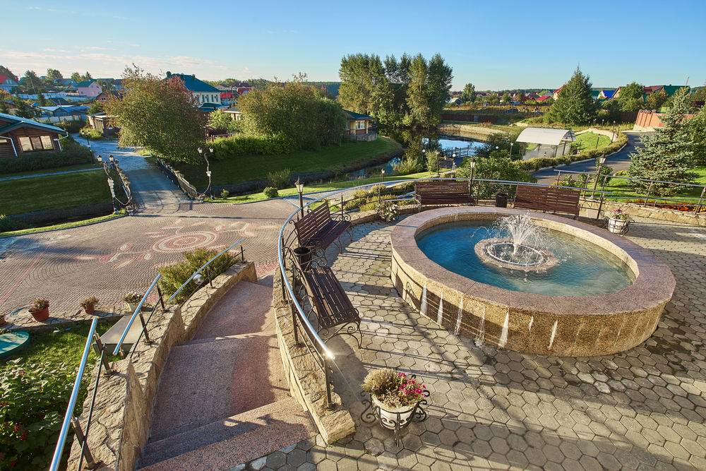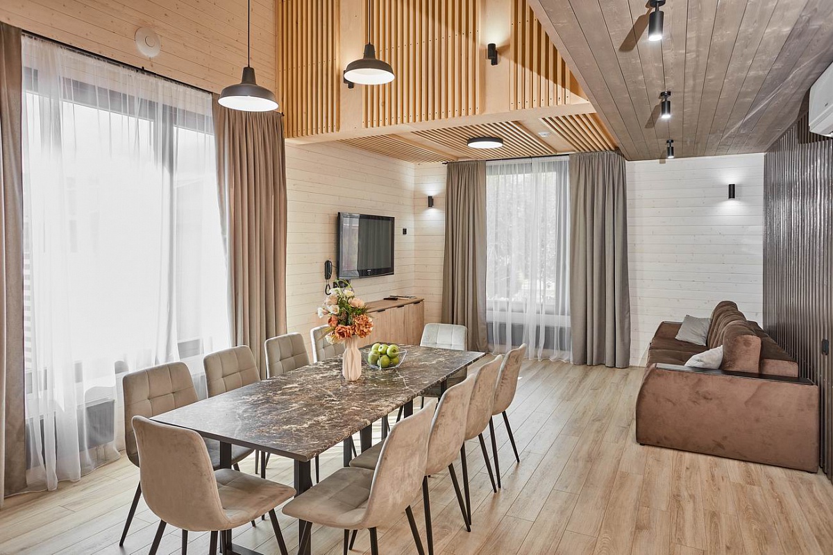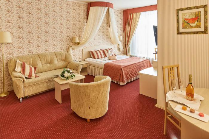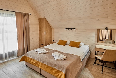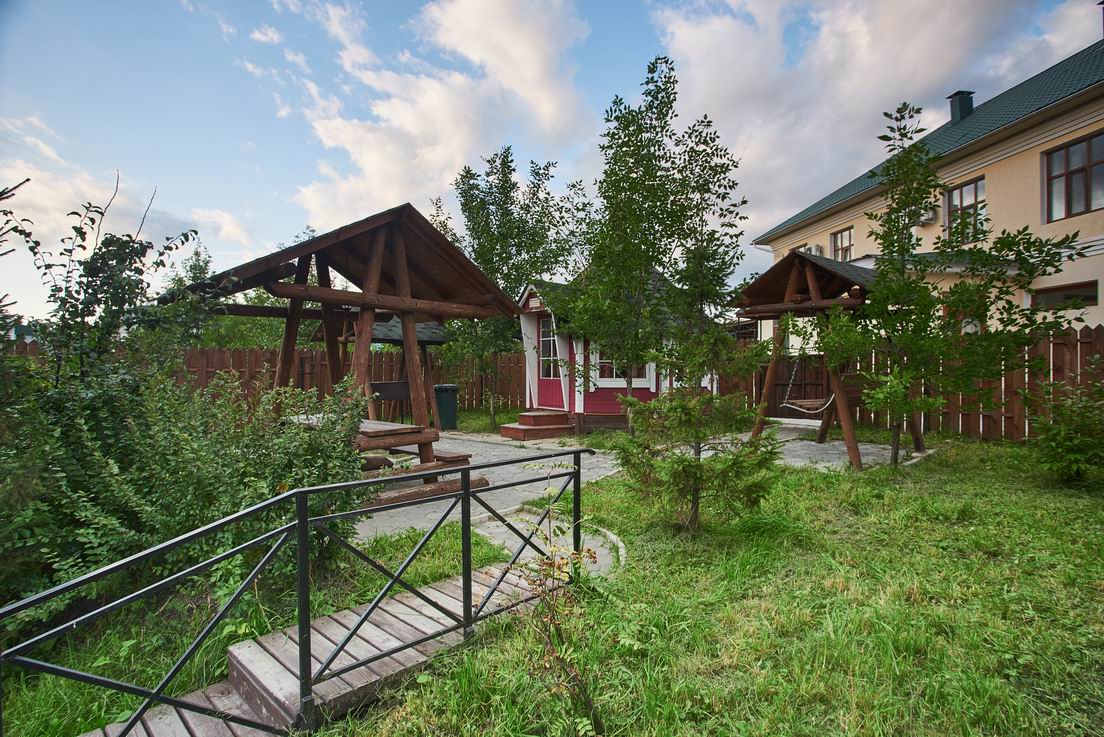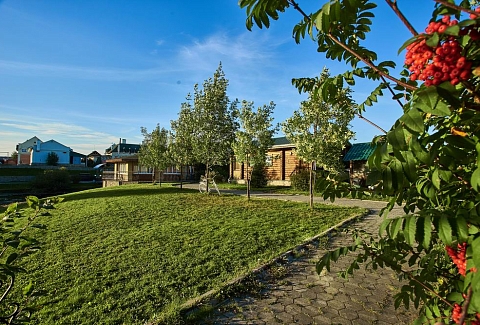 На территории находится основной жилой корпус с двухместными номерами разных категорий, рестораном и спа-салоном, а также несколько бревенчатых домиков-коттеджей, предназначенных для проживания семьи или большой компании. В номерах независимо от уровня комфорта есть все необходимое — санузел с душем, кондиционер, электрочайник, телевизор, фен, а в коттеджах оборудована собственная кухня. В ресторане, расположенном в основном корпусе, три зала. Гости могут заказать там полноценное питание или отметить любое праздничное событие, также для торжественных мероприятий на свежем воздухе предусмотрен большой красивый шатер, вмещающий до 120 приглашенных. Для любителей шашлыков на территории обустроена гриль-зона с мангалами, беседками и гриль-домиками. В распоряжении гостей два бассейна — крытый с гидромассажем, работающий круглогодично, и открытый с подогревом, доступный только в теплое время года. В спа-центре можно расслабиться и отдохнуть после насыщенного дня: к услугам отдыхающих — финская сауна, турецкий хаммам. Поклонники активного образа жизни оценят тренажерный зал и спортивные площадки, также в отеле есть бильярд и настольные игры. Гости на машинах могут не волноваться — в загородном спа-отеле для автовладельцев предусмотрена охраняемая парковка. Для детей организованы игровая площадка и детская комната, регулярно в отеле проходят показы мультфильмов, по выходным работают творческие мастерские и устраиваются различные мастер-классы. В ресторане есть специальное детское меню, а малышам предоставляются кроватки-манежи и стульчики для кормления.