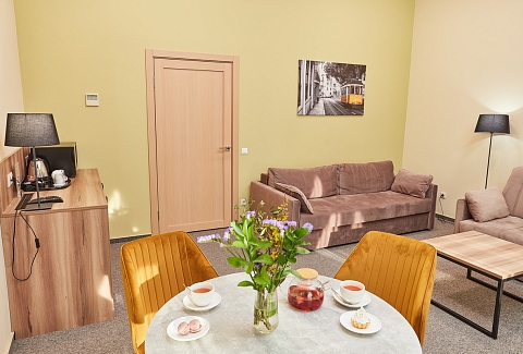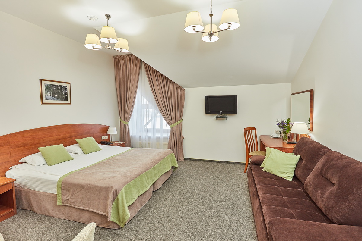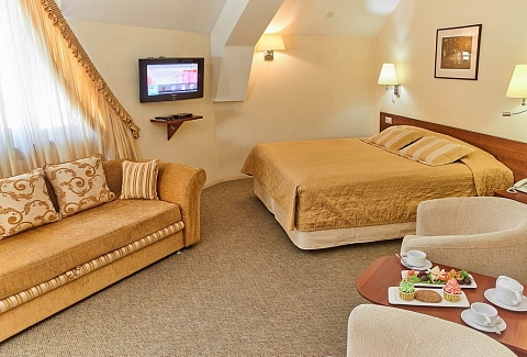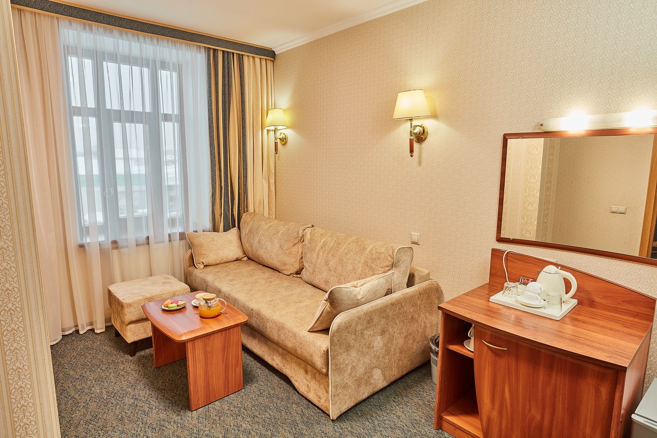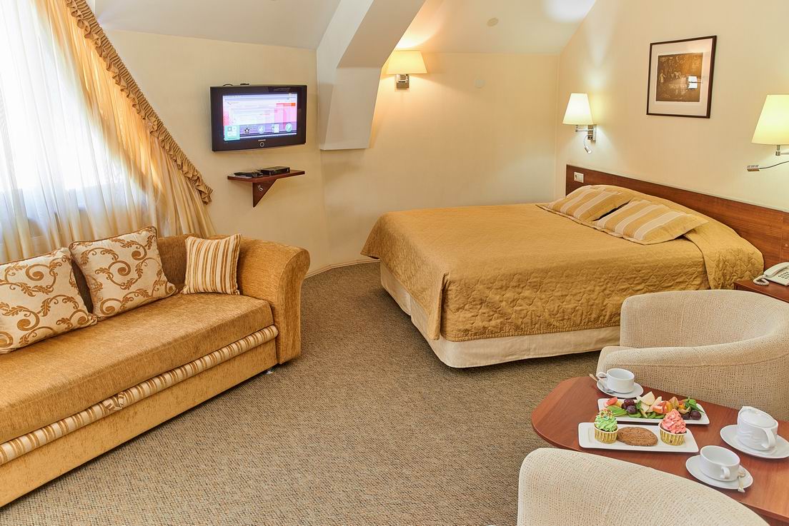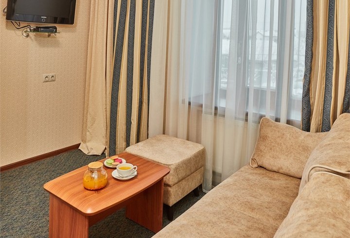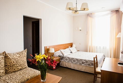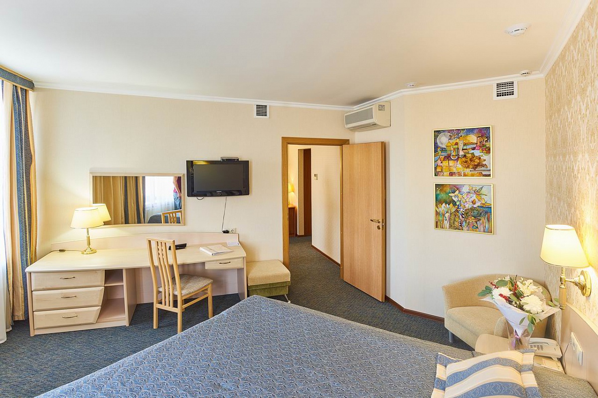 В номере: диван раскладной, кресло, кровати односпальные /одна двуспальная кровать, прикроватные тумбочки, стол, столик журнальный, стул, шкаф, кондиционер, сейф, телевизор, телефон, холодильник, чайный набор посуды, электрочайник