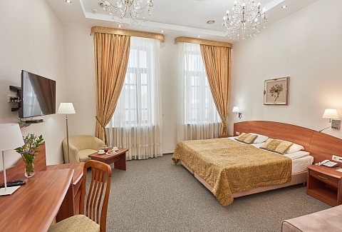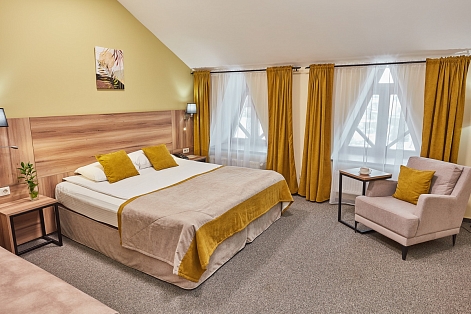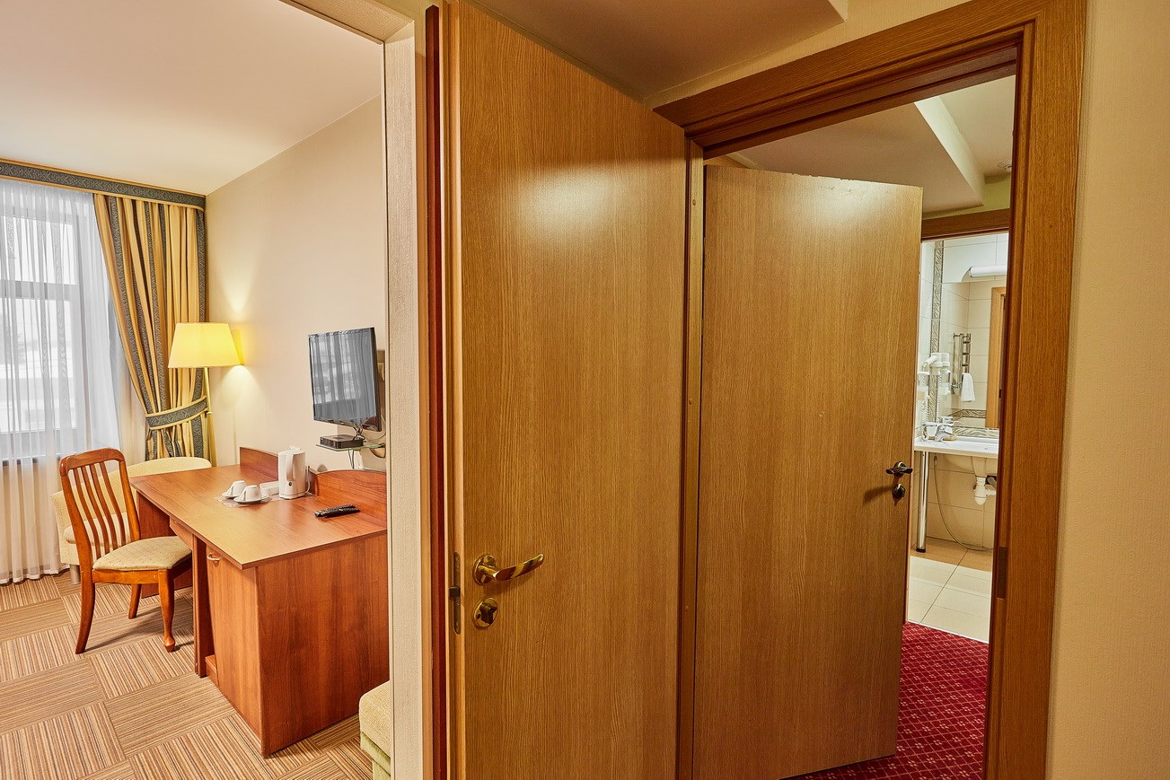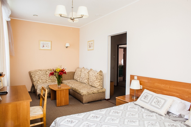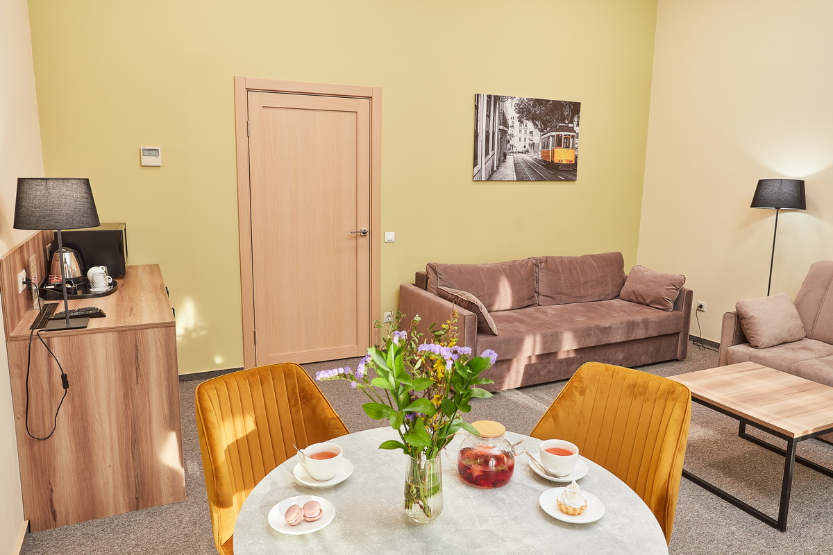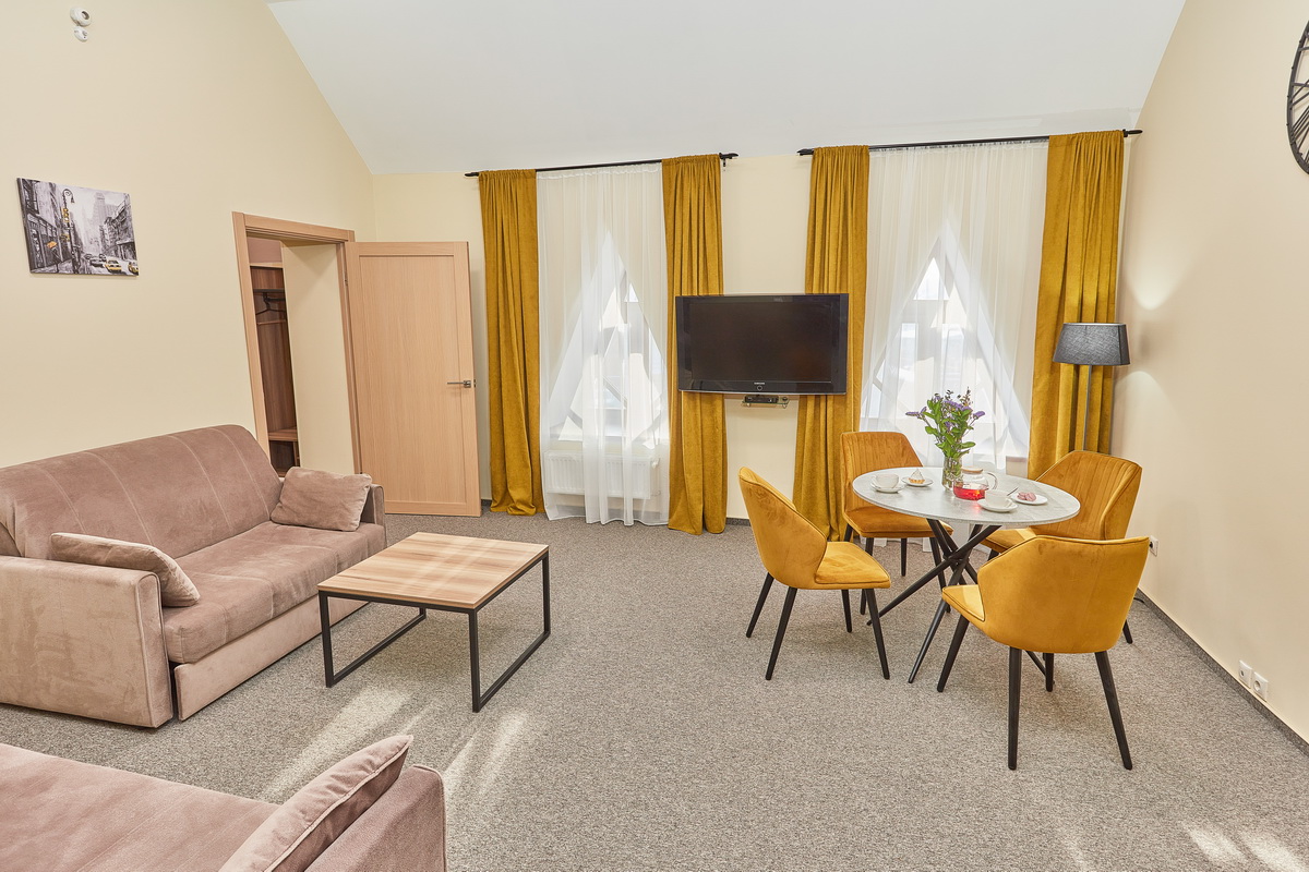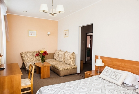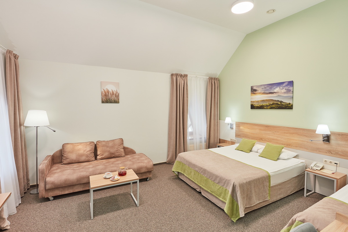 В номере: диван раскладной, кресло, кровати односпальные /одна двуспальная кровать, прикроватные тумбочки, стол, столик журнальный, стул, шкаф, кондиционер, сейф, телевизор, телефон, холодильник, чайный набор посуды, электрочайник