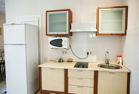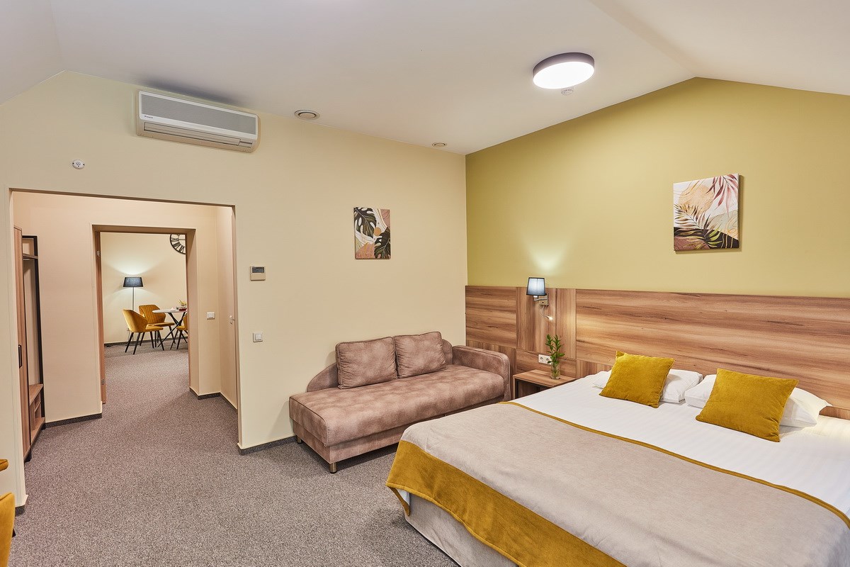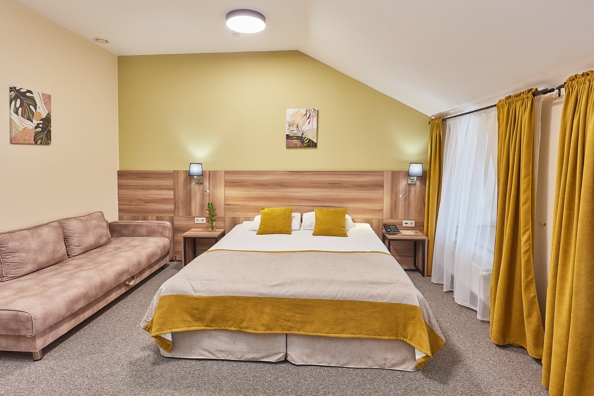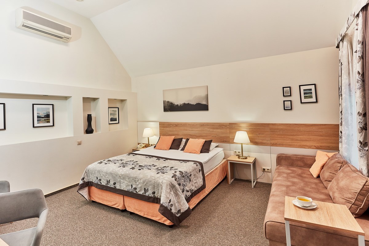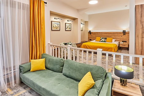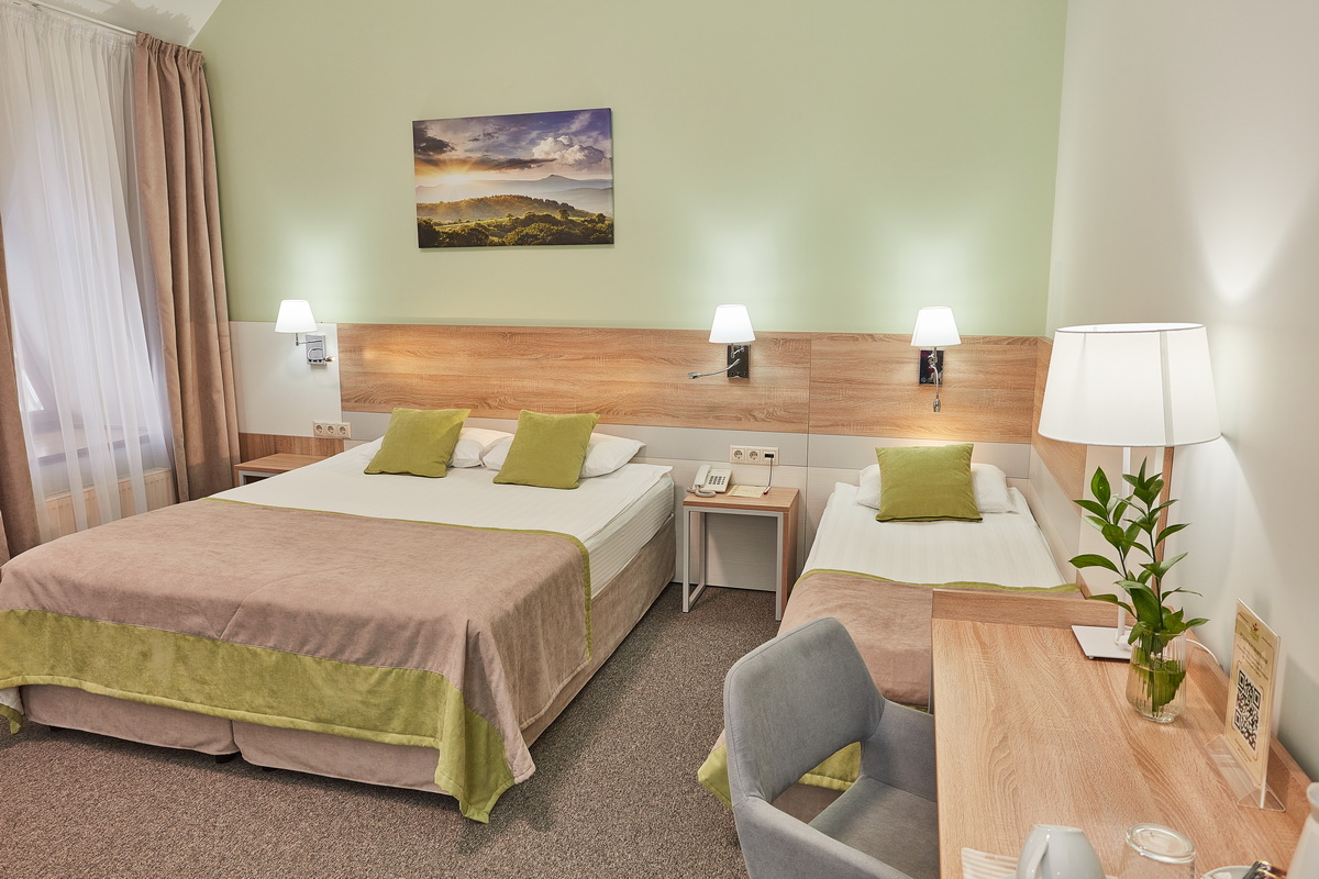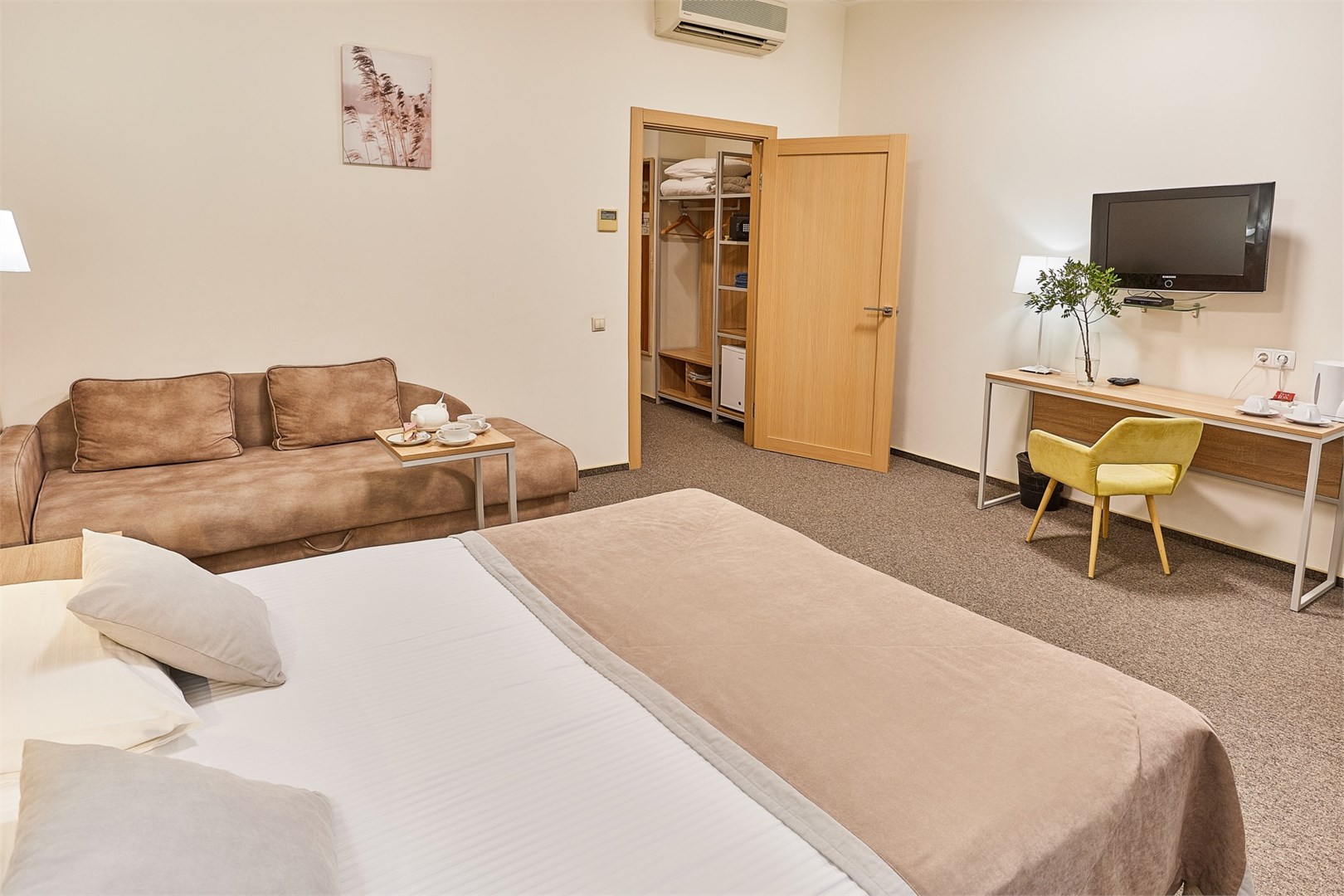 В номере: диван раскладной, кресло, кровати односпальные /одна двуспальная кровать, прикроватные тумбочки, стол, столик журнальный, стул, шкаф, кондиционер, сейф, телевизор, телефон, холодильник, чайный набор посуды, электрочайник