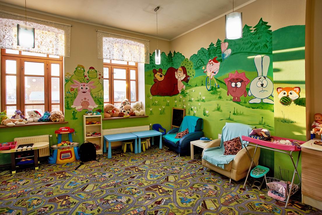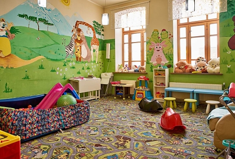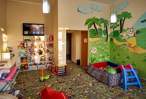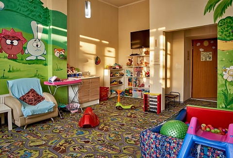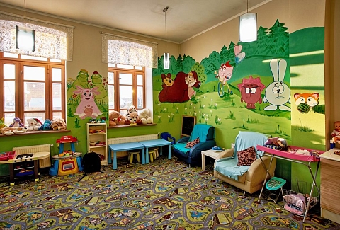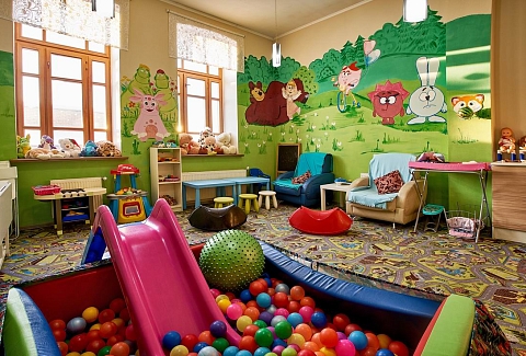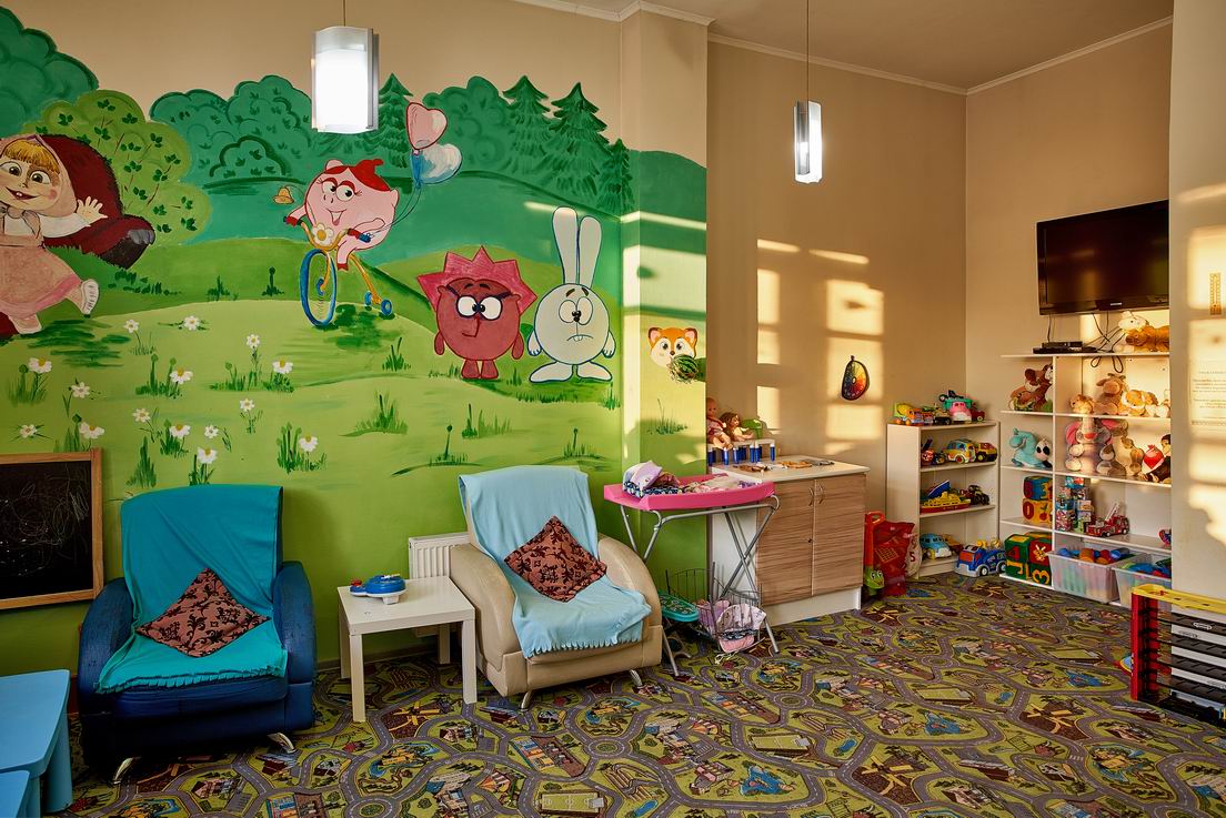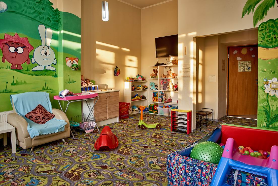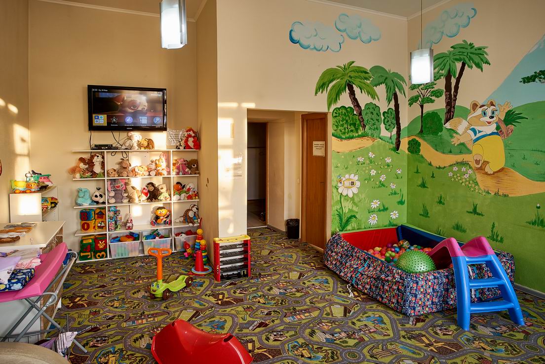 - Развлечения показ мультфильмов, детская библиотека, наборы для творчества, сухой бассейн, творческие мастерские в выходные и праздничные дни