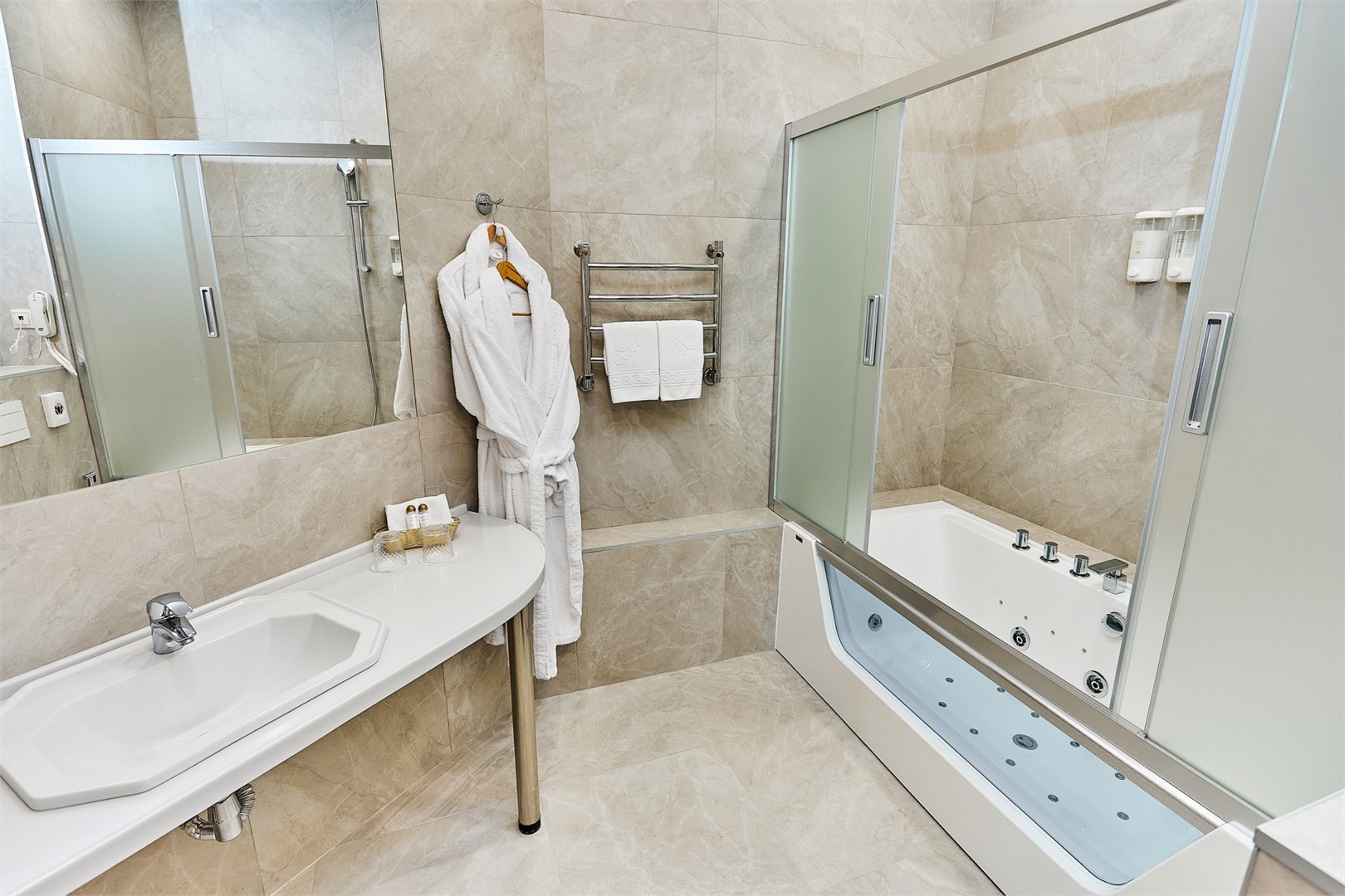 Санузел: с ванной, тапочки, туалетные принадлежности, фен, халат
