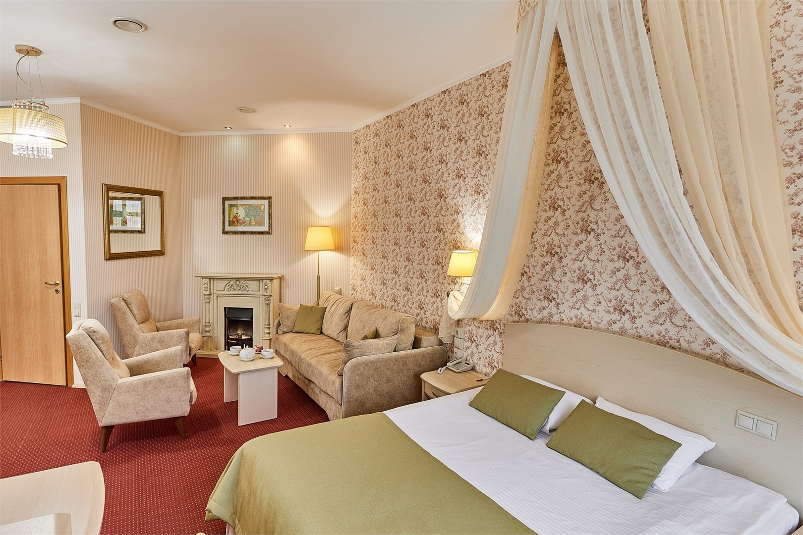 В номере: диван, кресла, кровать двуспальная, прикроватные тумбочки, стол, столик журнальный, стулья, шкаф, камин, кондиционер, сейф, телевизор, телефон, холодильник, чайный набор посуды, электрочайник
