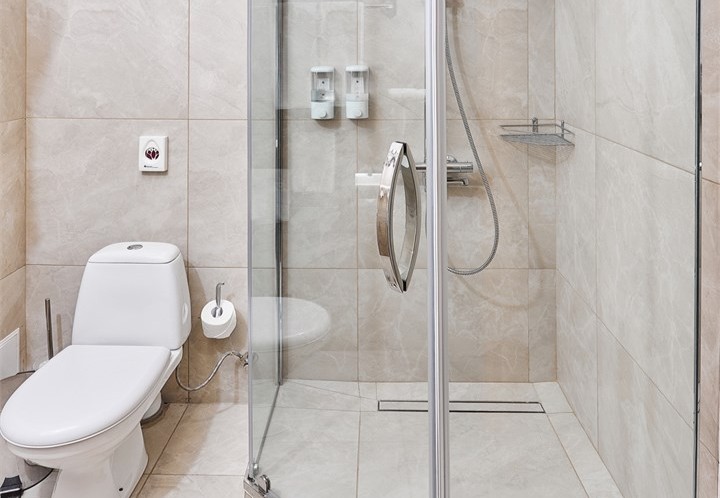 Санузел: с душем, тапочки, туалетные принадлежности, фен, халат