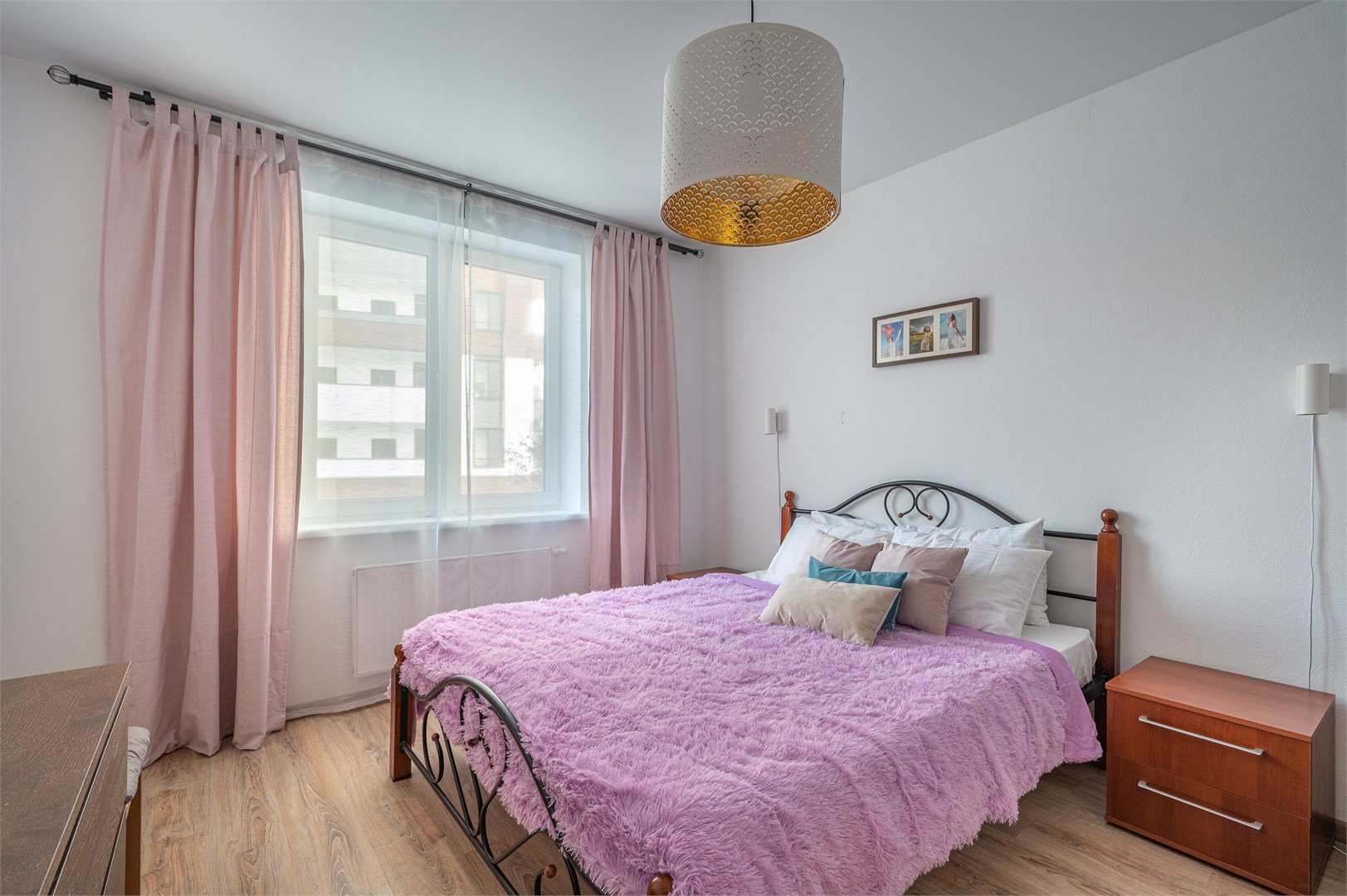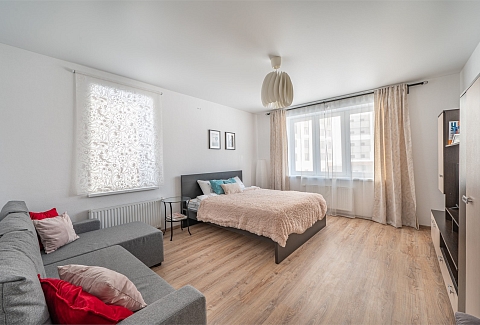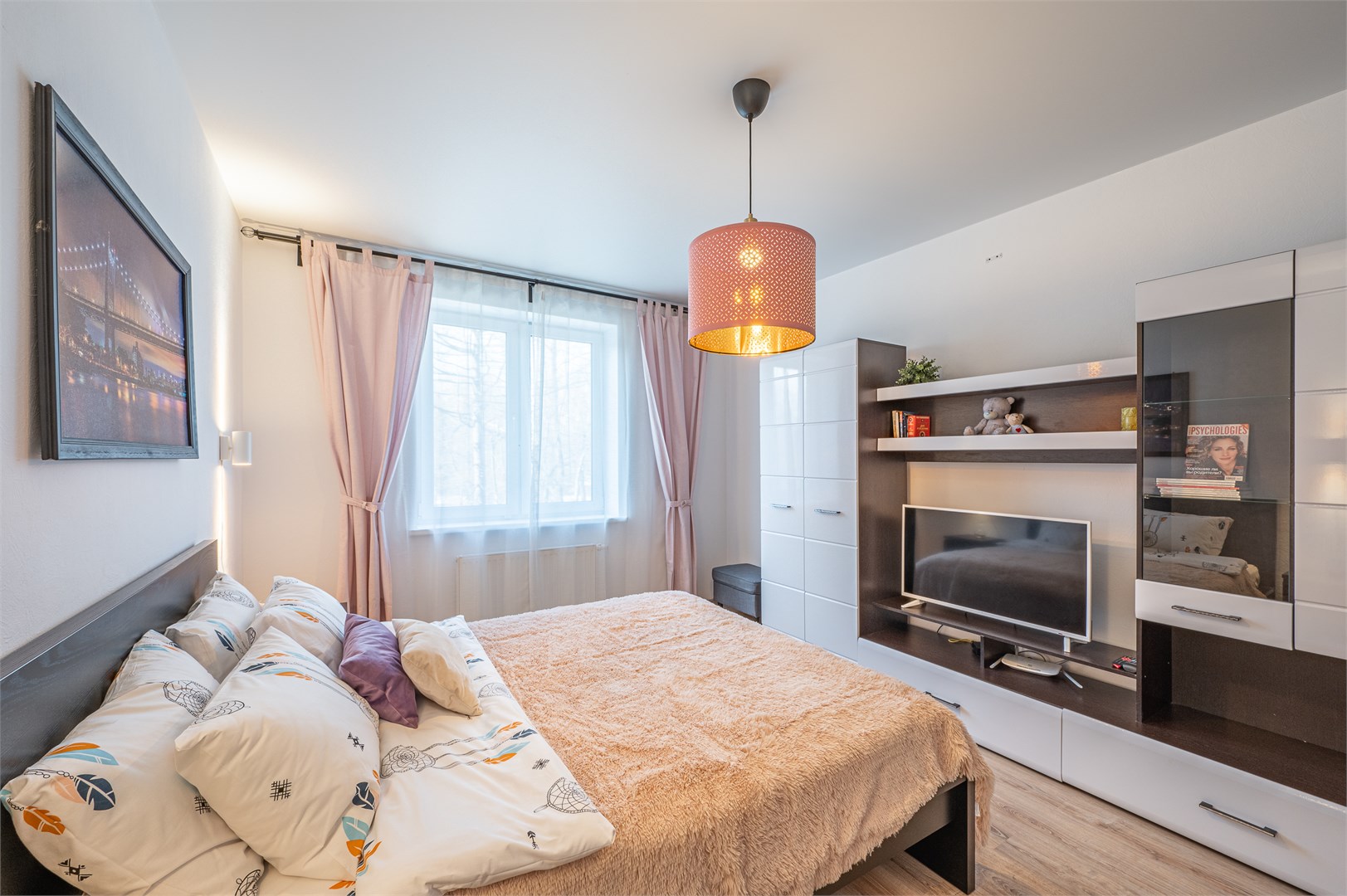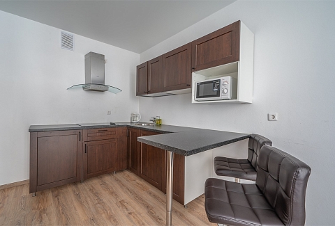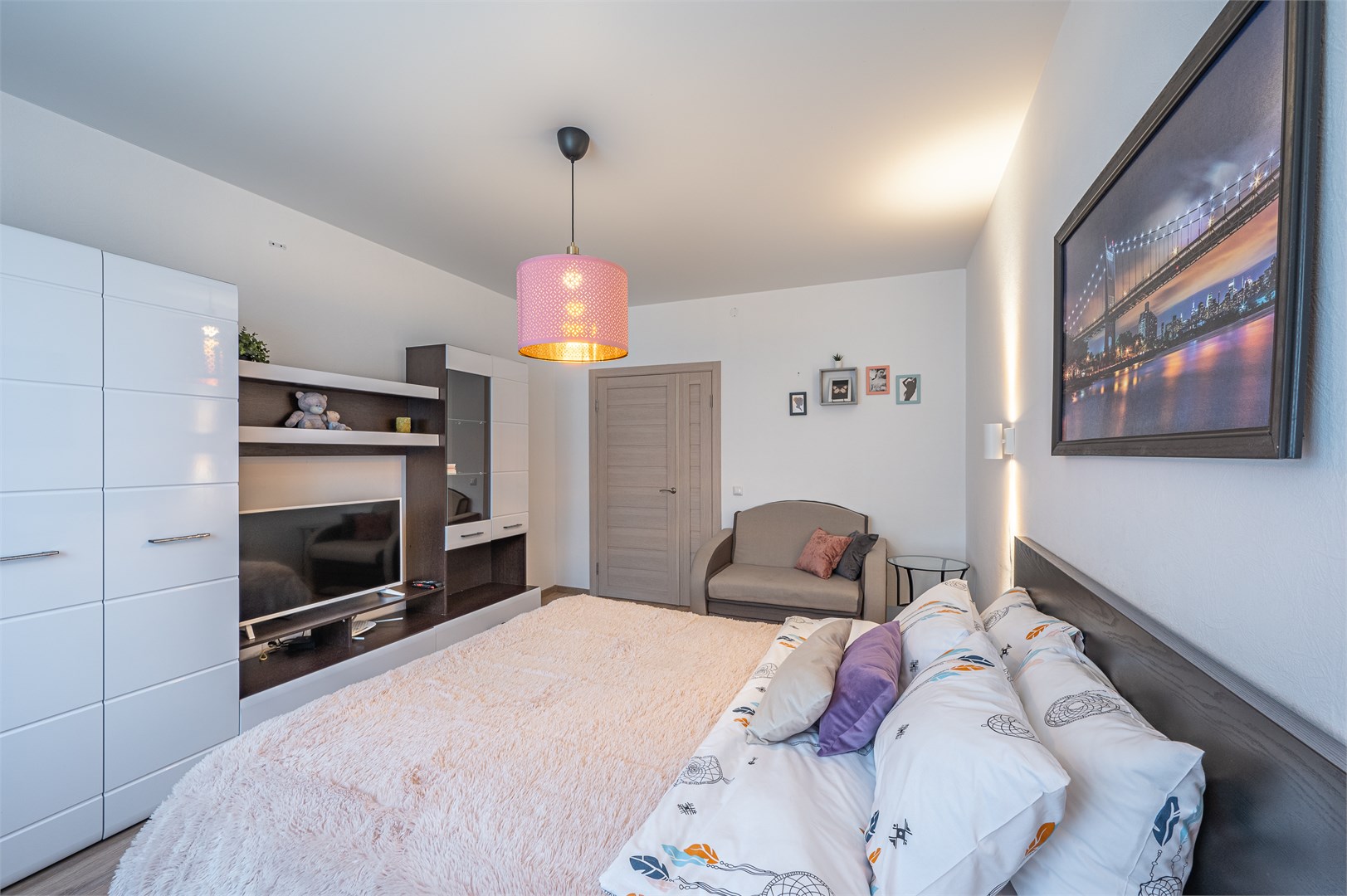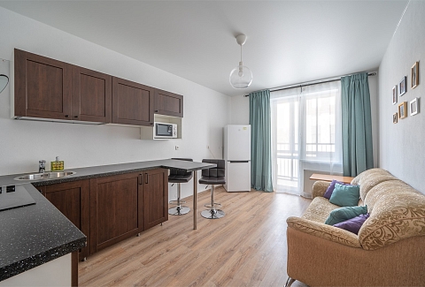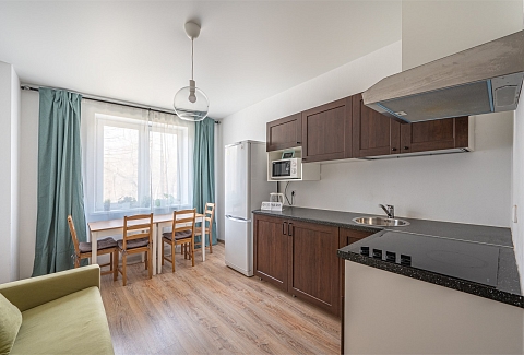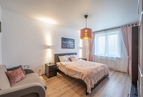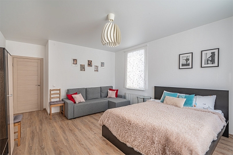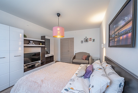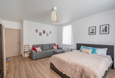 В номере: диван раскладной, кровать двуспальная, прикроватные тумбочки, стол, стулья, шкаф, гладильная доска, микроволновая печь, набор посуды, плита электрическая, стиральная машина, телевизор, утюг, холодильник, чайник