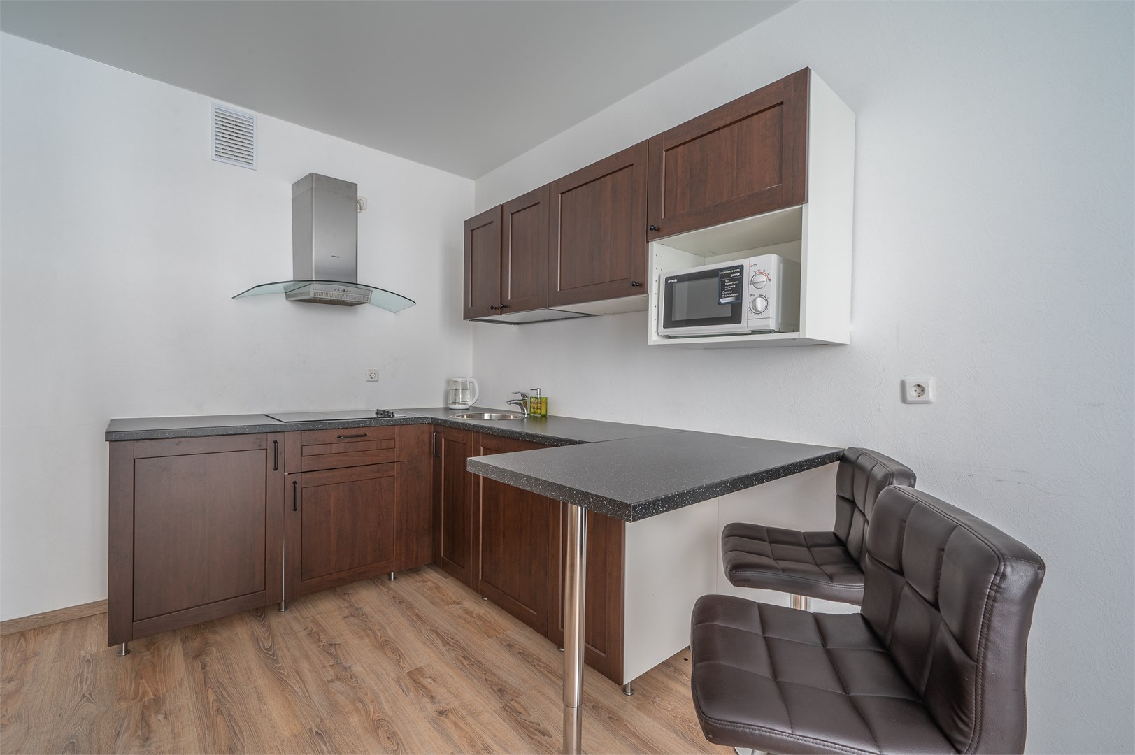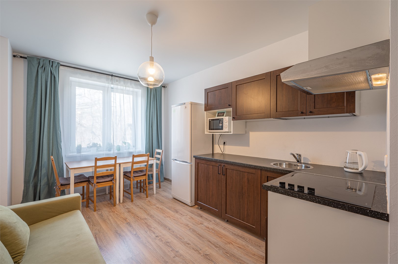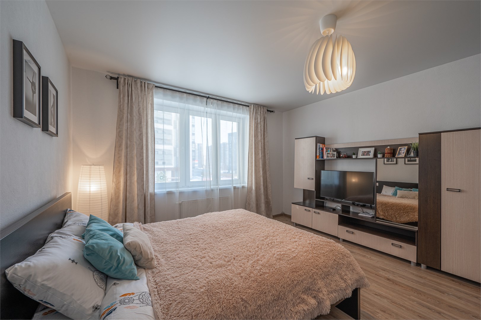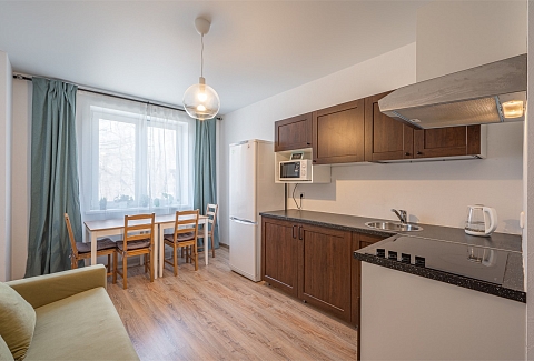 В номере: диван раскладной, кровать двуспальная, прикроватные тумбочки, стол, стулья, шкаф, гладильная доска, микроволновая печь, набор посуды, плита электрическая, стиральная машина, телевизор, утюг, холодильник, чайник