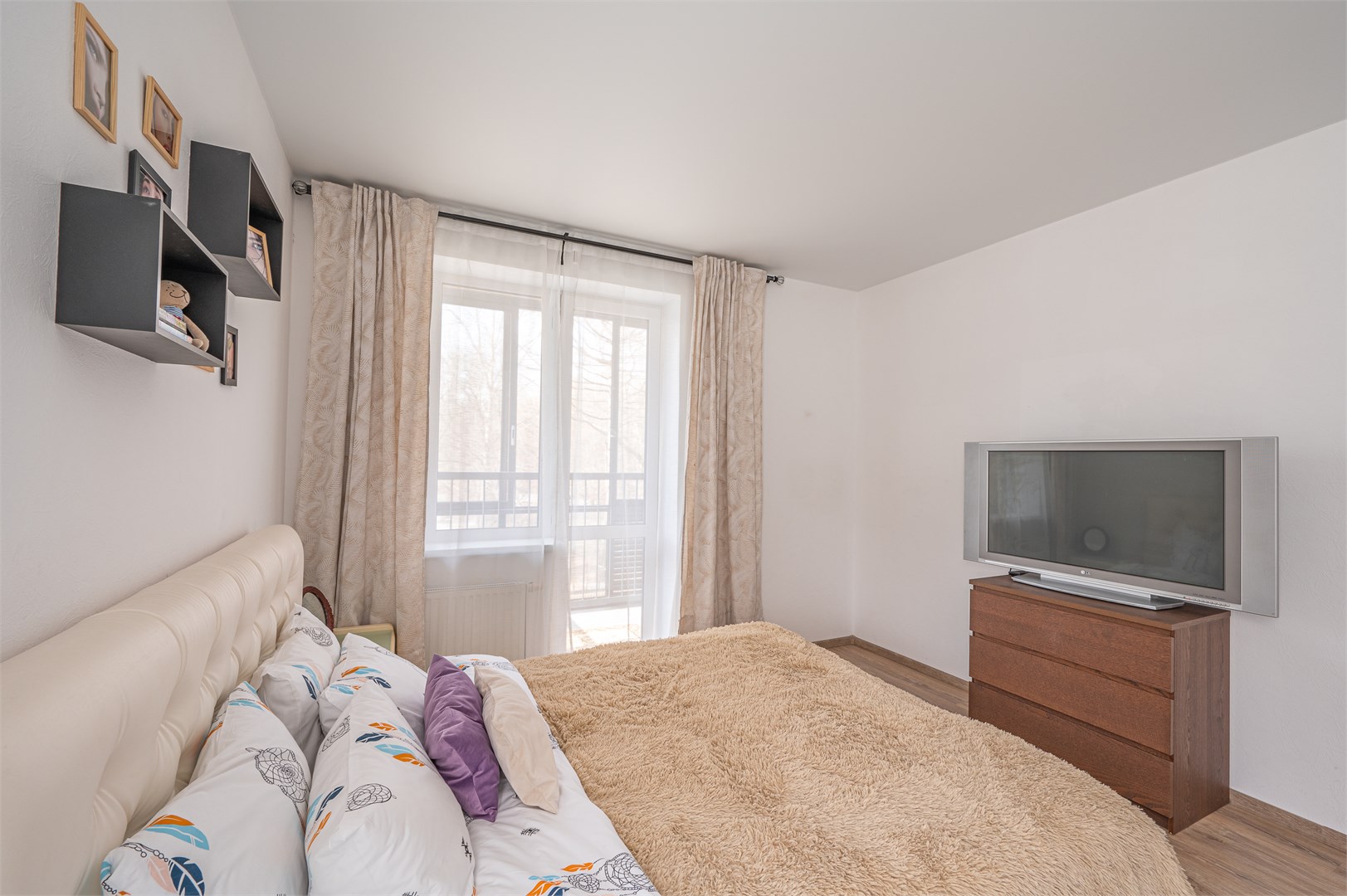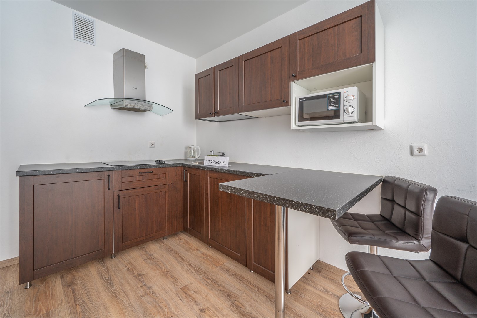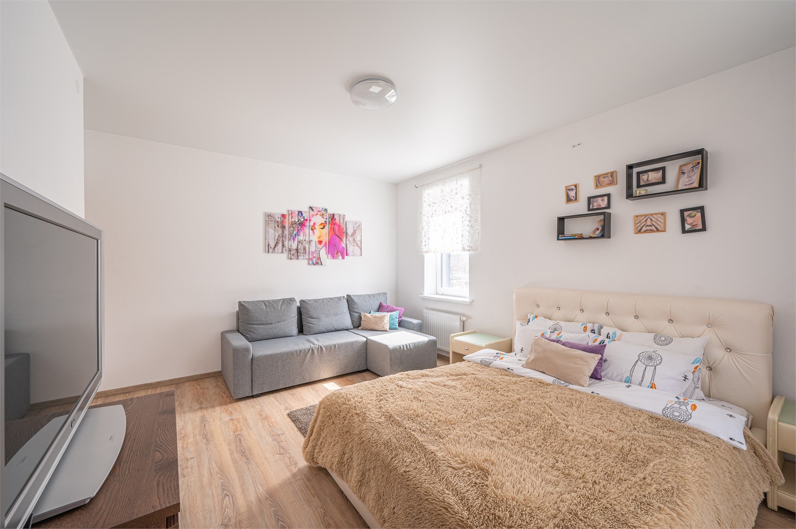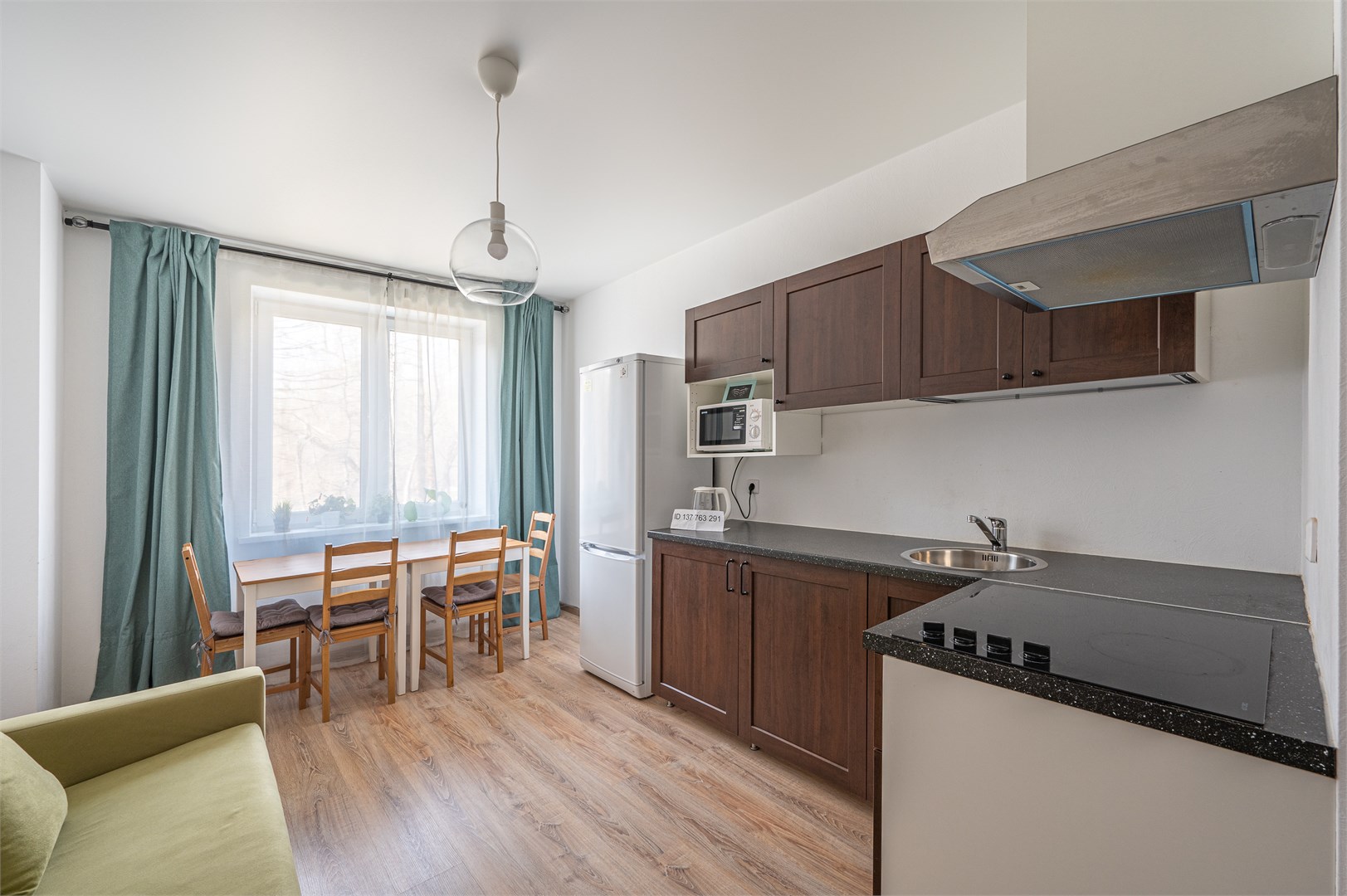 В номере: диван раскладной, кровать двуспальная, прикроватные тумбочки, стол, стулья, шкаф, гладильная доска, микроволновая печь, набор посуды, плита электрическая, стиральная машина, телевизор, утюг, холодильник, чайник
