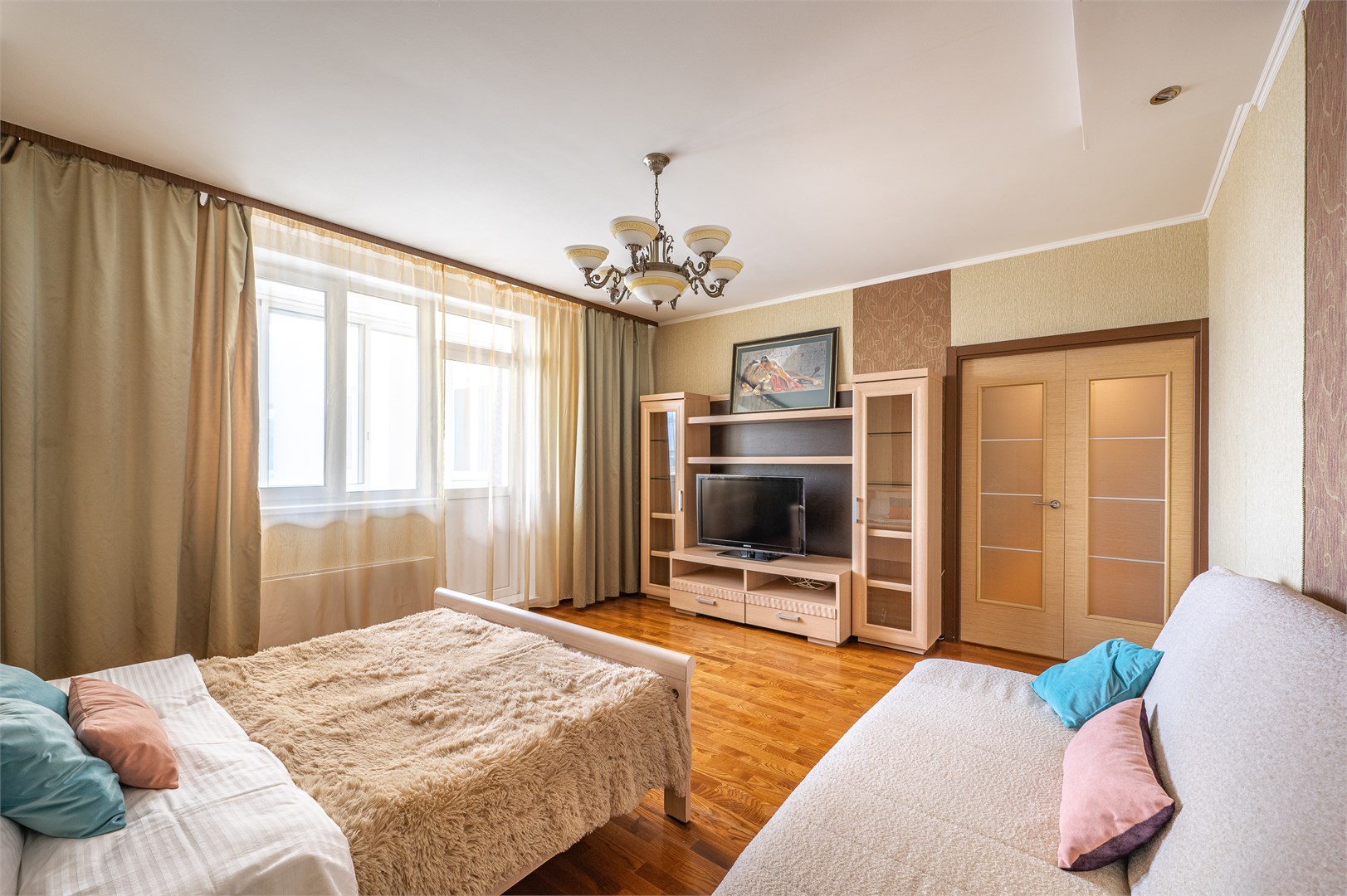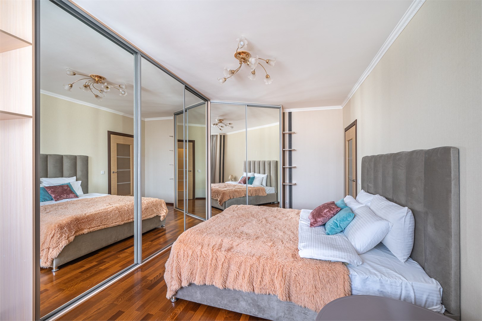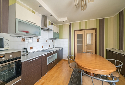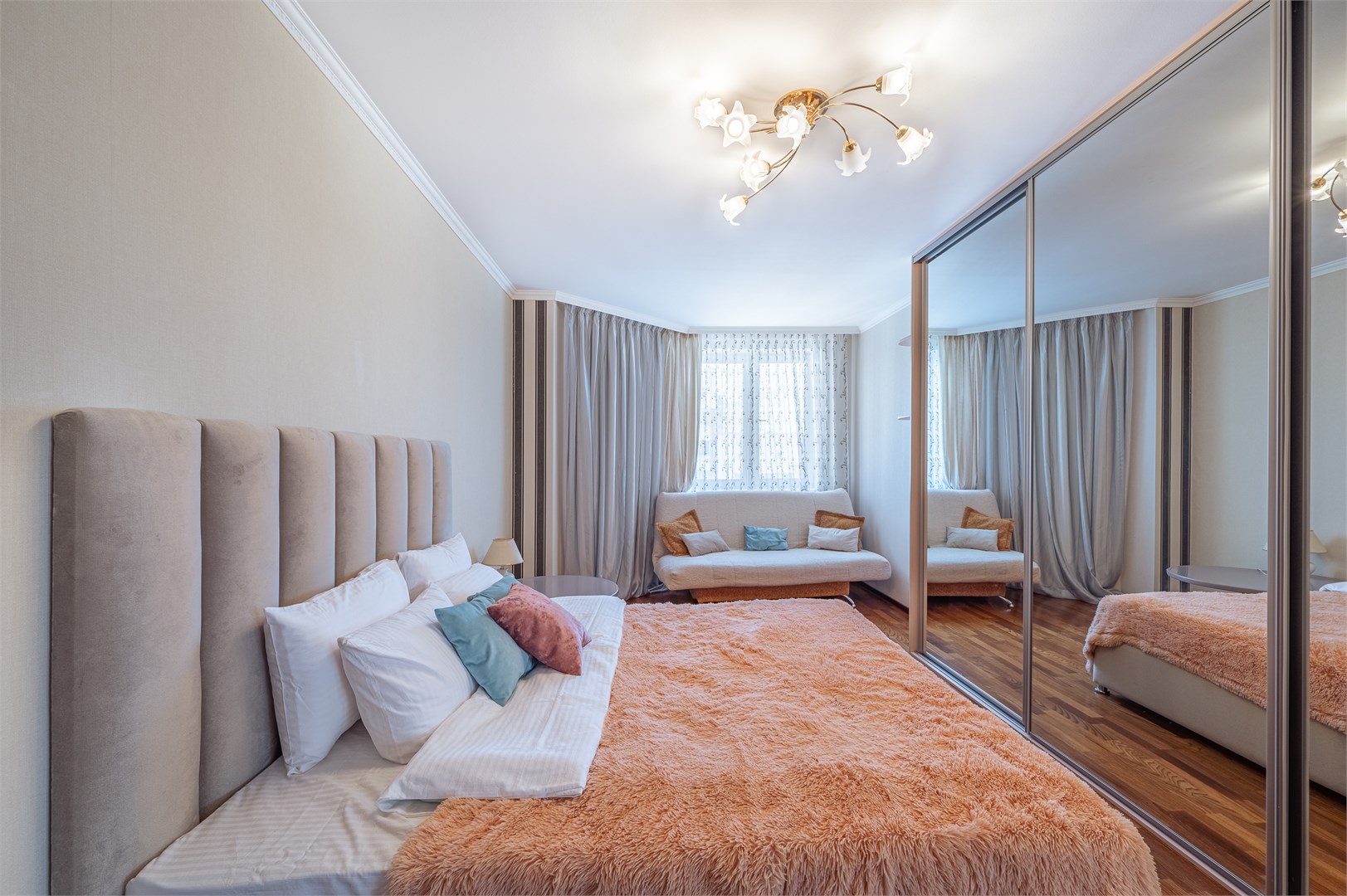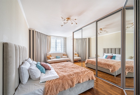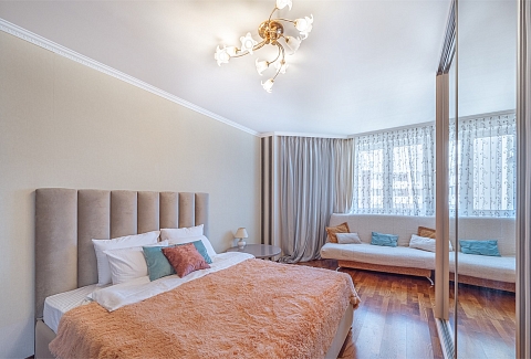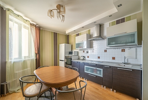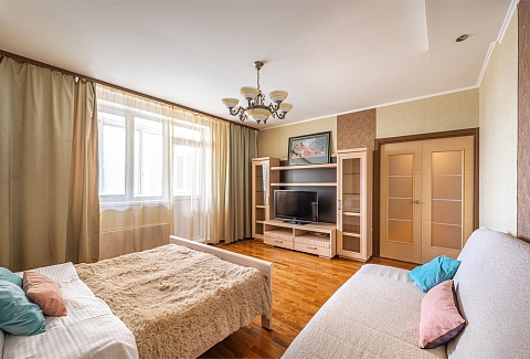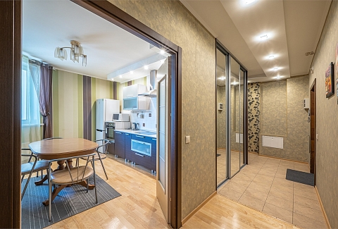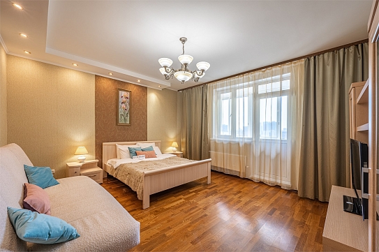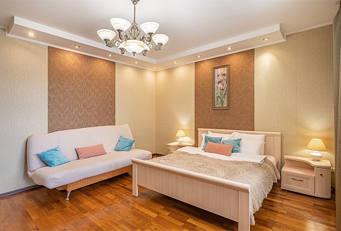 В номере: вешалка, диван, зеркало, кровать двуспальная, кухонная мебель, прикроватные тумбочки, стеллаж, стол обеденный, стулья, шкаф, гладильная доска, духовой шкаф, микроволновая печь, набор посуды, плита электрическая, стиральная машина, сушилка для белья, телевизор, утюг, холодильник, чайный набор посуды, электрочайник