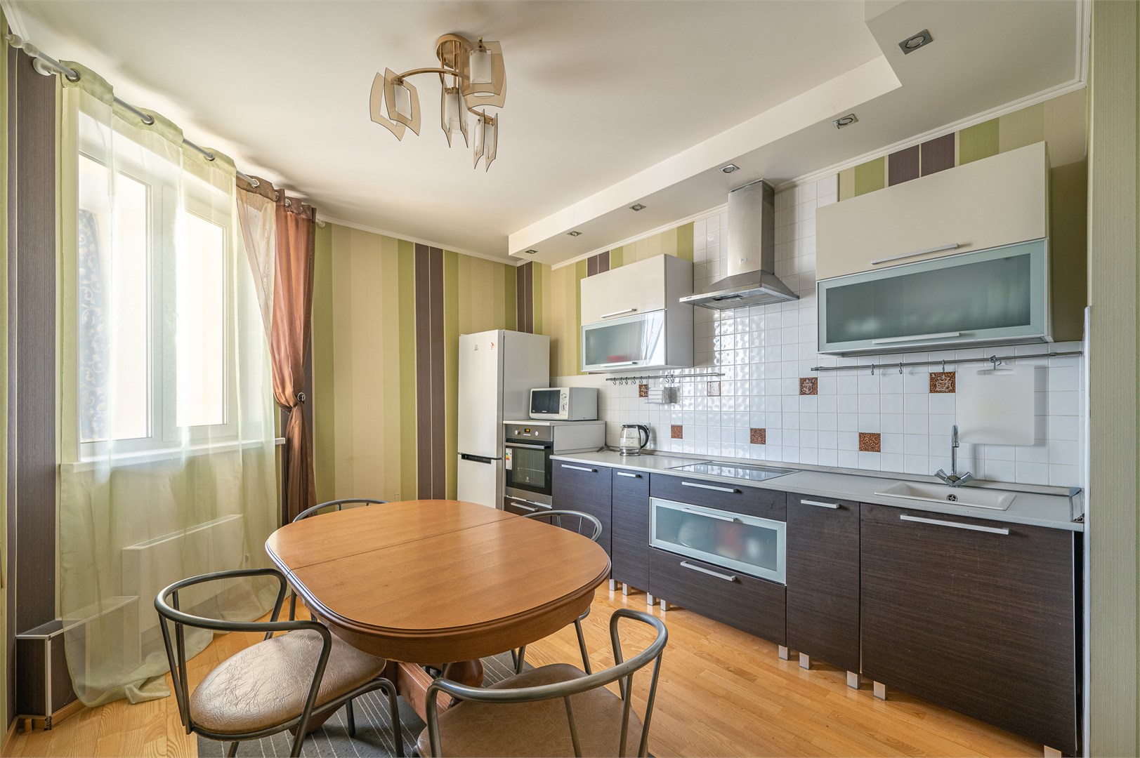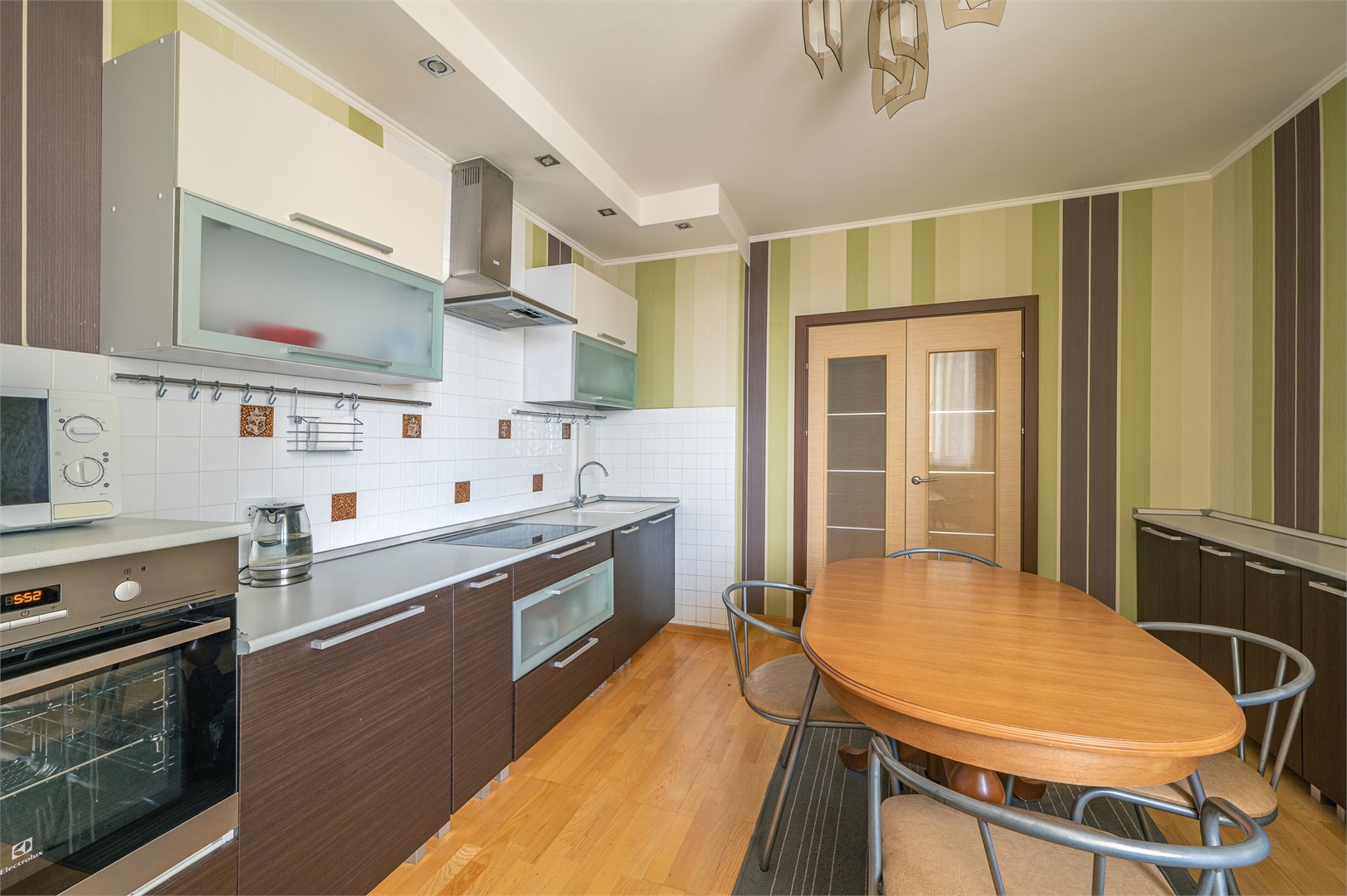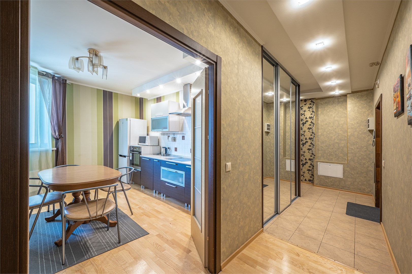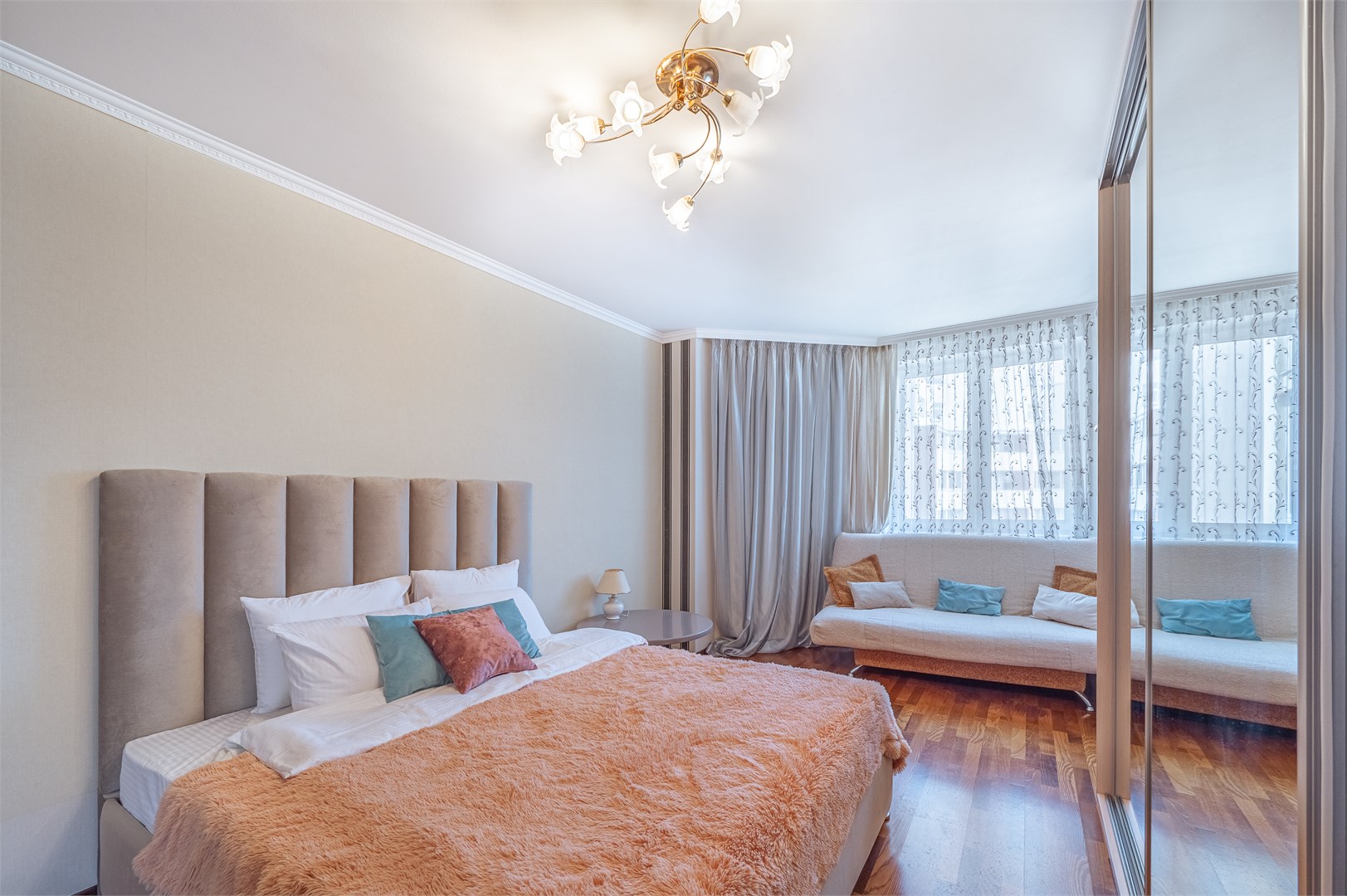 В номере: вешалка, диван, зеркало, кровать двуспальная, кухонная мебель, прикроватные тумбочки, стеллаж, стол обеденный, стулья, шкаф, гладильная доска, духовой шкаф, микроволновая печь, набор посуды, плита электрическая, стиральная машина, сушилка для белья, телевизор, утюг, холодильник, чайный набор посуды, электрочайник