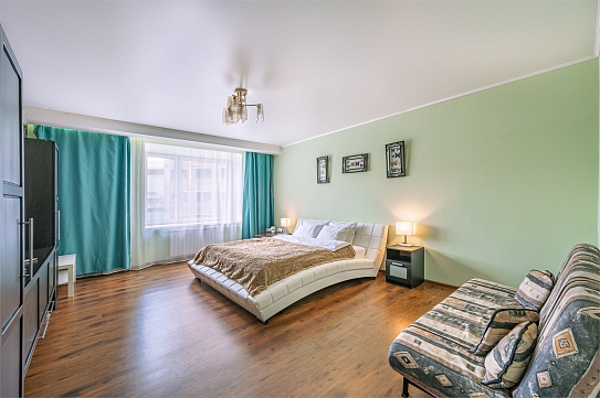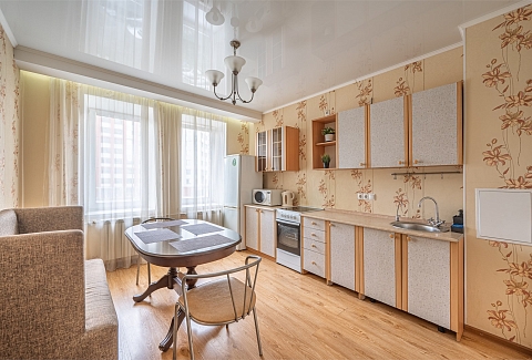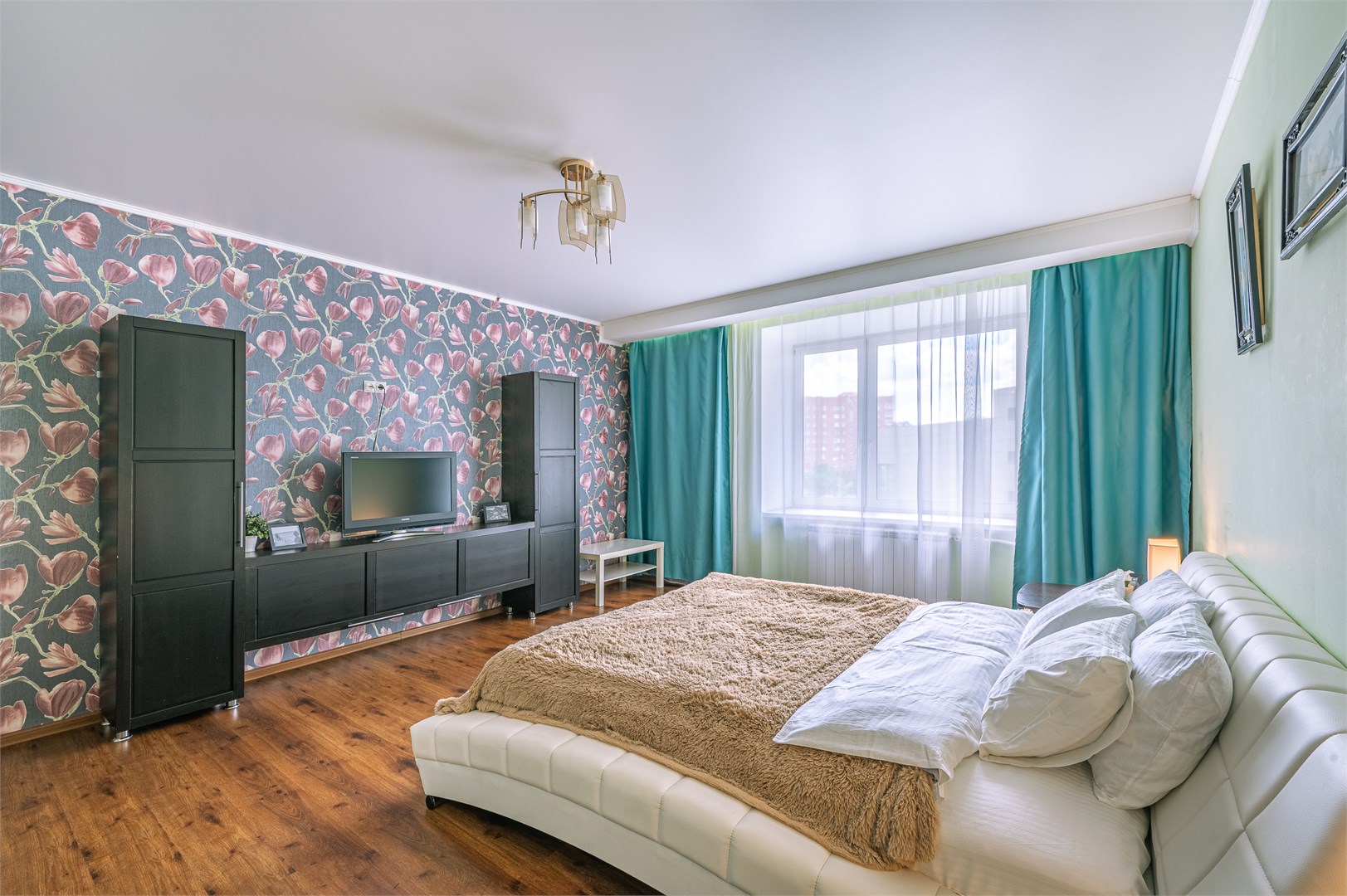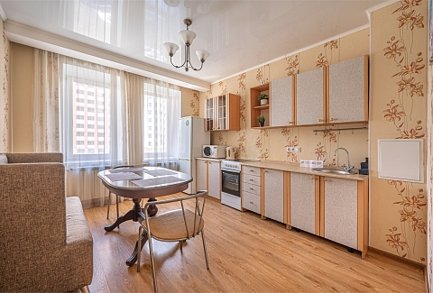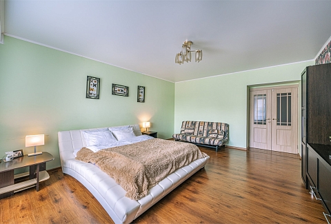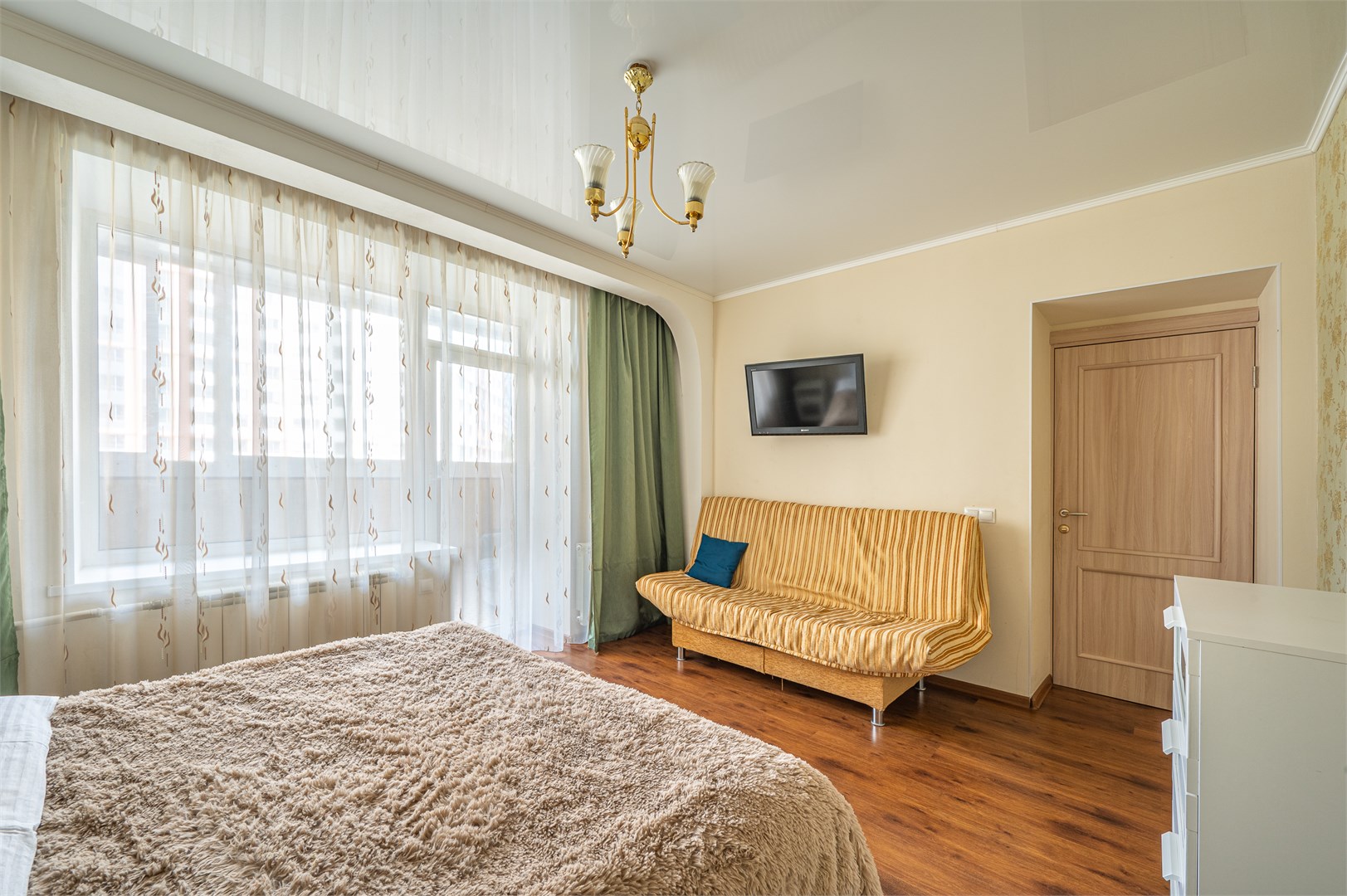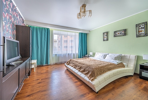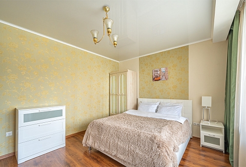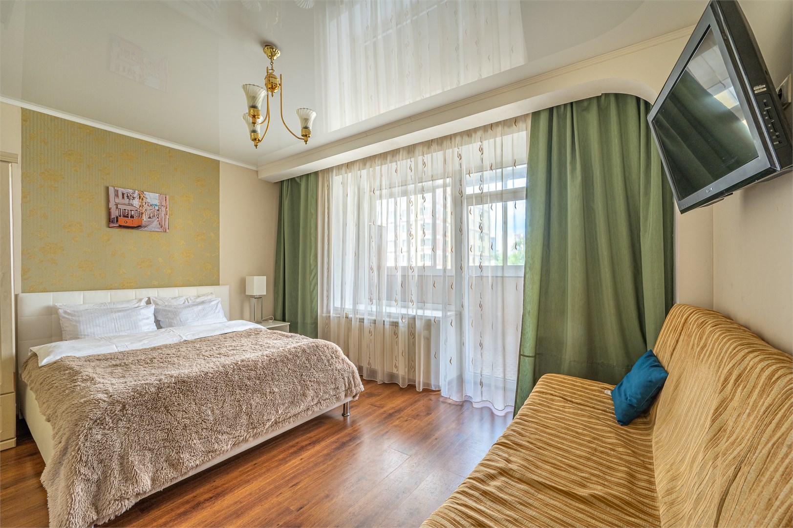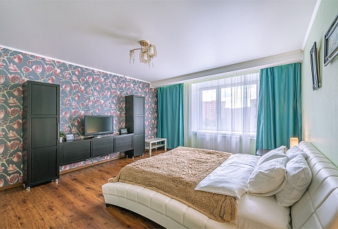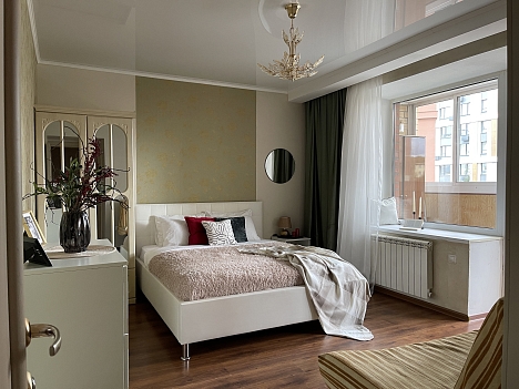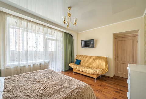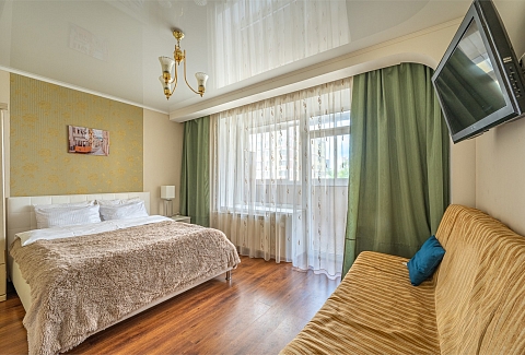 В номере: диван раскладной, зеркало, кровать двуспальная, прикроватные тумбочки, стол, стулья, шкаф, кондиционер, микроволновая печь, набор посуды, плита электрическая, стиральная машина, телевизор, холодильник, чайник