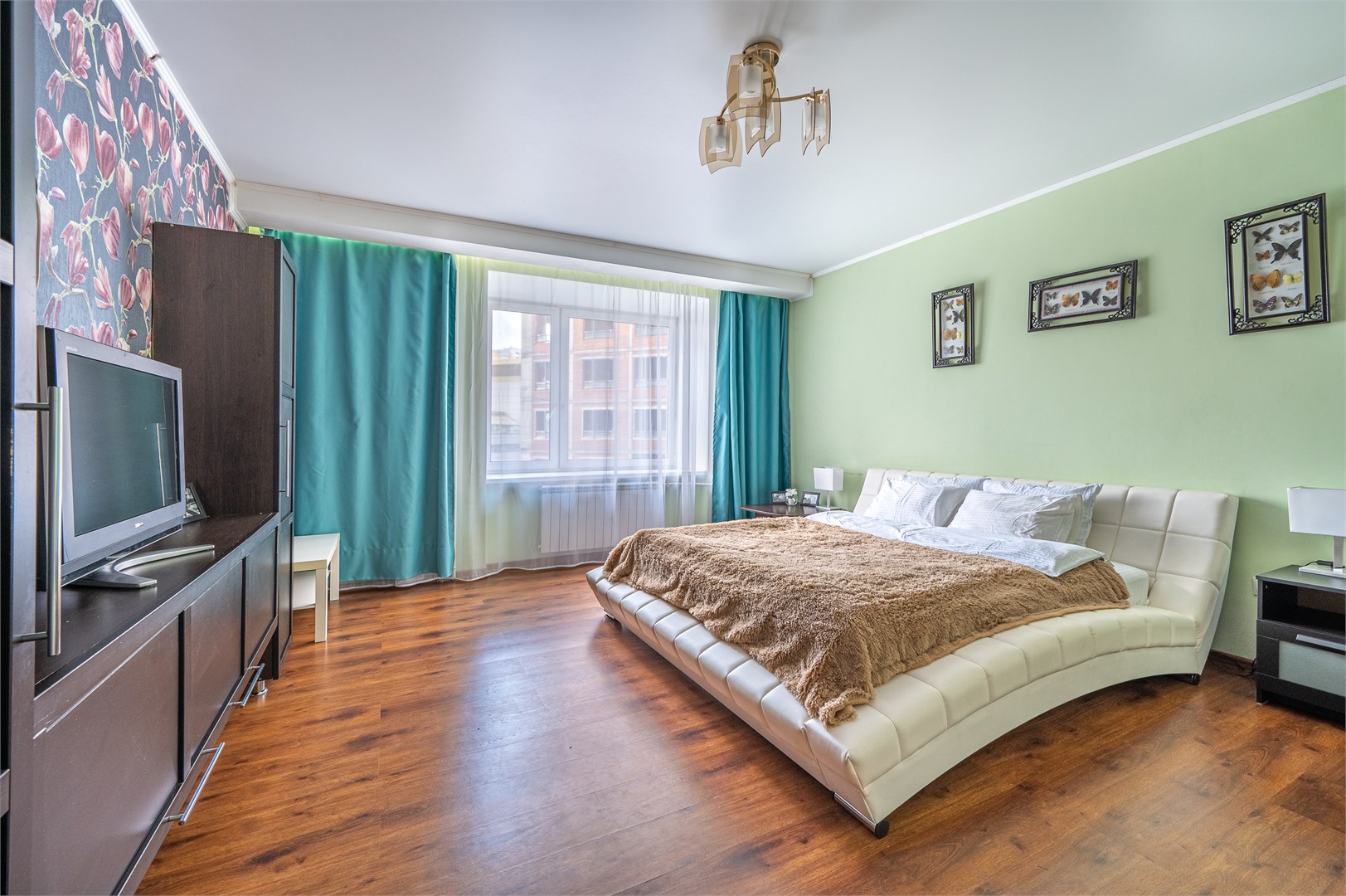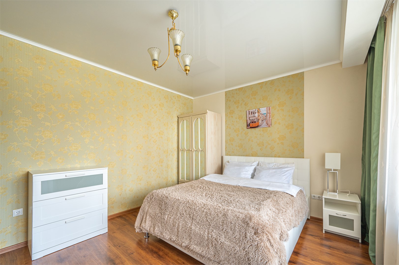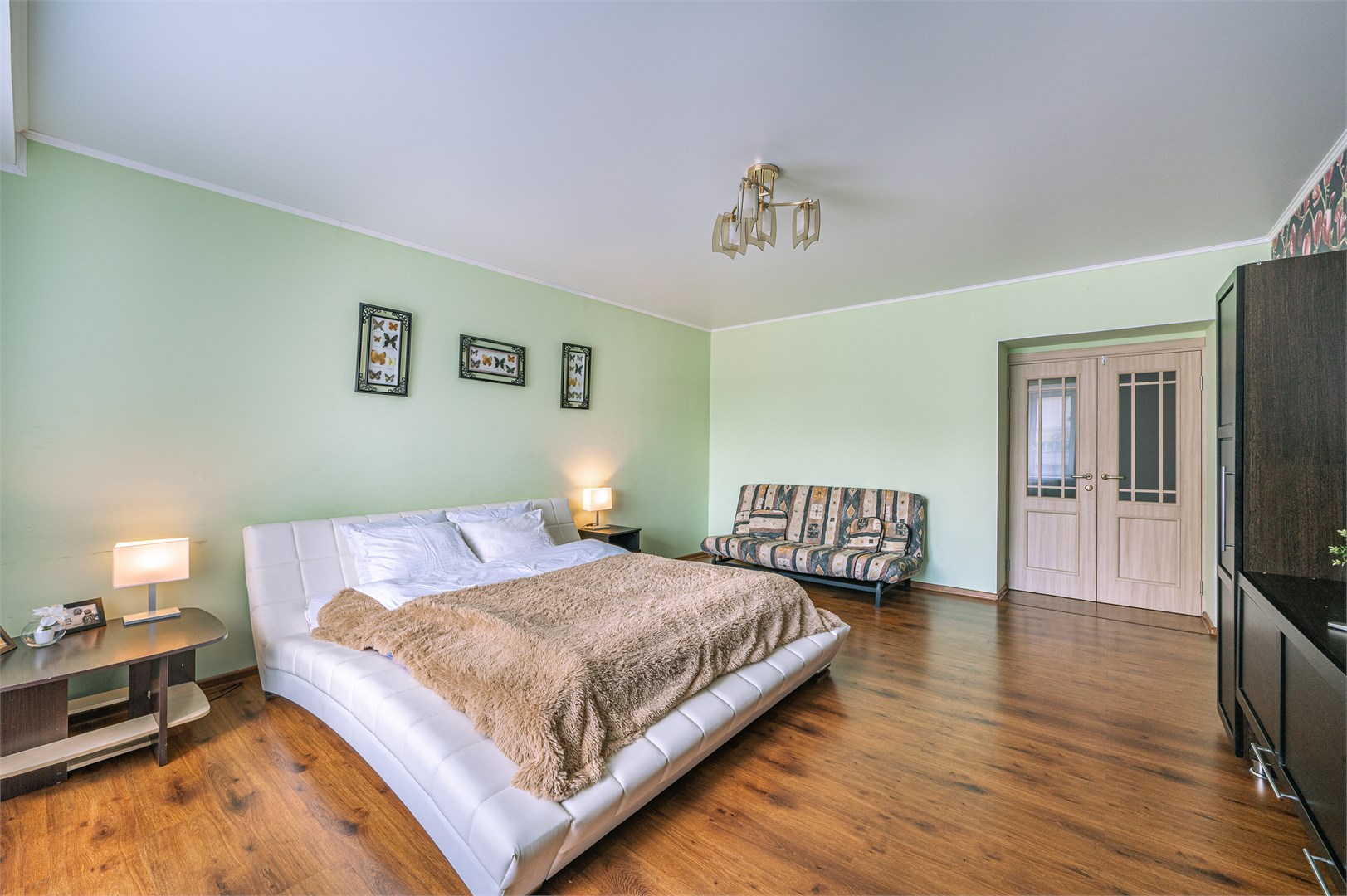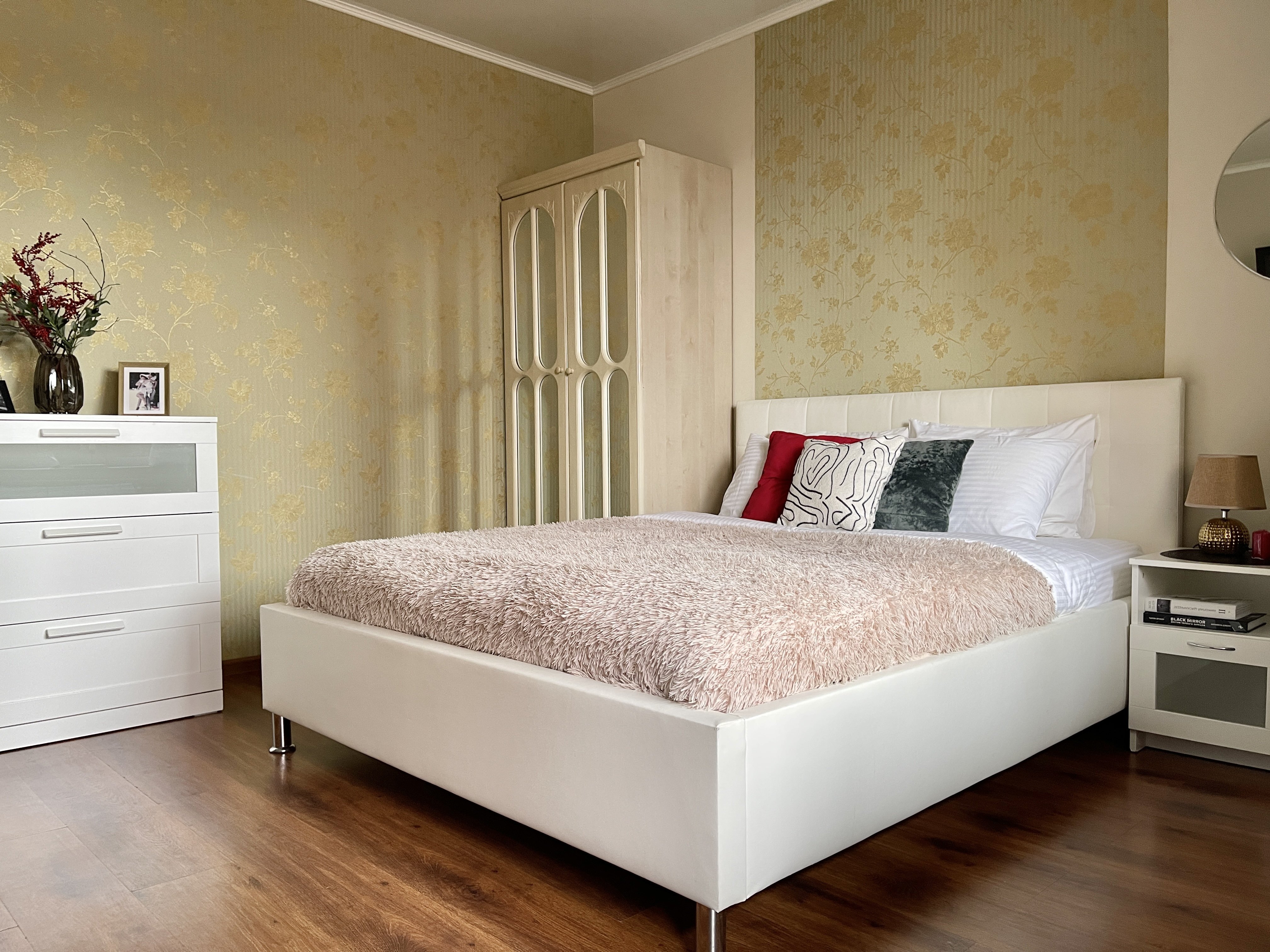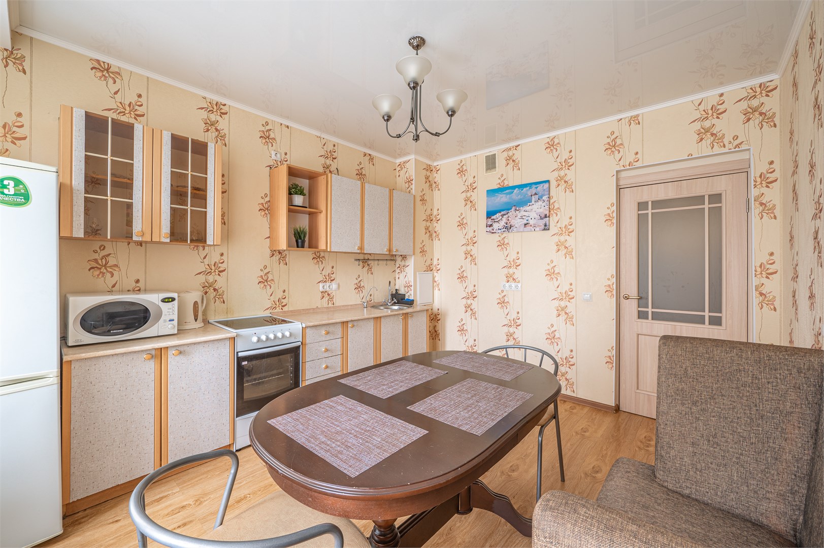 В номере: диван раскладной, зеркало, кровать двуспальная, прикроватные тумбочки, стол, стулья, шкаф, кондиционер, микроволновая печь, набор посуды, плита электрическая, стиральная машина, телевизор, холодильник, чайник