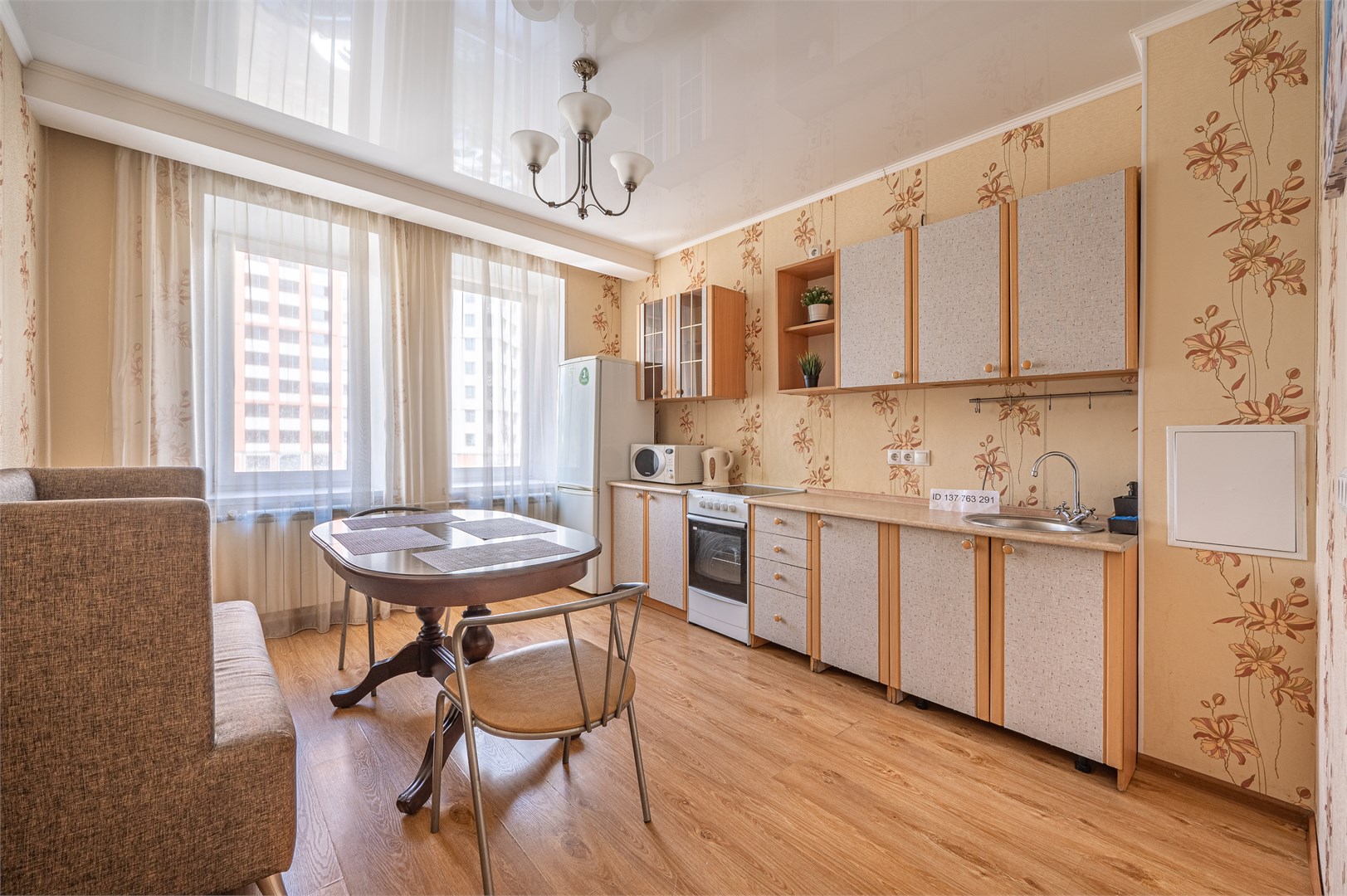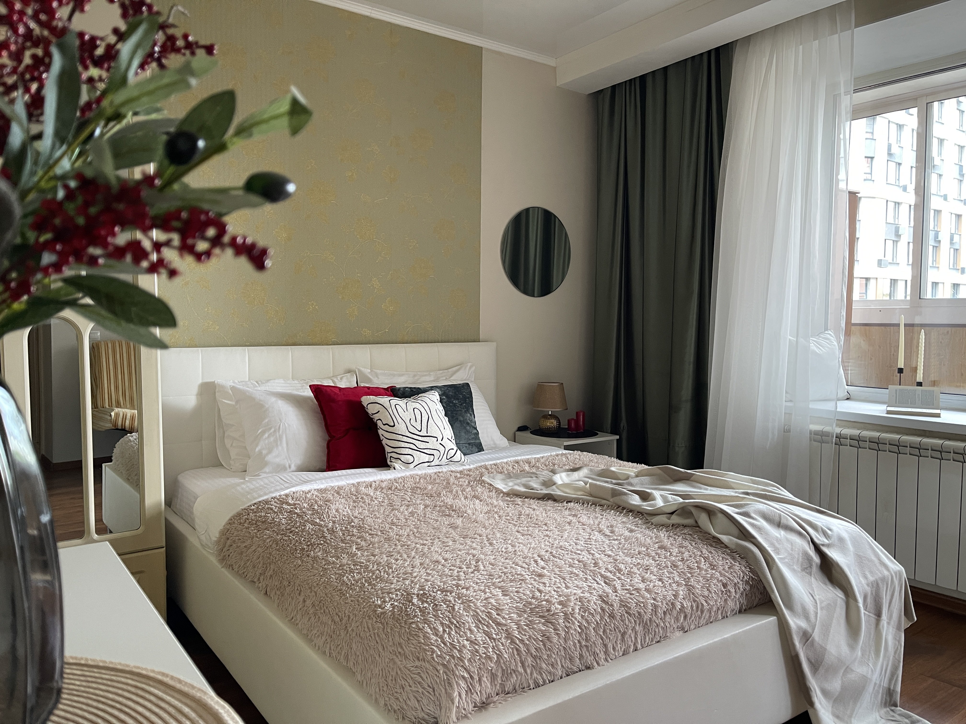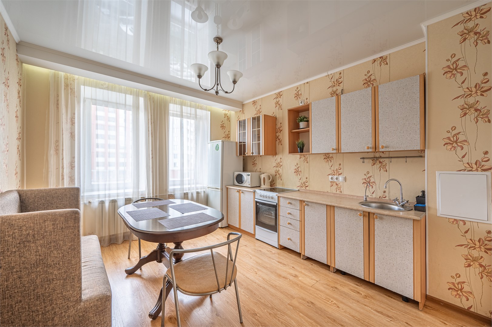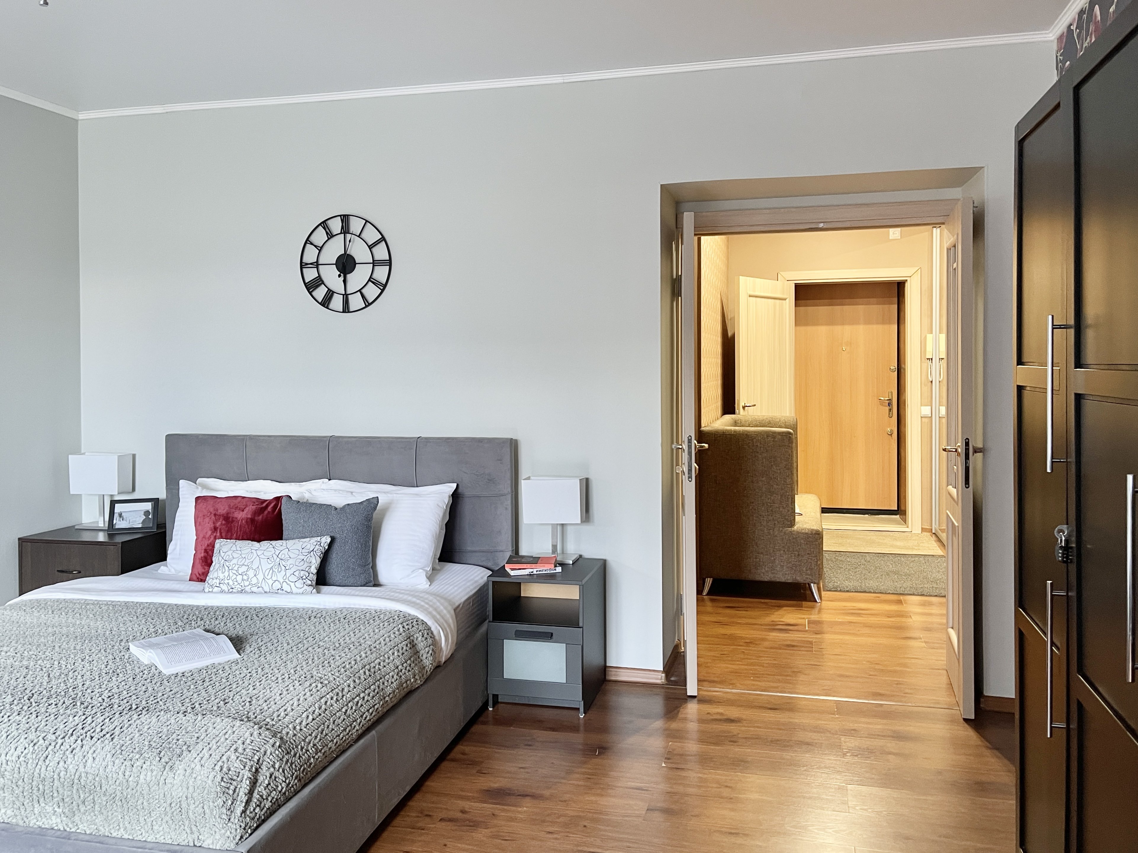 В номере: диван раскладной, зеркало, кровать двуспальная, прикроватные тумбочки, стол, стулья, шкаф, кондиционер, микроволновая печь, набор посуды, плита электрическая, стиральная машина, телевизор, холодильник, чайник
