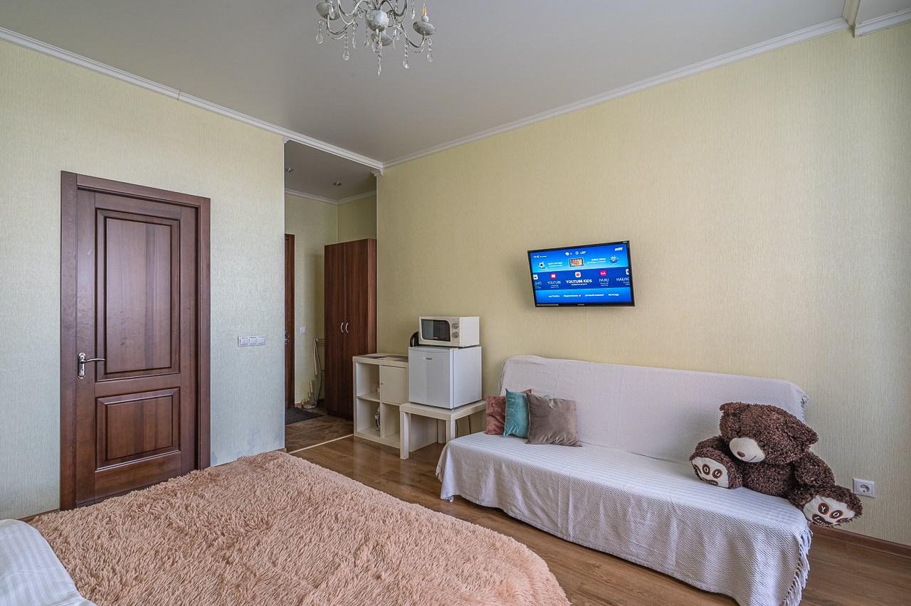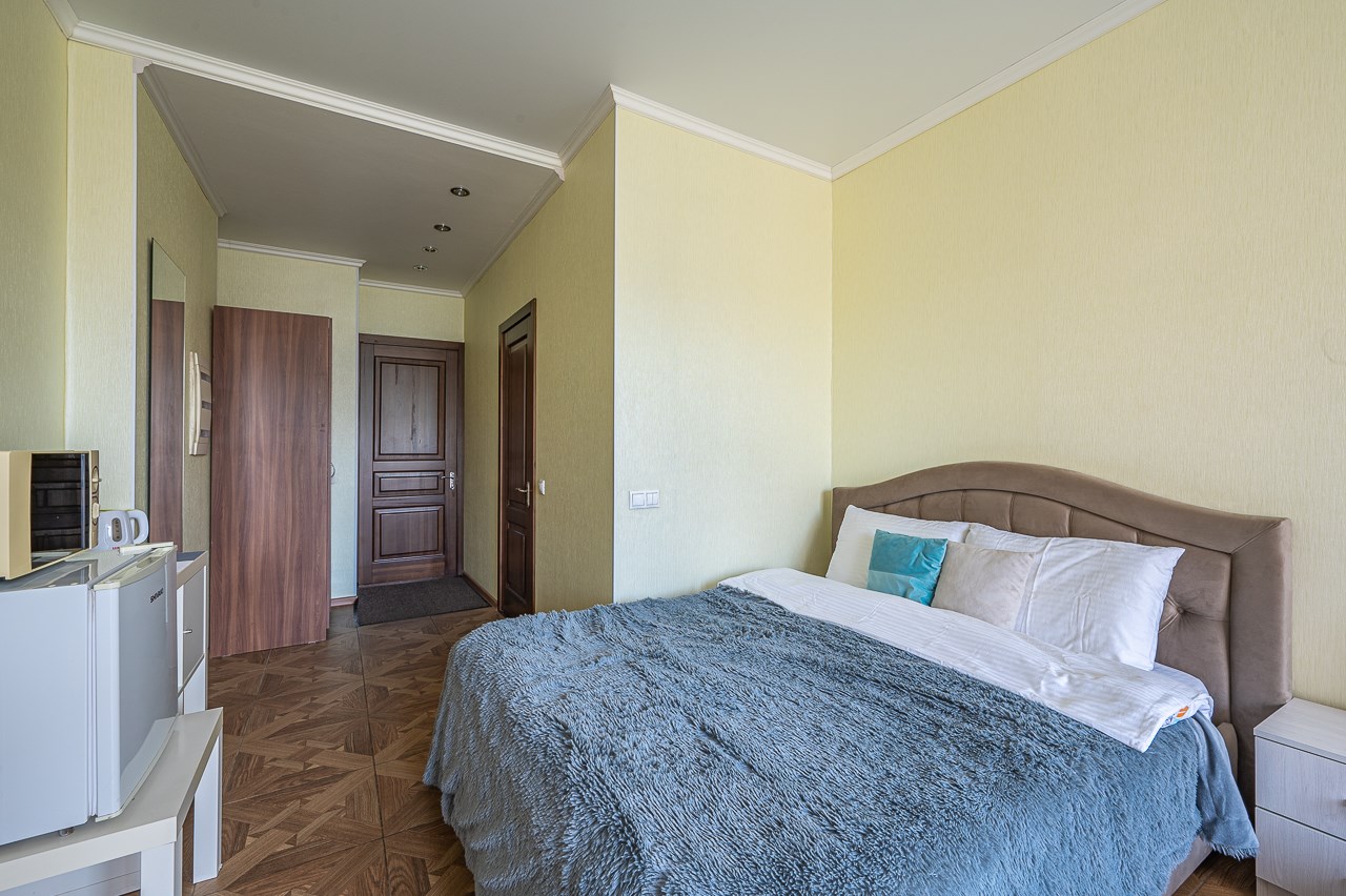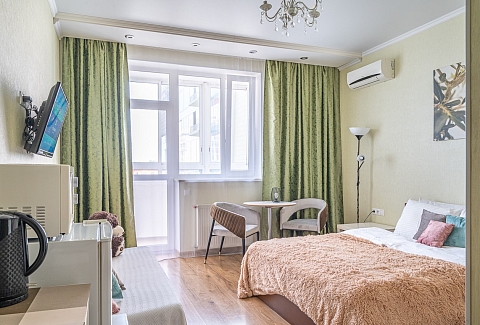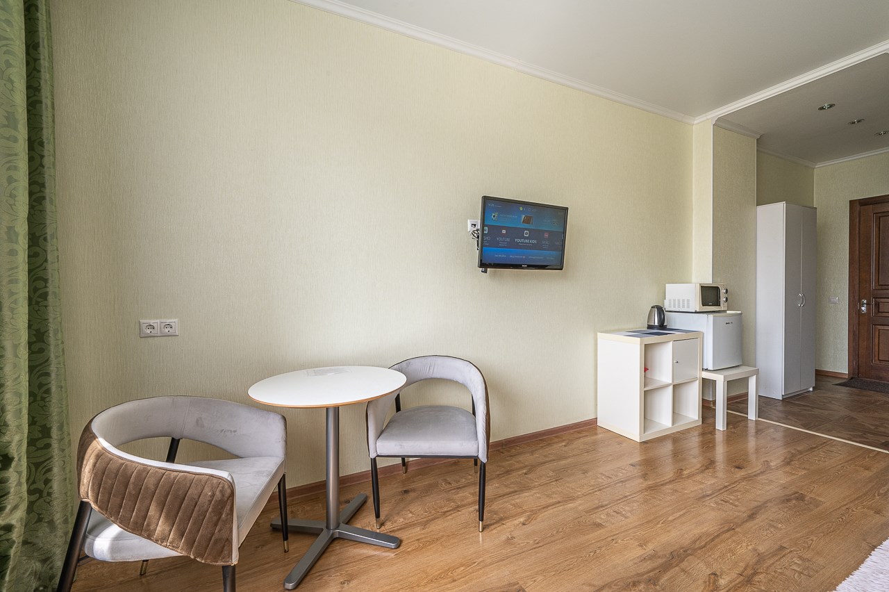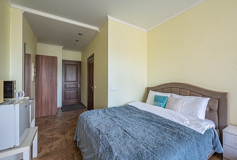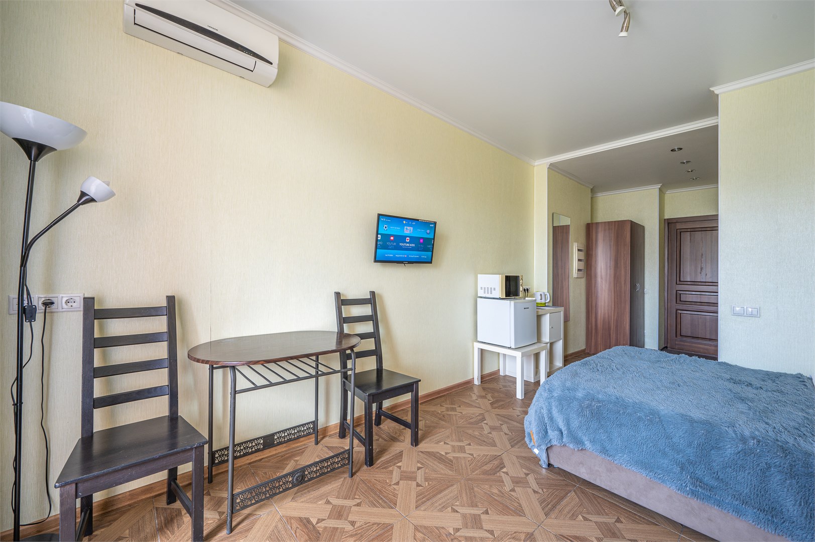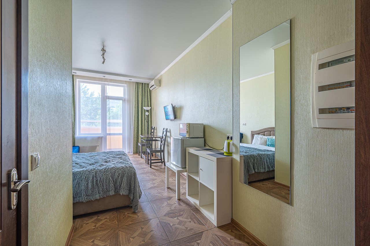 В номере: диван, зеркало, кровать двуспальная, прикроватные тумбочки, стол, стулья, шкаф, кондиционер, микроволновая печь, мини-холодильник, телевизор, чайник