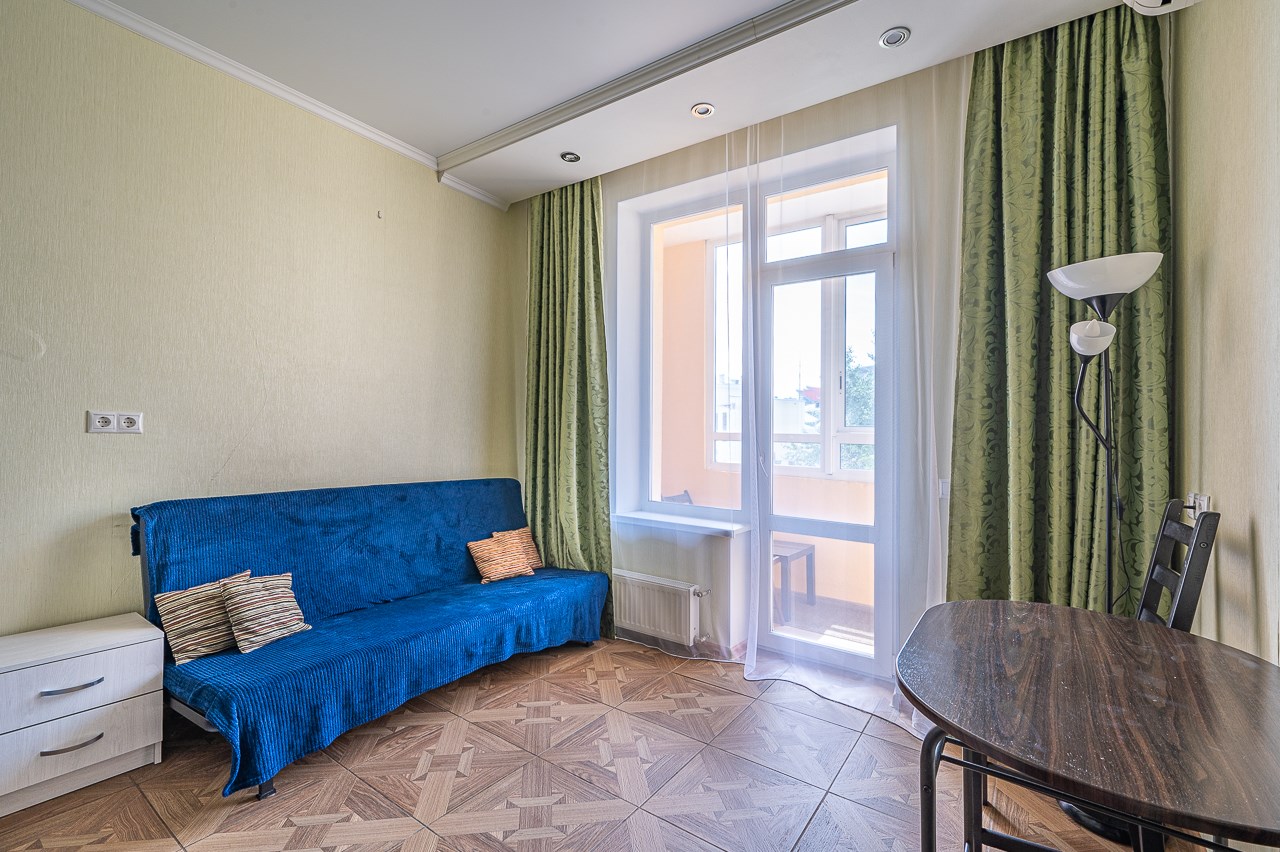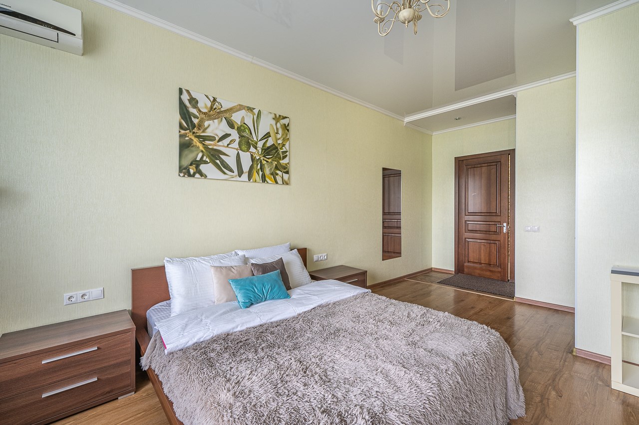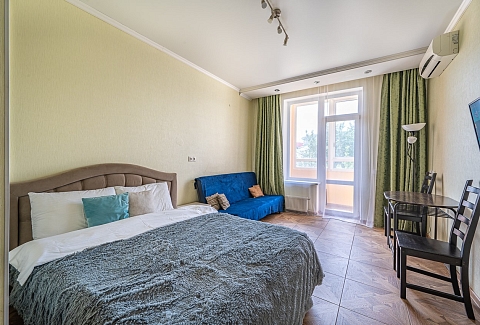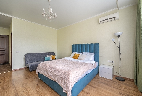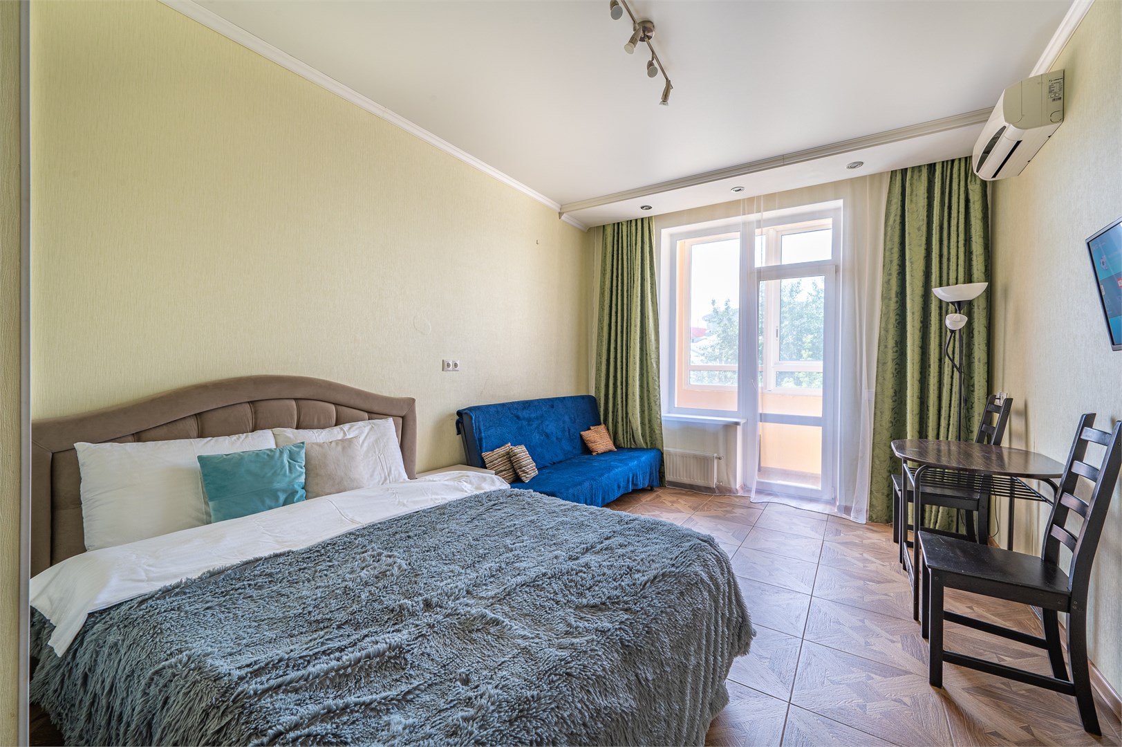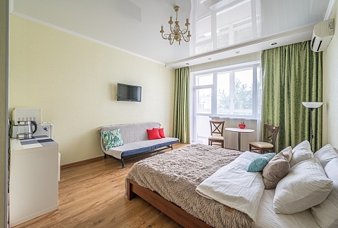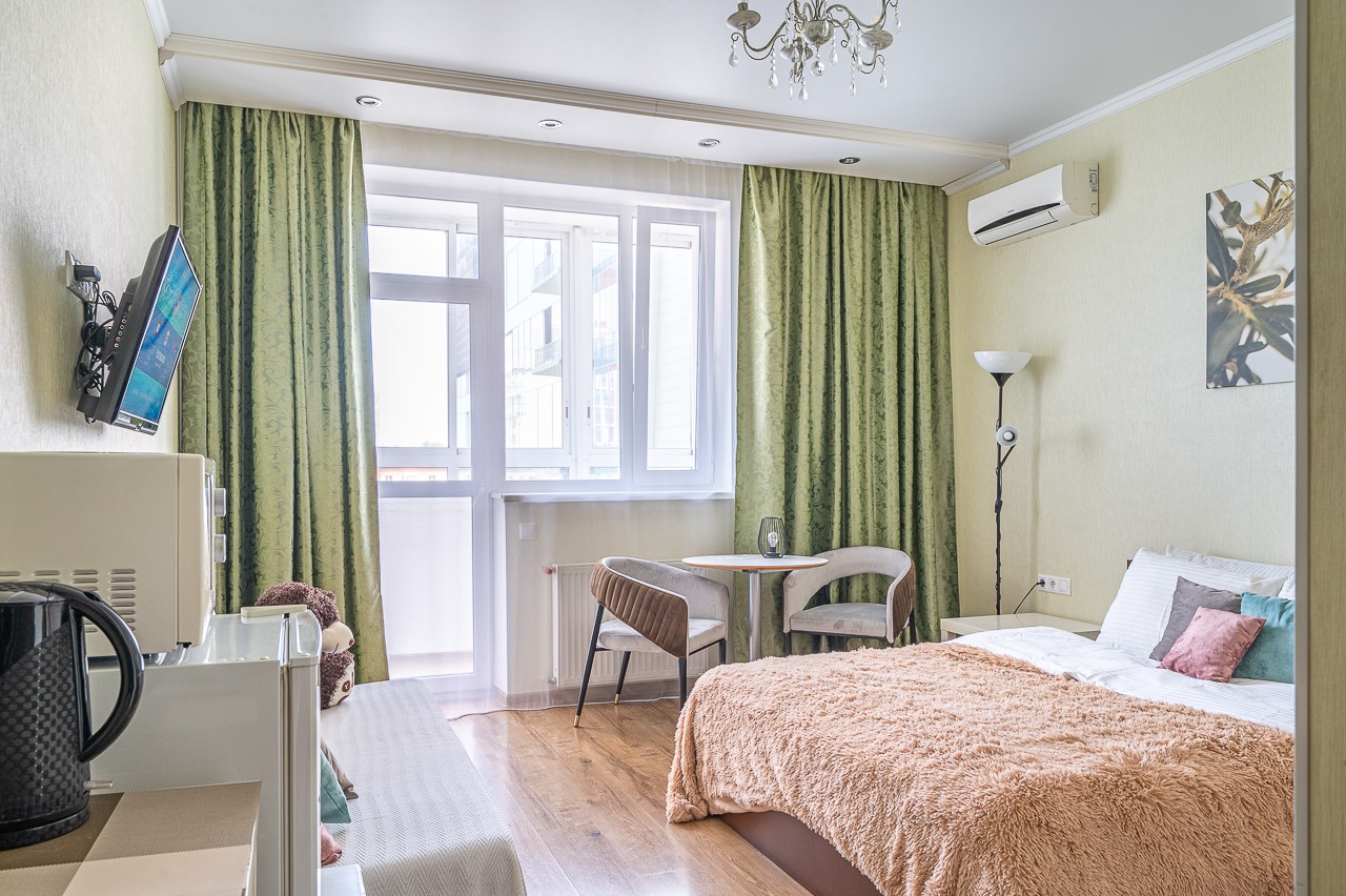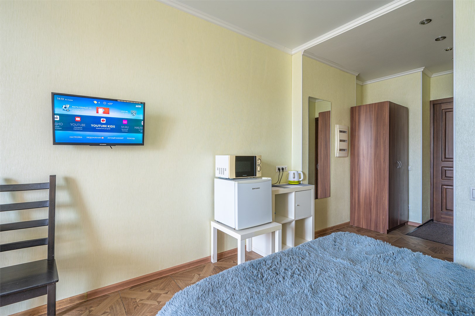 В номере: диван, зеркало, кровать двуспальная, прикроватные тумбочки, стол, стулья, шкаф, кондиционер, микроволновая печь, мини-холодильник, телевизор, чайник