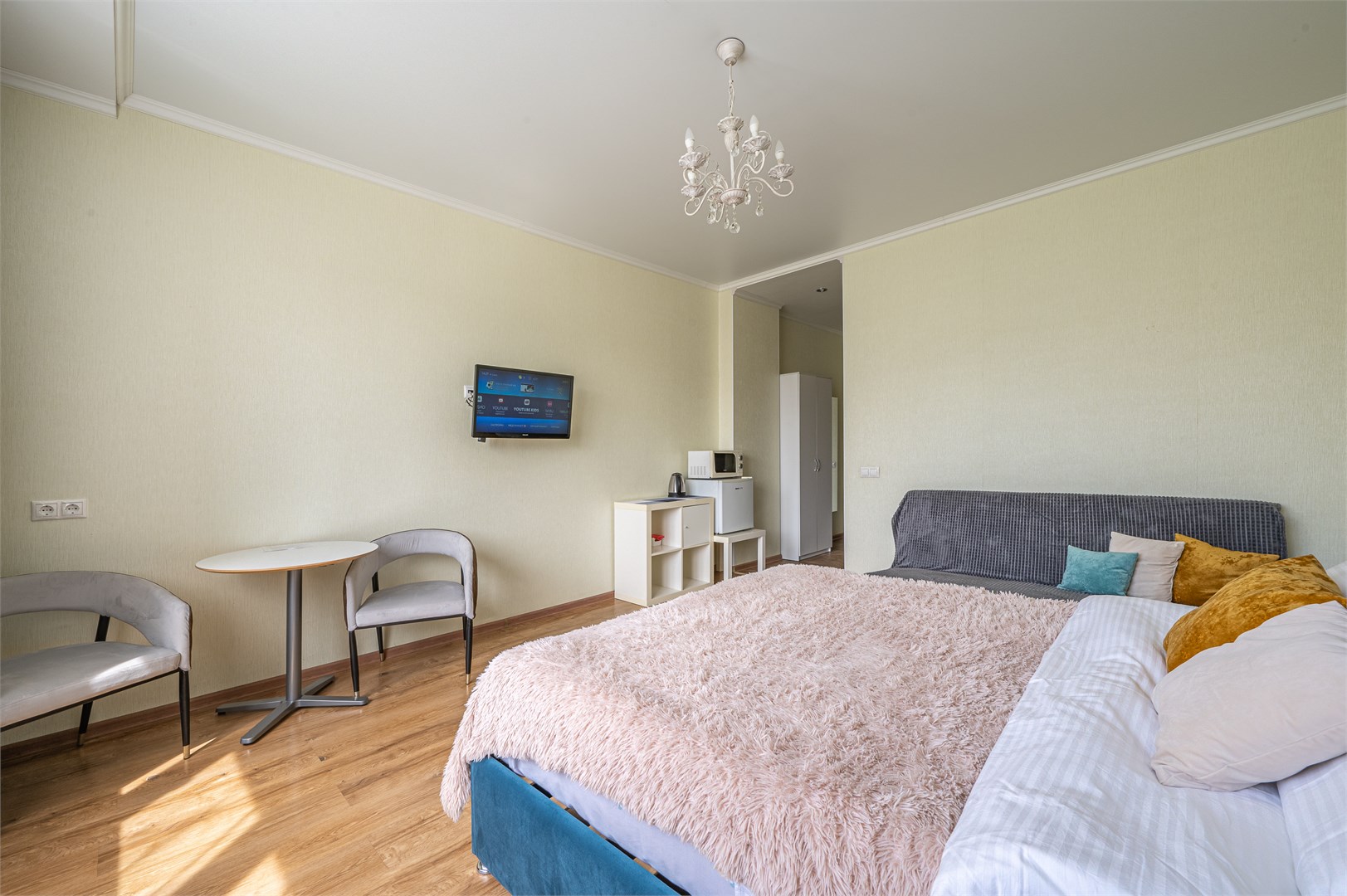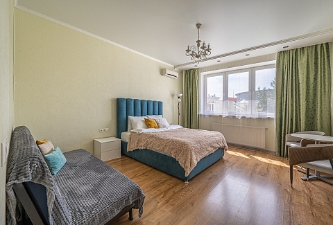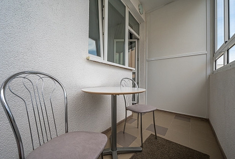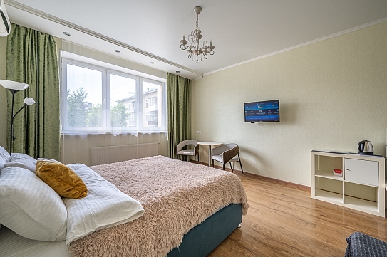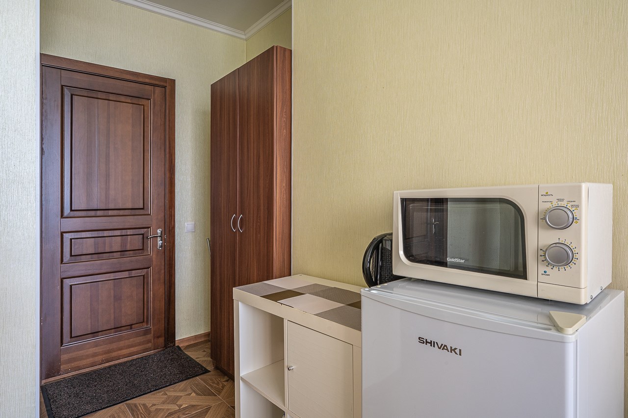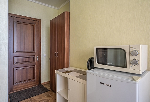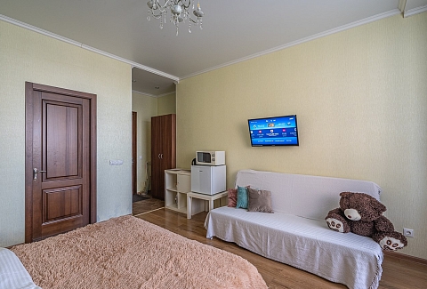В номере: вешалка, диван раскладной, зеркало, кровать двуспальная, прикроватные тумбочки, стол, стулья, шкаф, гладильная доска, микроволновая печь, мини-холодильник, стиральная машина, сушилка для белья, телевизор, электрочайник