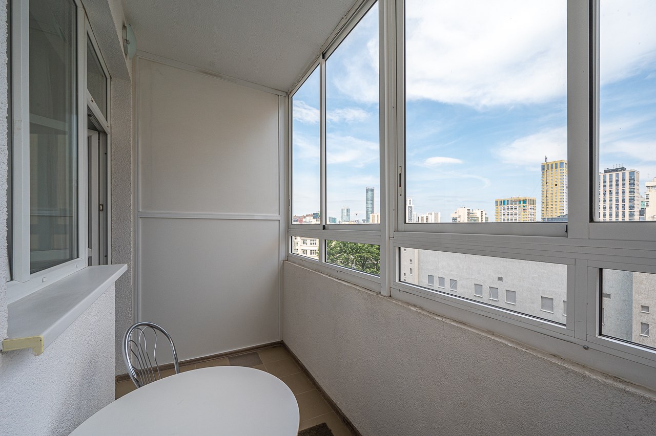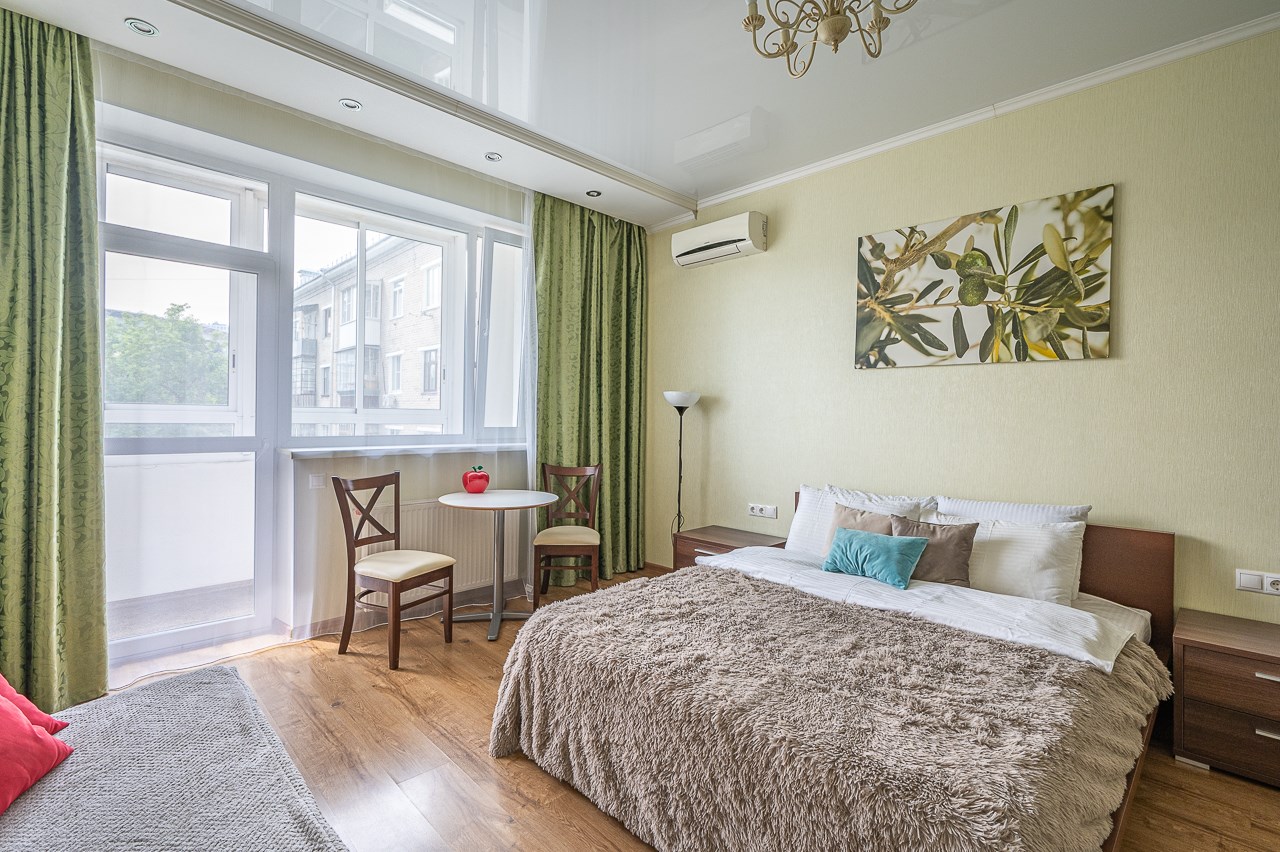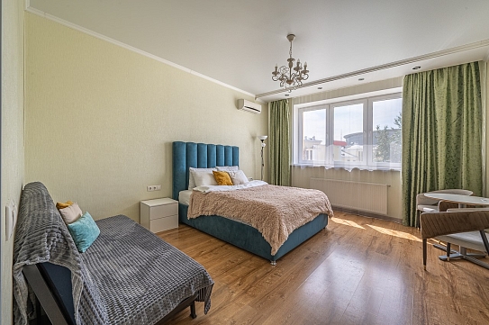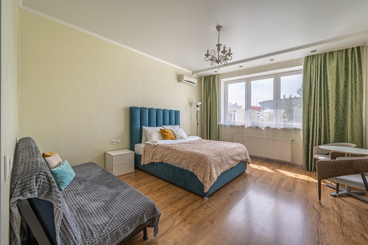 В номере: вешалка, диван раскладной, зеркало, кровать двуспальная, прикроватные тумбочки, стол, стулья, шкаф, гладильная доска, микроволновая печь, мини-холодильник, стиральная машина, сушилка для белья, телевизор, электрочайник