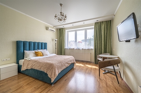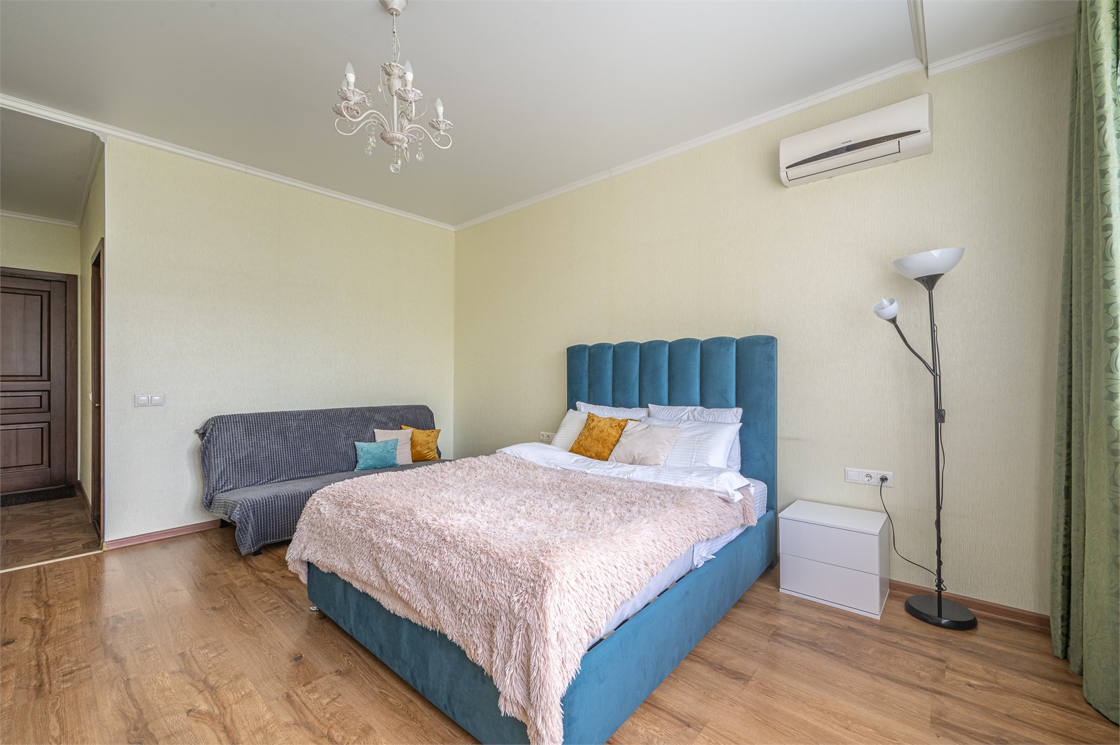 В номере: вешалка, диван раскладной, зеркало, кровать двуспальная, прикроватные тумбочки, стол, стулья, шкаф, гладильная доска, кондиционер, мини-холодильник, стиральная машина, сушилка для белья, телевизор, утюг, электрочайник