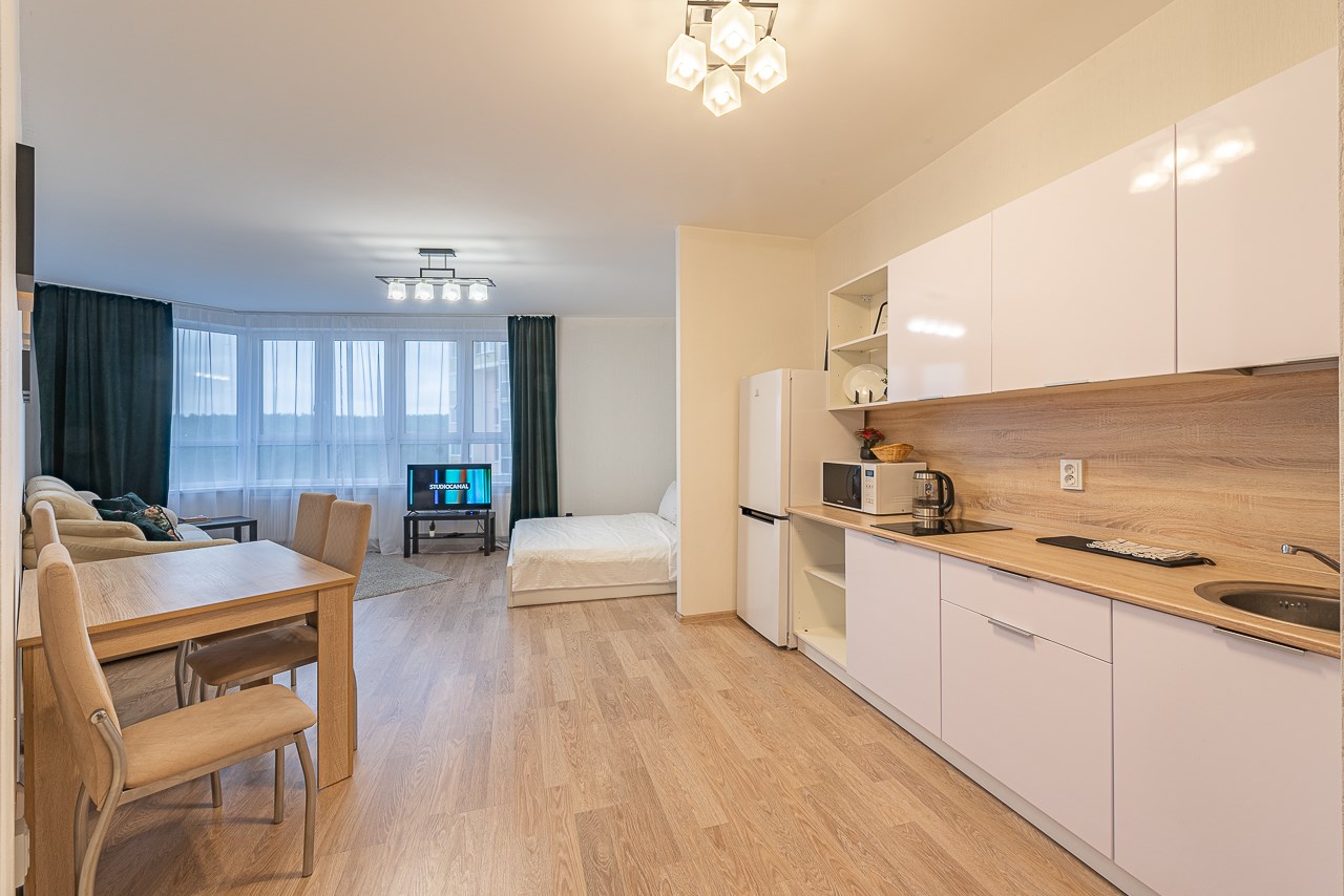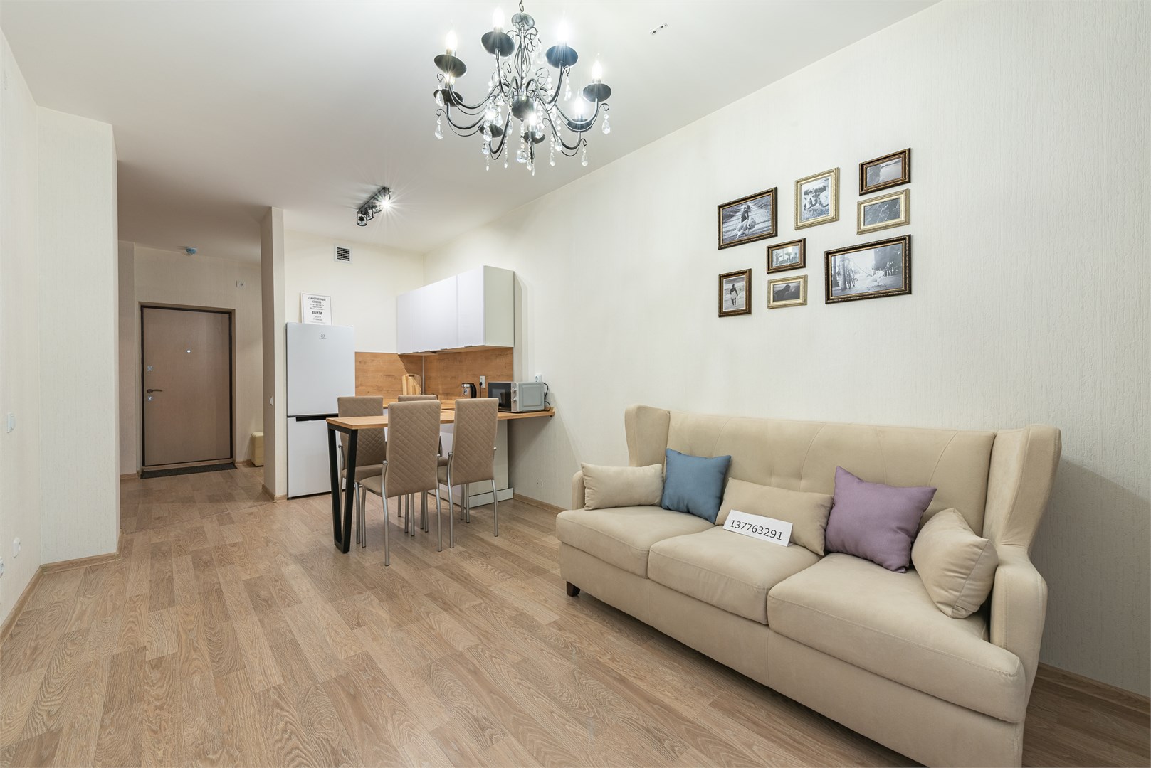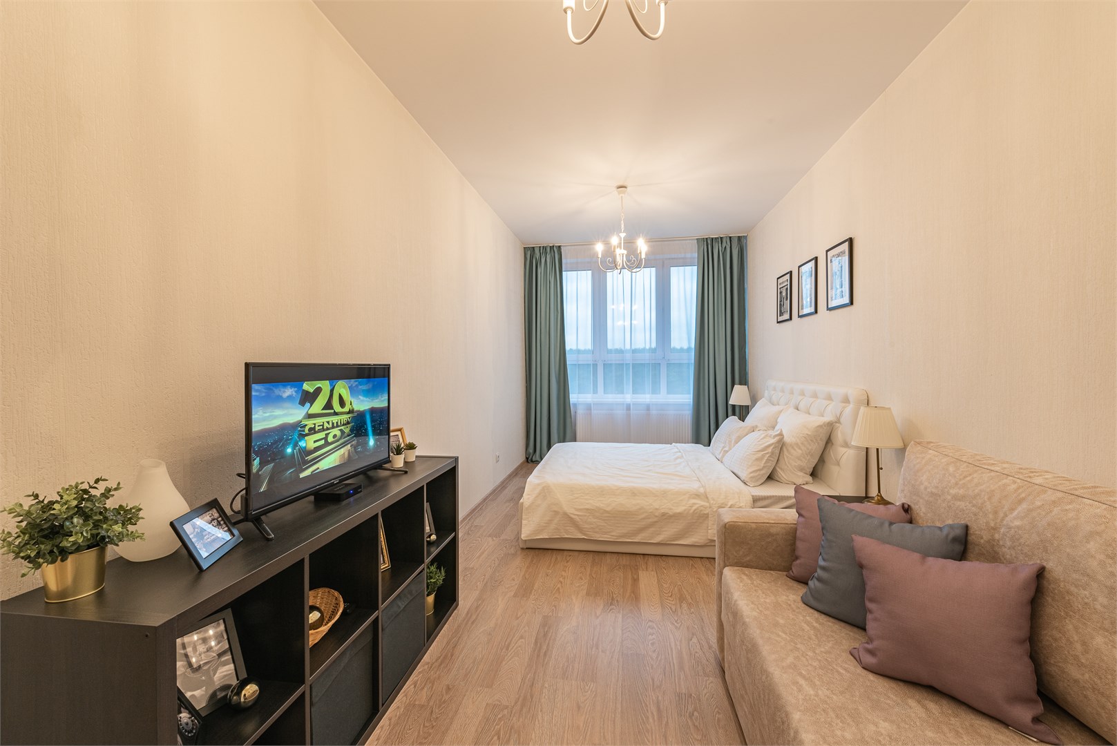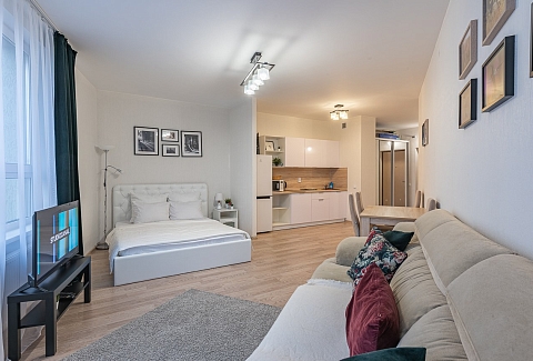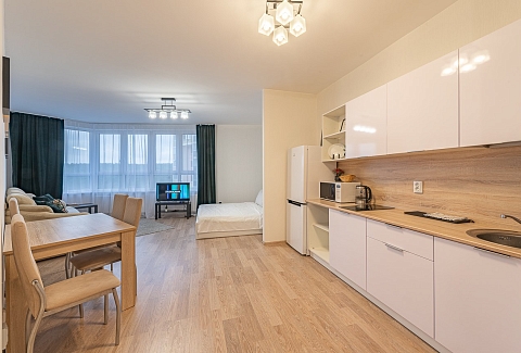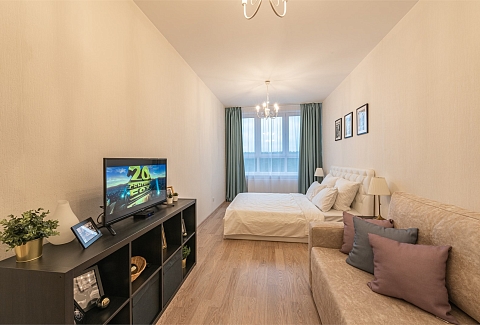 В номере: диван, кровать двуспальная, прикроватный столик, стол, стулья, шкаф, микроволновая печь, мини-холодильник, стиральная машина, телевизор, холодильник, чайник