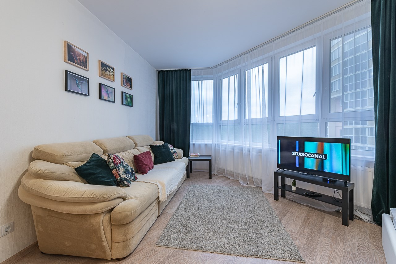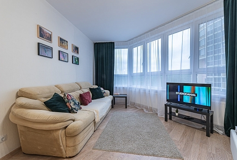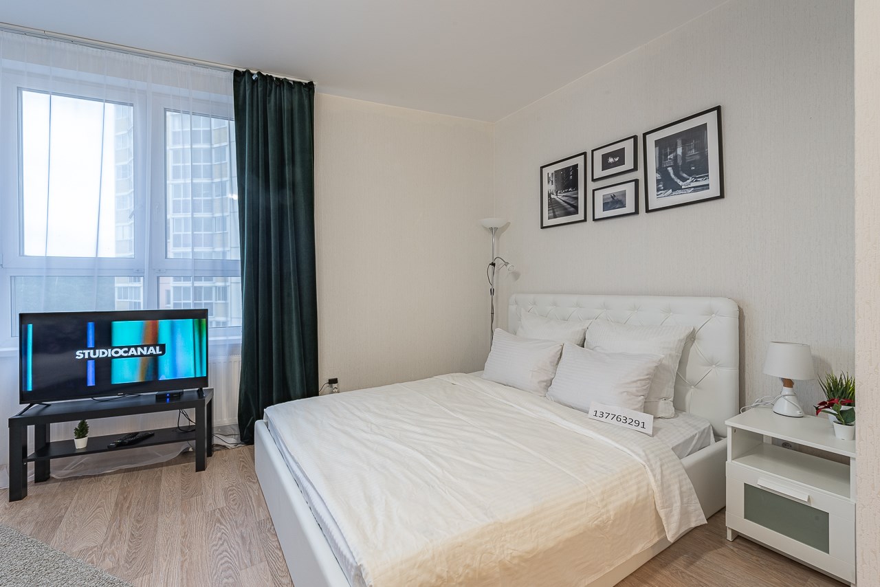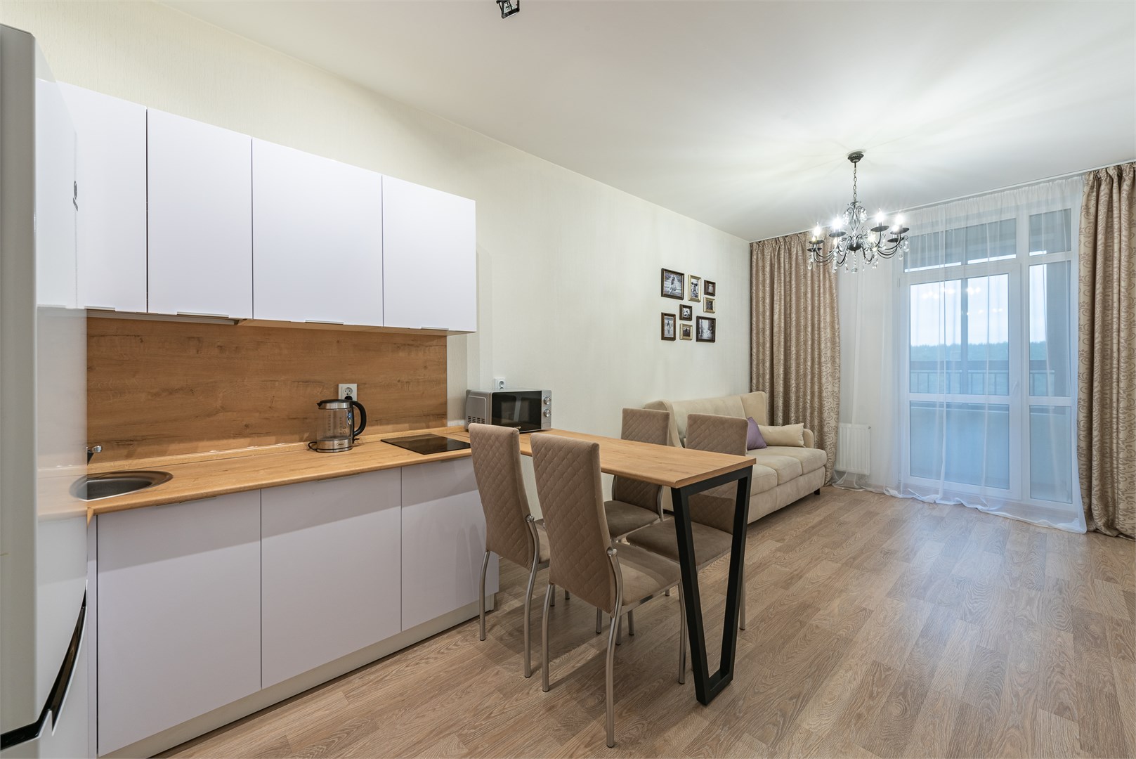 В номере: диван, кровать двуспальная, прикроватный столик, стол, стулья, шкаф, микроволновая печь, мини-холодильник, стиральная машина, телевизор, холодильник, чайник