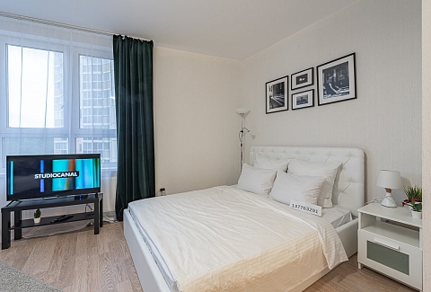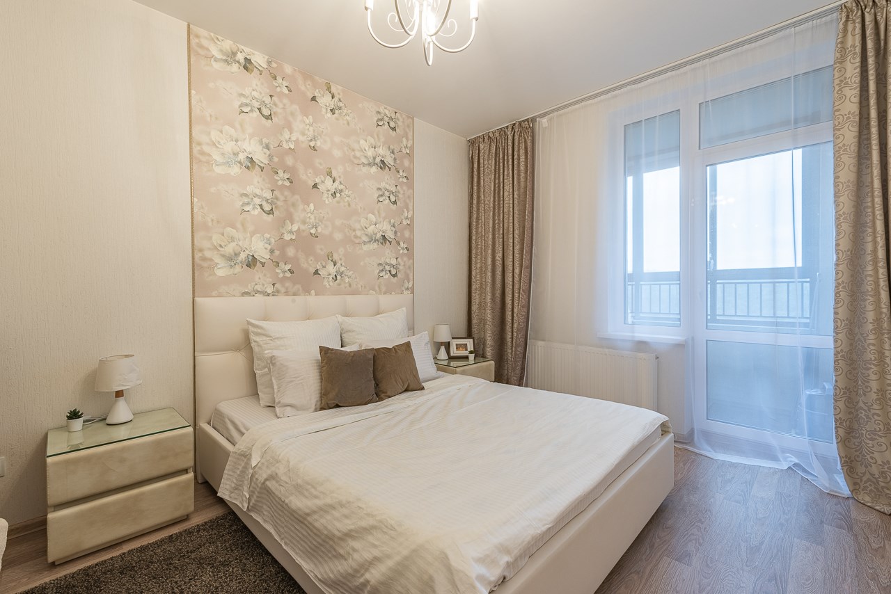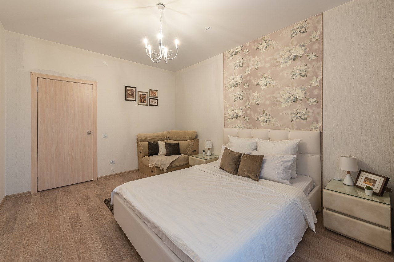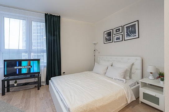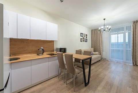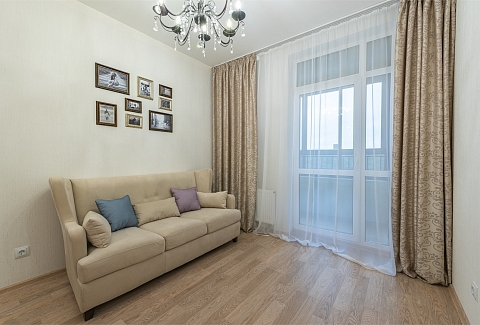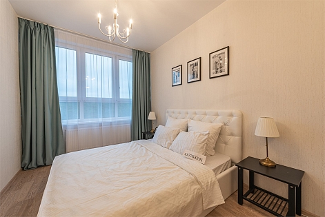 В номере: диван раскладной, зеркало, кровать двуспальная, прикроватные тумбочки, стол, стулья, шкаф, микроволновая печь, набор посуды, плита электрическая, стиральная машина, телевизор, телефон, холодильник, чайник