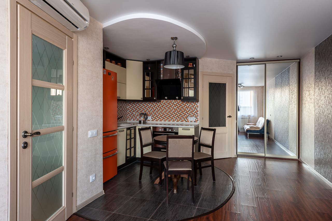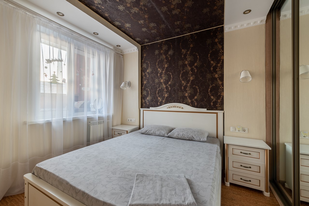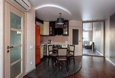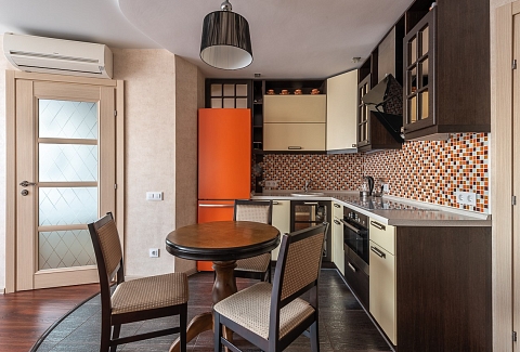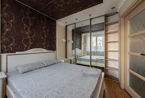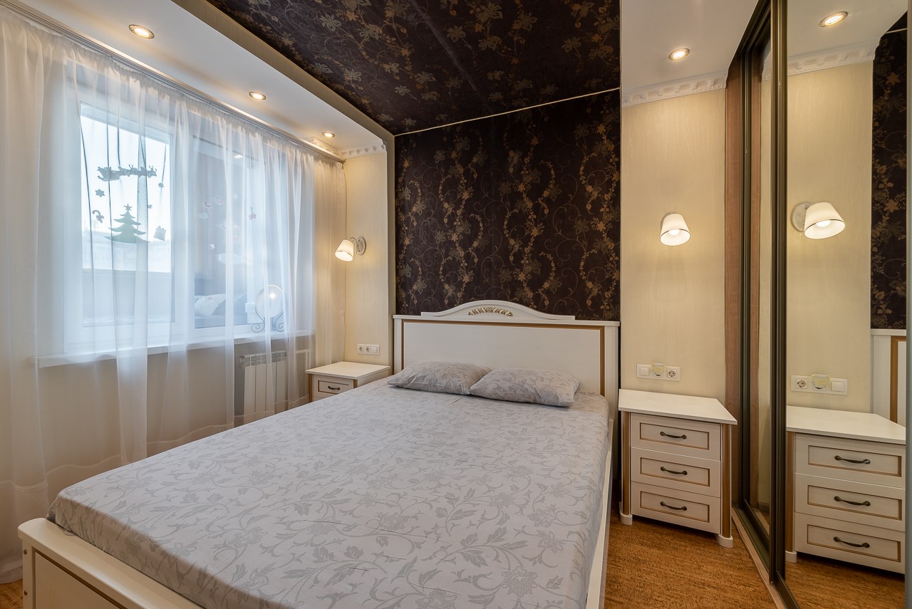 В номере: диван раскладной, зеркало, кровать двуспальная, прикроватные тумбочки, стол, стулья, шкаф, гладильная доска, микроволновая печь, набор посуды, плита электрическая, посудомоечная машина, стиральная машина, телевизор, утюг, холодильник