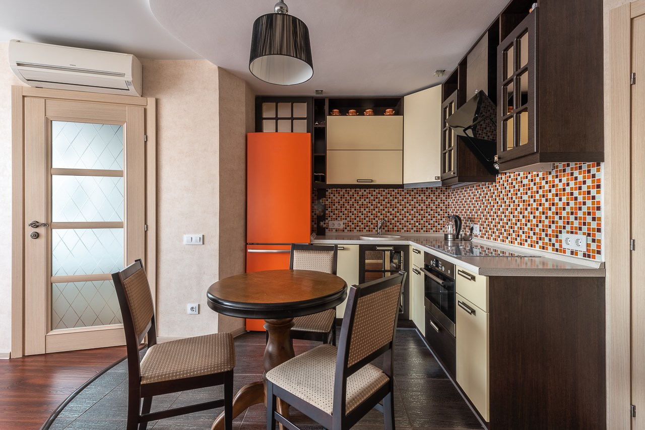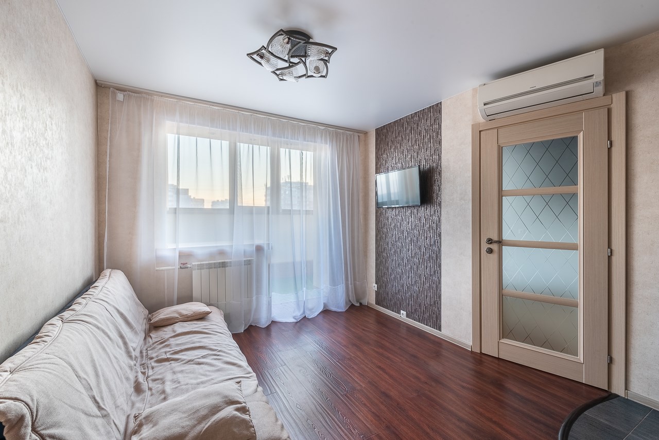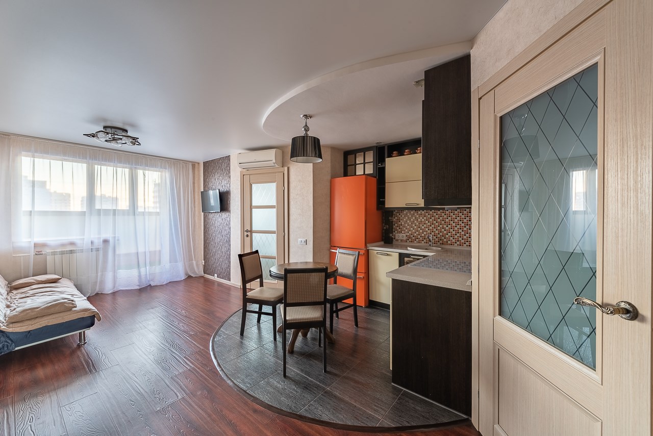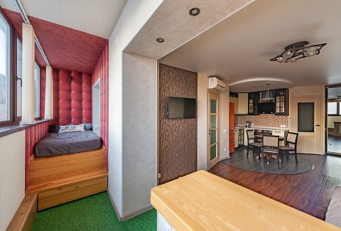 В номере: диван раскладной, зеркало, кровать двуспальная, прикроватные тумбочки, стол, стулья, шкаф, гладильная доска, микроволновая печь, набор посуды, плита электрическая, посудомоечная машина, стиральная машина, телевизор, утюг, холодильник