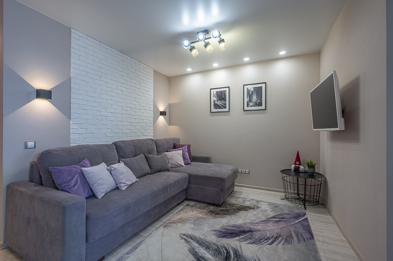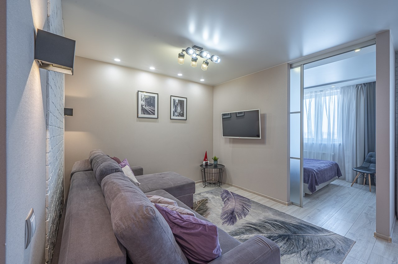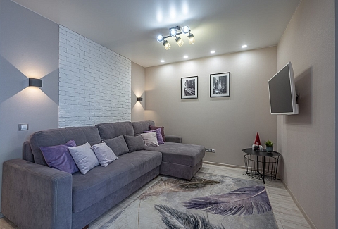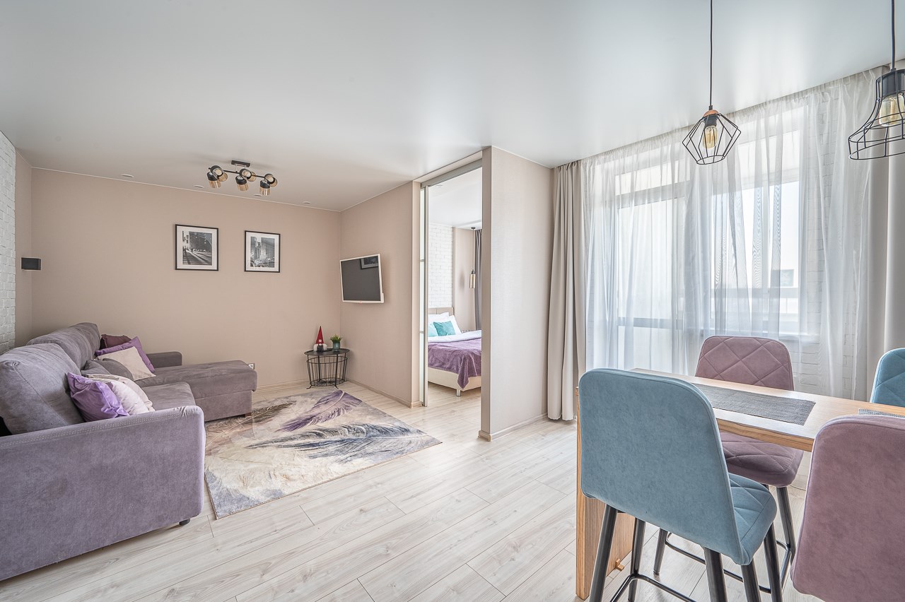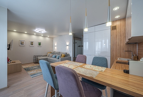В номере: диван раскладной, кровать двуспальная, прикроватные тумбочки, стол, стулья, шкаф, кондиционер, микроволновая печь, набор посуды, плита электрическая, стиральная машина, телевизор, холодильник, чайник