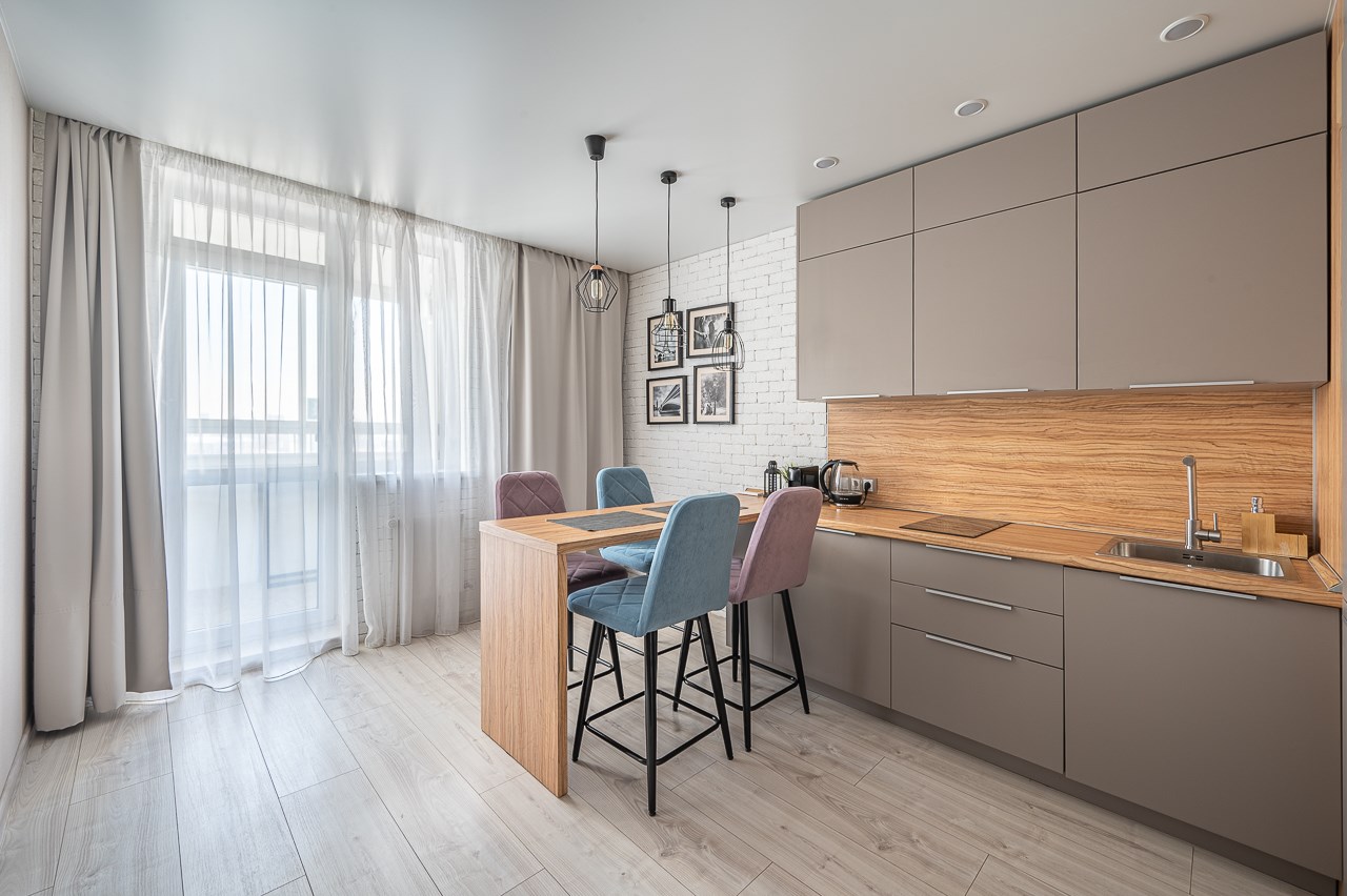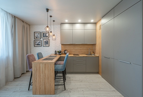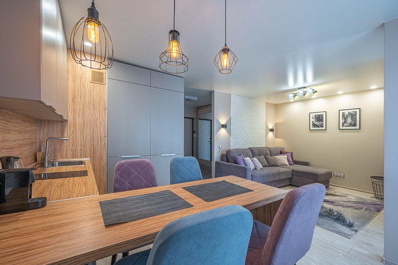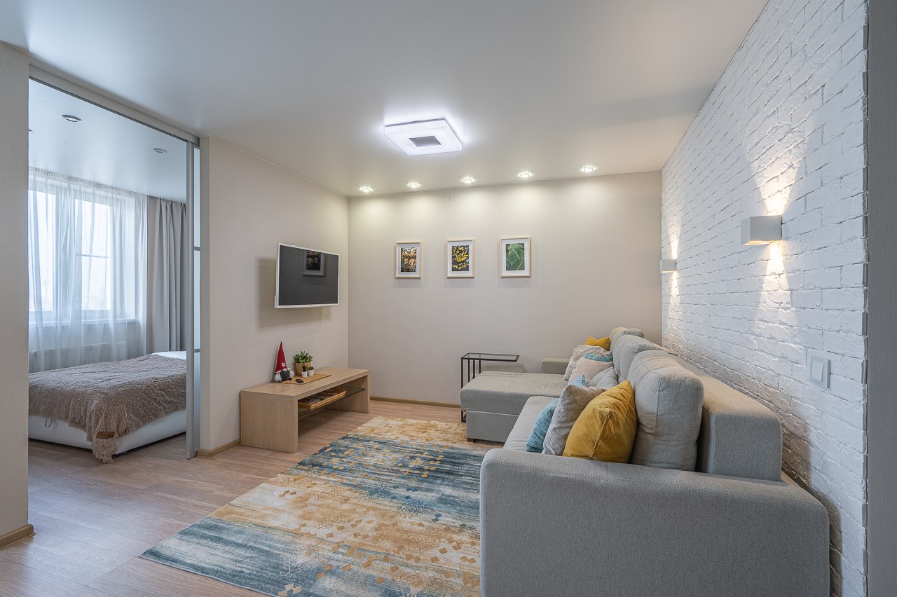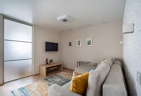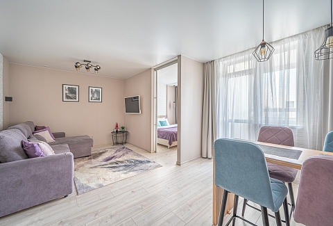 В номере: диван раскладной, кровать двуспальная, прикроватные тумбочки, стол, стулья, шкаф, кондиционер, микроволновая печь, набор посуды, плита электрическая, стиральная машина, телевизор, холодильник, чайник