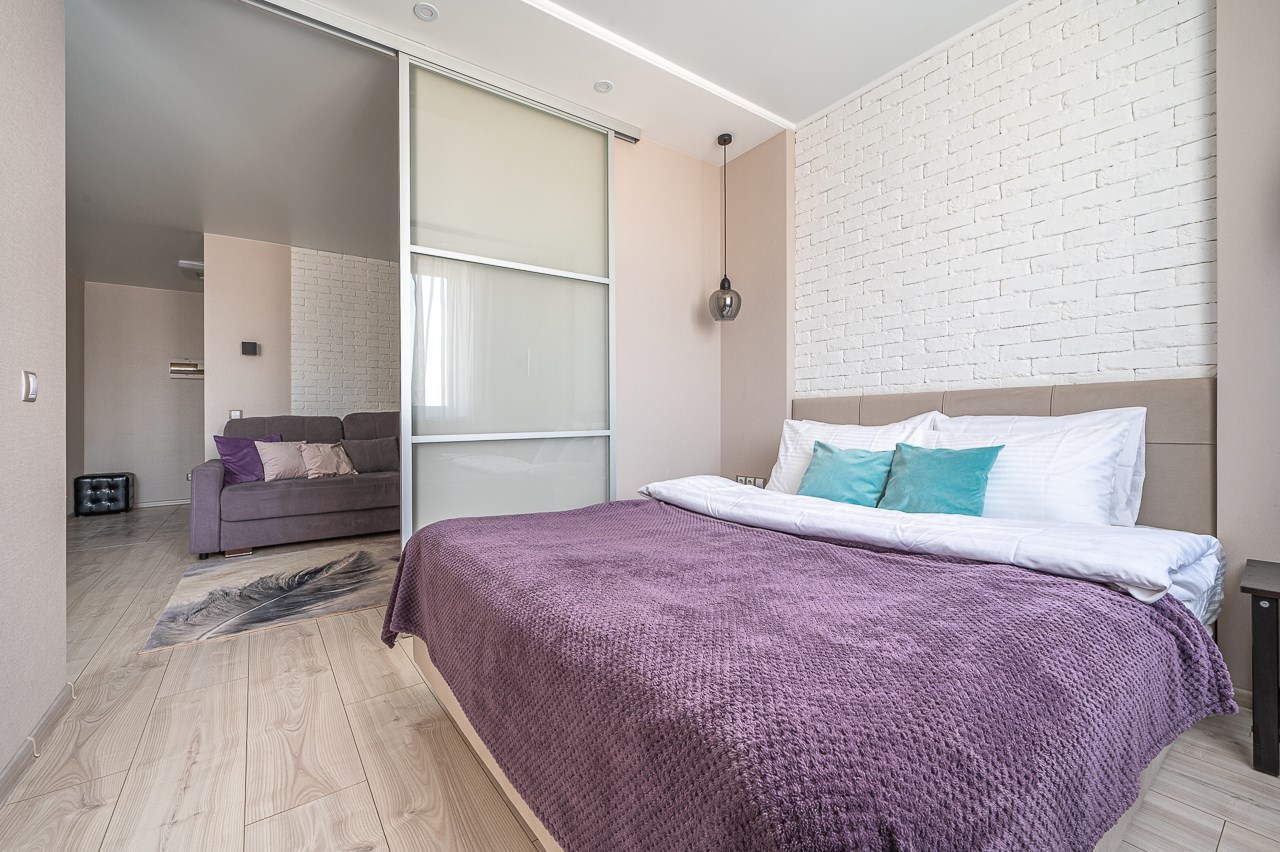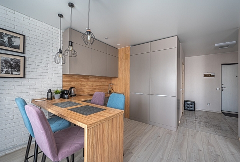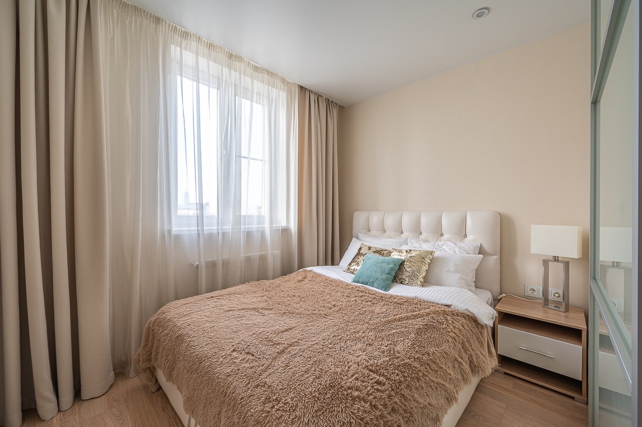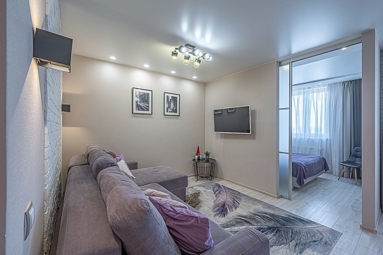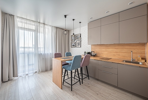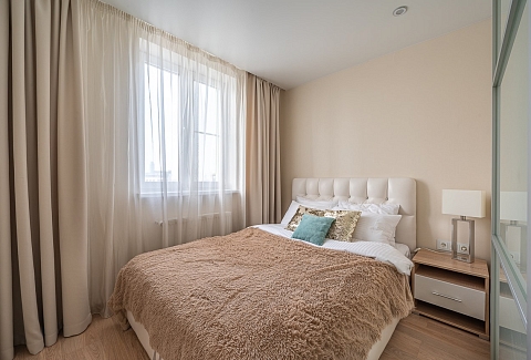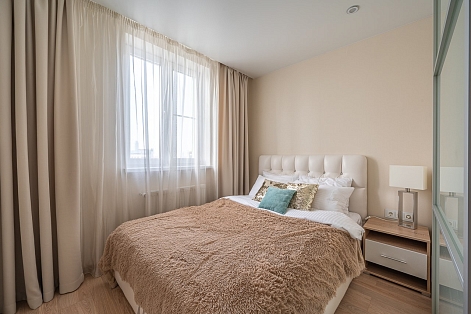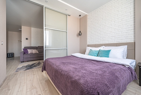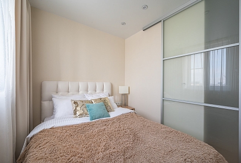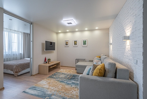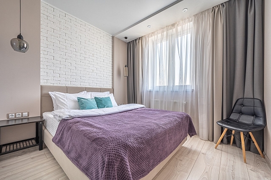 В номере: диван раскладной, зеркало, кровать двуспальная, прикроватные тумбочки, стол, стулья, шкаф, кондиционер, микроволновая печь, набор посуды, плита электрическая, стиральная машина, телевизор, холодильник, чайник