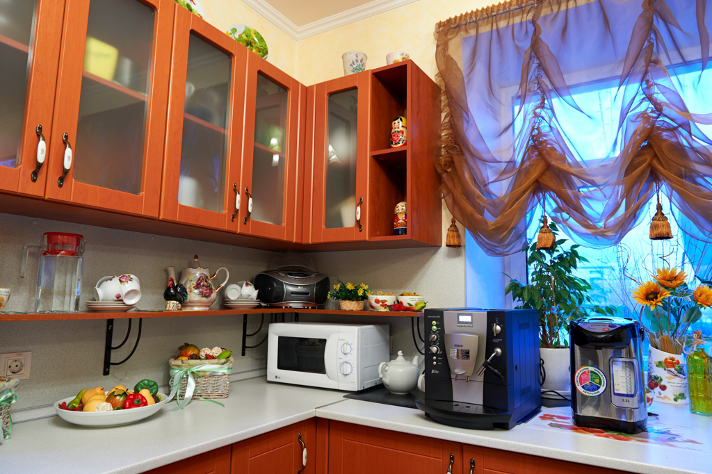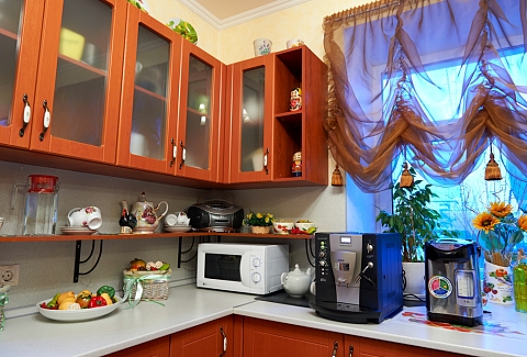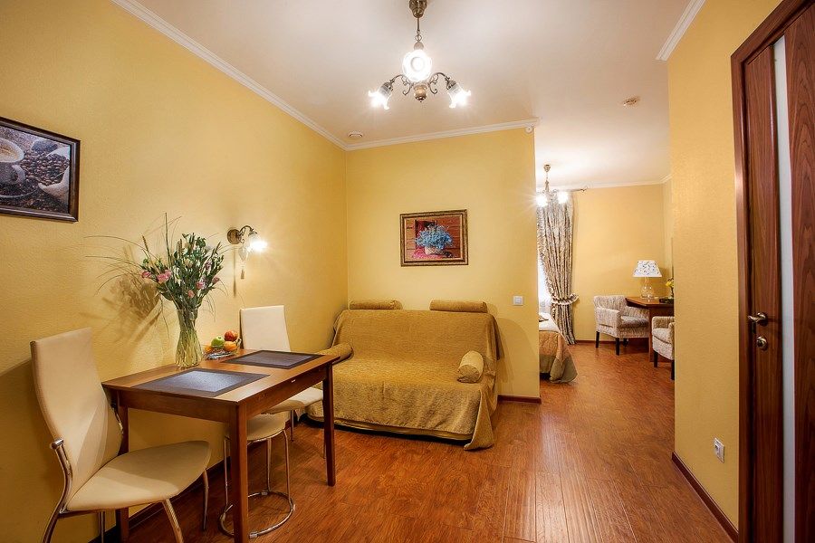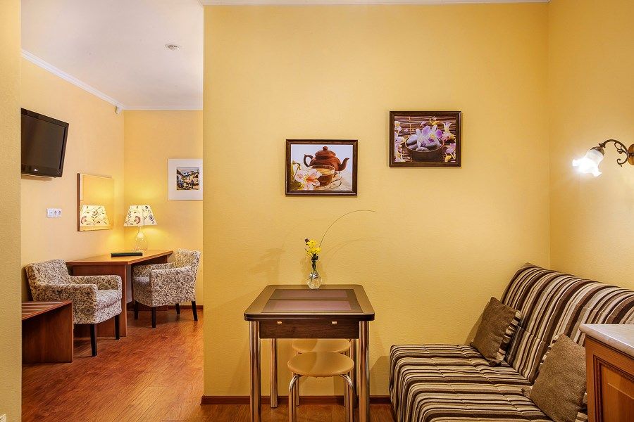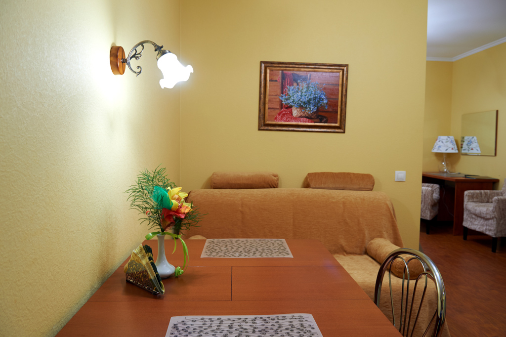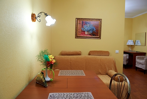 В номере: вешалка, диван, зеркало, кресла, кровать двуспальная, прикроватные тумбочки, стол, стулья, шкаф, микроволновая печь, набор посуды, телевизор, холодильник, чайный набор посуды, электрочайник